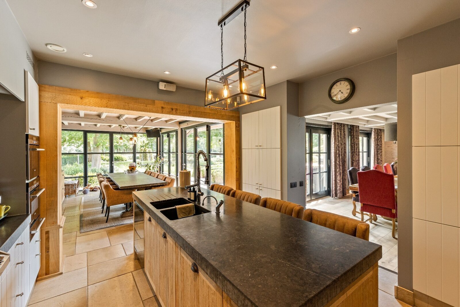 De prachtige landelijke keuken is voorzien in al haar faciliteiten en uitgerust met een stijlvol keukeneiland met zitplaatsen, perfect voor gezellige ontbijtjes of een glaasje wijn tijdens het koken.