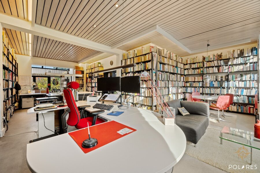 Op de eerste verdieping bevinden zich een slaapkamer en een grote bureauruimte die gemakkelijk kan worden getransformeerd in meerdere slaapkamers. Ze kan ook worden gebruikt voor de uitoefening van een vrij beroep, als extra leefruimte of als hobbyruimte. De aansluitende wintertuin biedt toegang tot een balkon. Deze verdieping biedt tal van mogelijkheden voor wie thuis wil werken of gasten wil ontvangen.