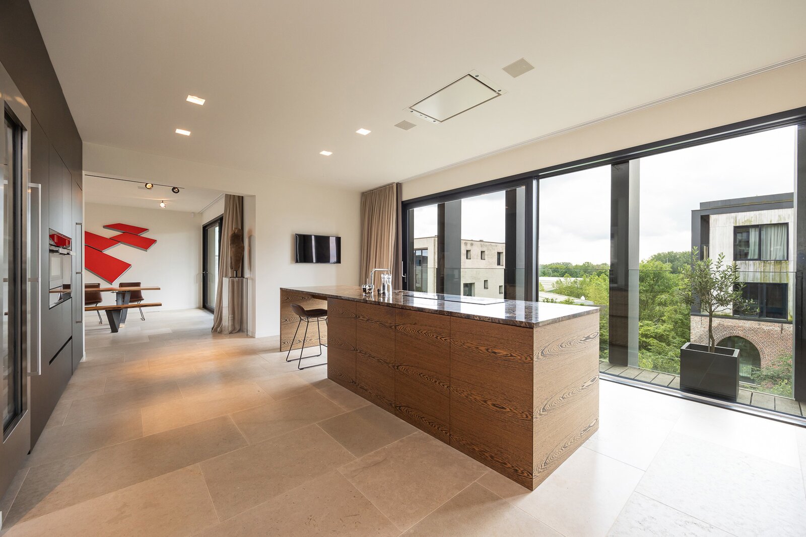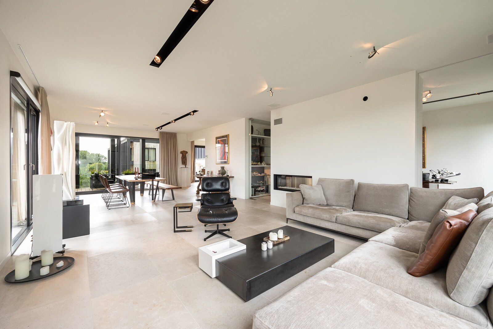 Zeer lichte woonkamer op tegel met gashaard. Via grote schuifraam toegang tot het gezellige terras van 56m² op Afrikaans hardhout.