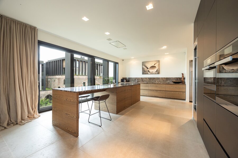 Hoogwaardig afgewerkte keuken met kookeiland en werkbladen in natuursteen “Emperador” voorzien van inductie kookplaat, koelkast, vaatwasser, stoomoven, combi-oven, hetelucht oven, bordenwarmer.