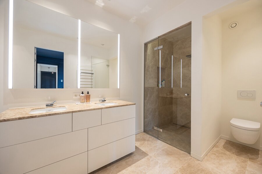 2de slaapkamer met ensuite badkamer met inloopdouche, dubbel lavabomeubel en toilet.