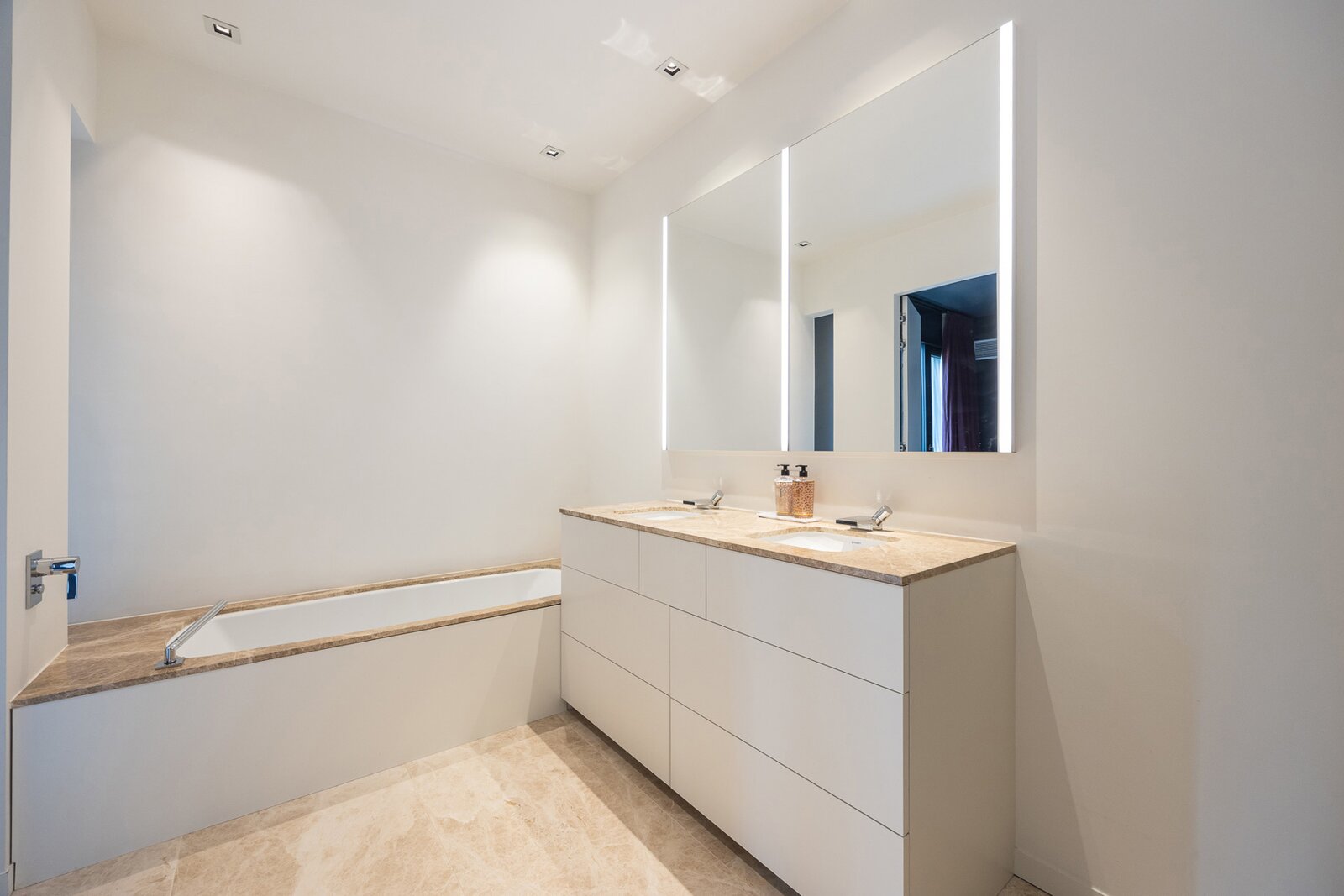 Hoofdslaapkamer op parket met ensuite badkamer met ligbad, inloopdouche, dubbel lavabomeubel en toilet.