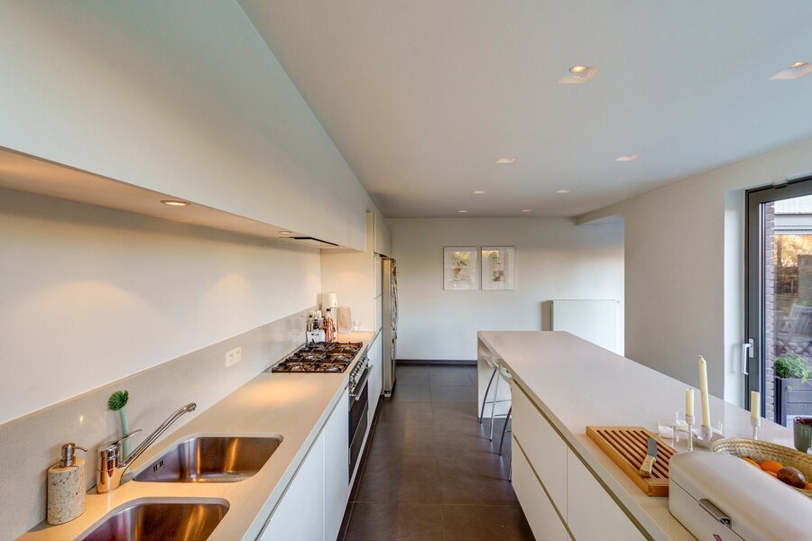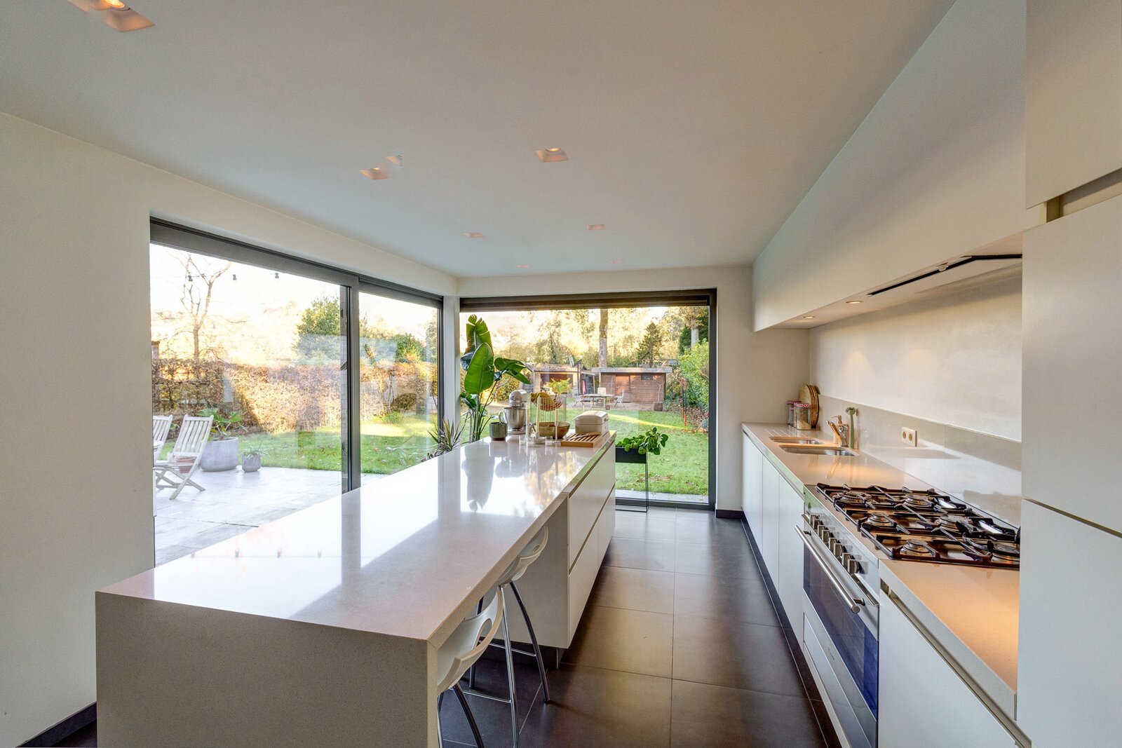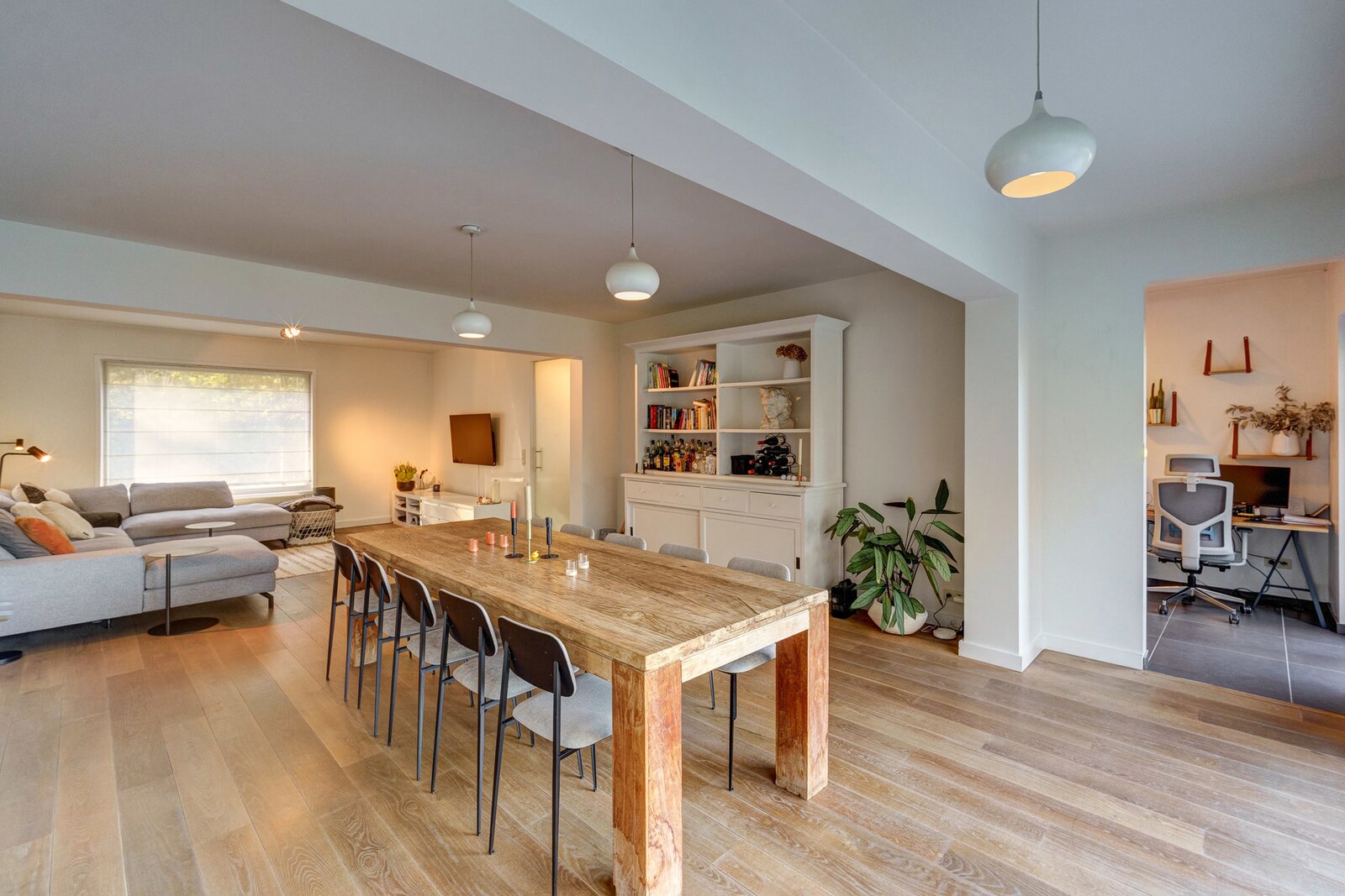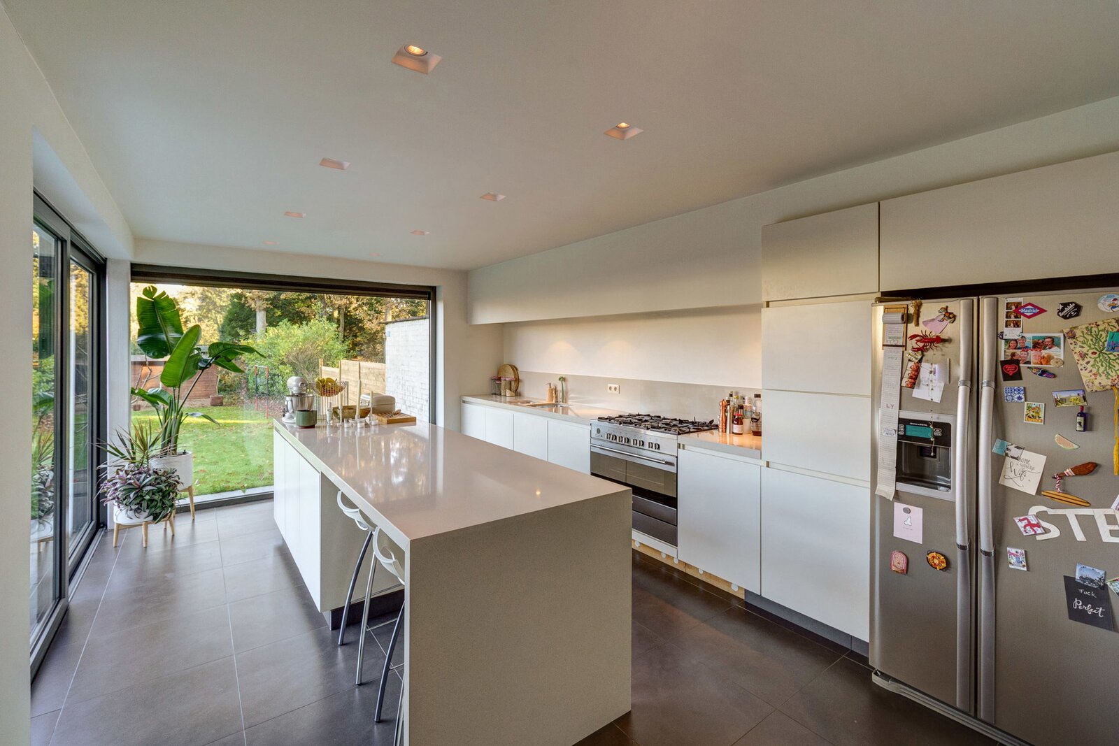 Ruime inkomhal met gastentoilet, inmaakkast en toegang tot de droge kelder. De ruime leefruimte met zithoek en eetkamer op parketvloer is voorzien van een mooie hoeveelheid lichtinval vanwege de vele ramen en open indeling. Op elk moment kan u genieten van de prachtige tuin rondom de woning. Aan de achterzijde werd een bureauruimte voorzien, ideaal voor thuiswerk. De keuken met grote raampartijen en tuinzicht is het hart van deze woning en werd voorzien van alle nodige toestellen en een ontbijthoek.