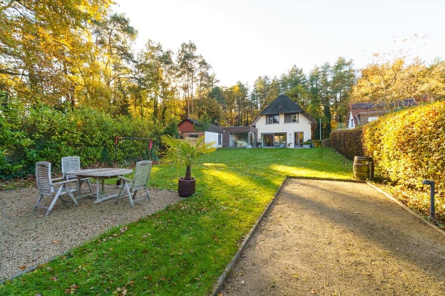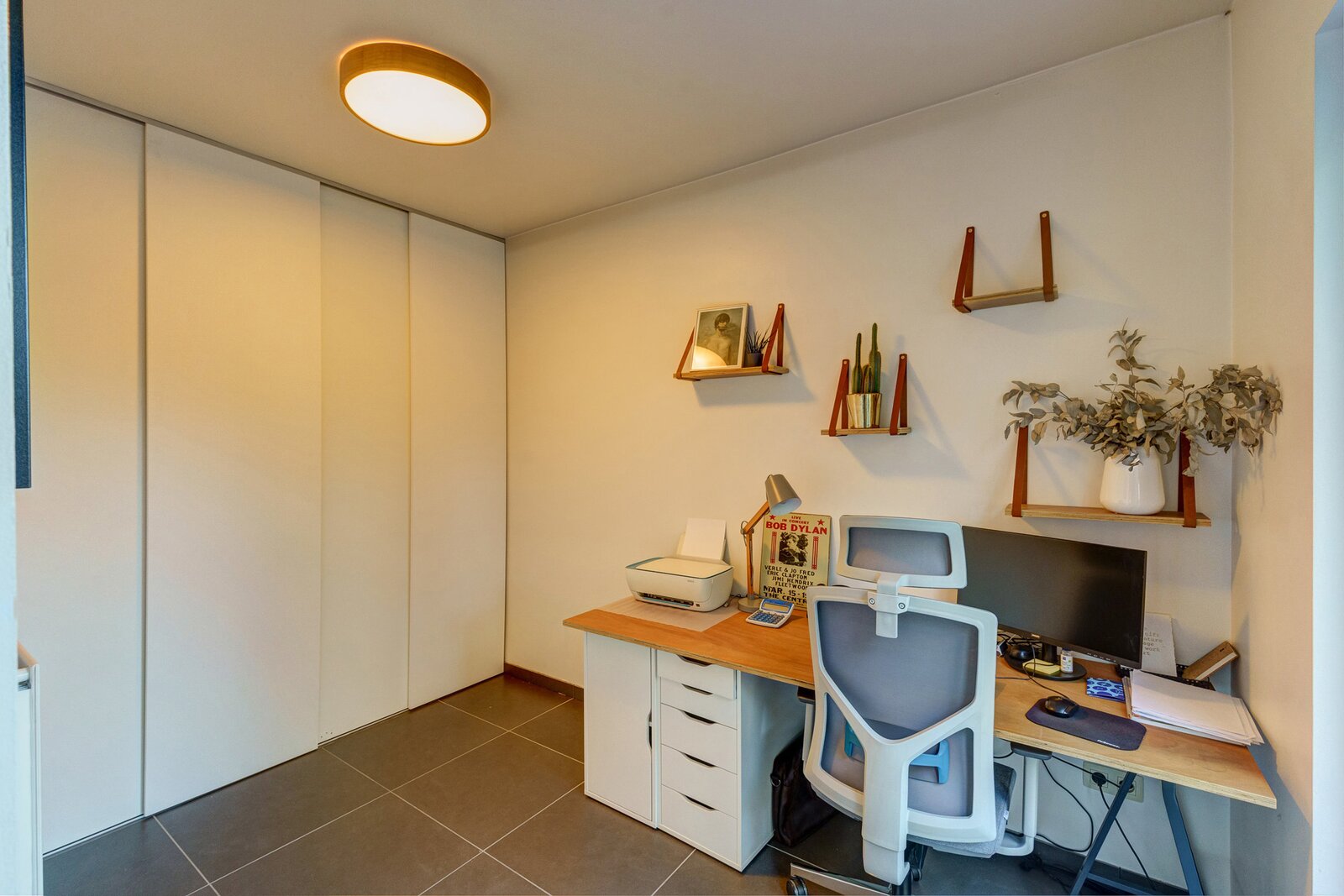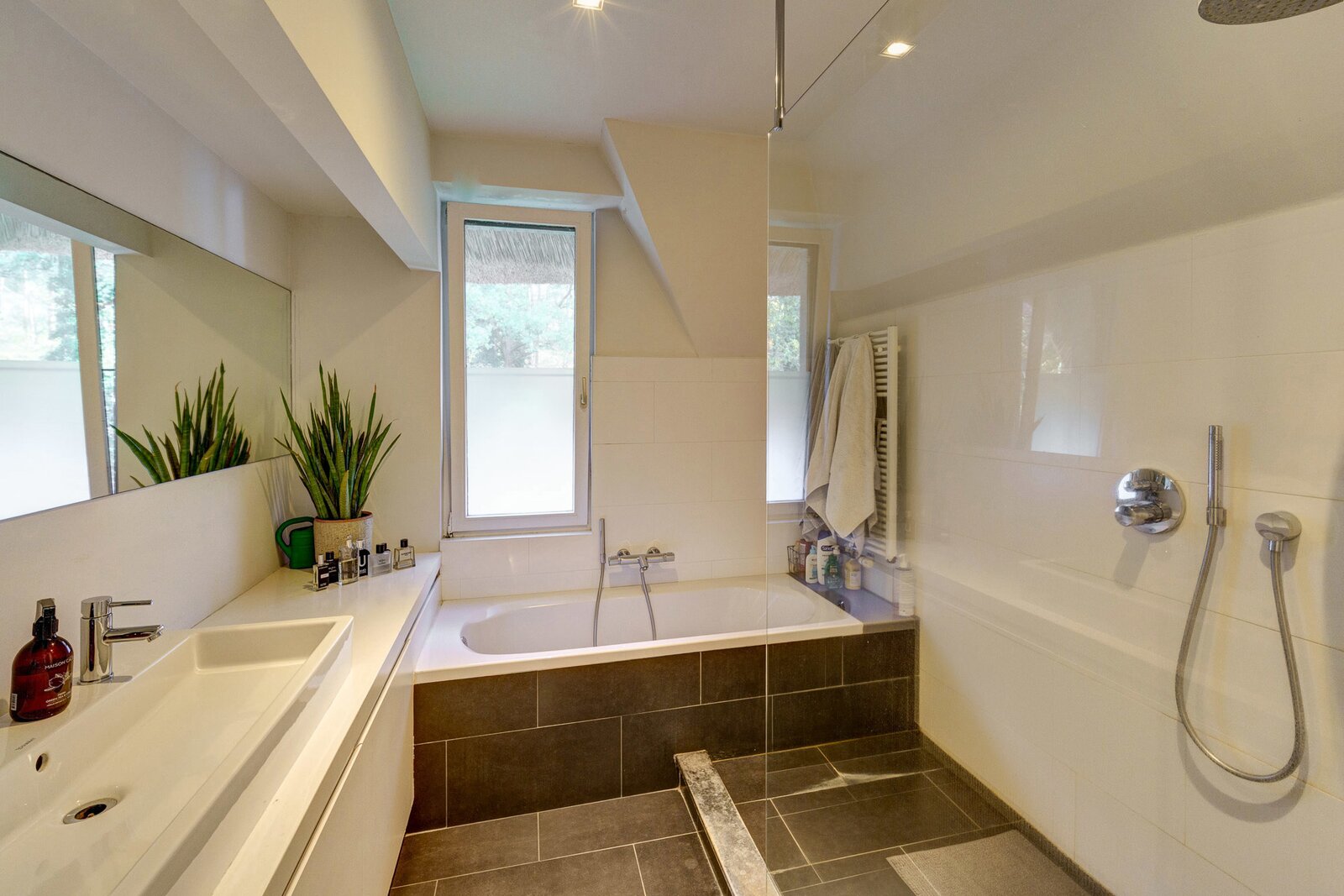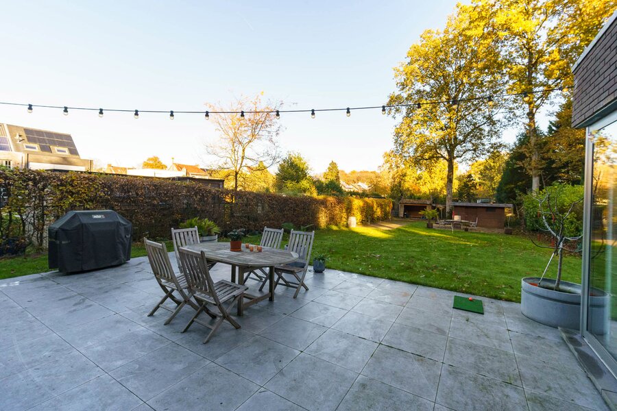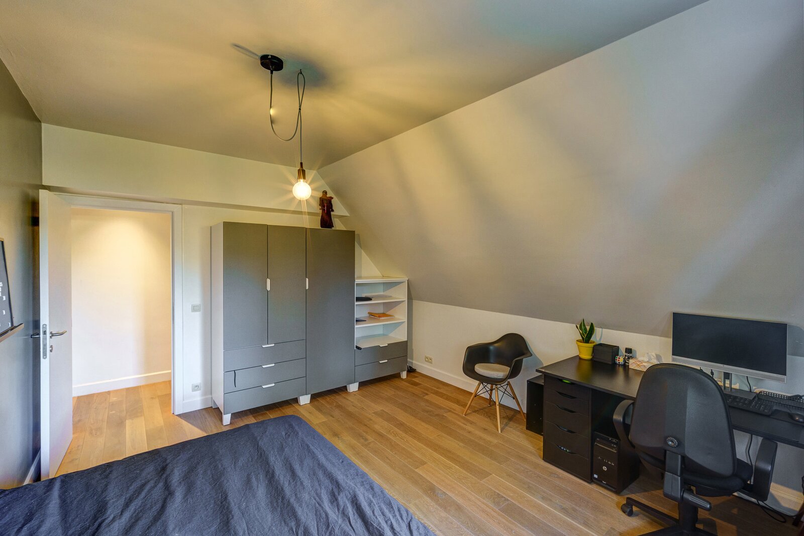 Ruime inkomhal met gastentoilet, inmaakkast en toegang tot de droge kelder. De ruime leefruimte met zithoek en eetkamer op parketvloer is voorzien van een mooie hoeveelheid lichtinval vanwege de vele ramen en open indeling. Op elk moment kan u genieten van de prachtige tuin rondom de woning. Aan de achterzijde werd een bureauruimte voorzien, ideaal voor thuiswerk. De keuken met grote raampartijen en tuinzicht is het hart van deze woning en werd voorzien van alle nodige toestellen en een ontbijthoek.