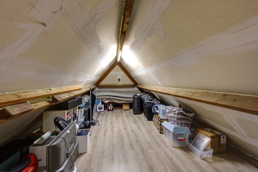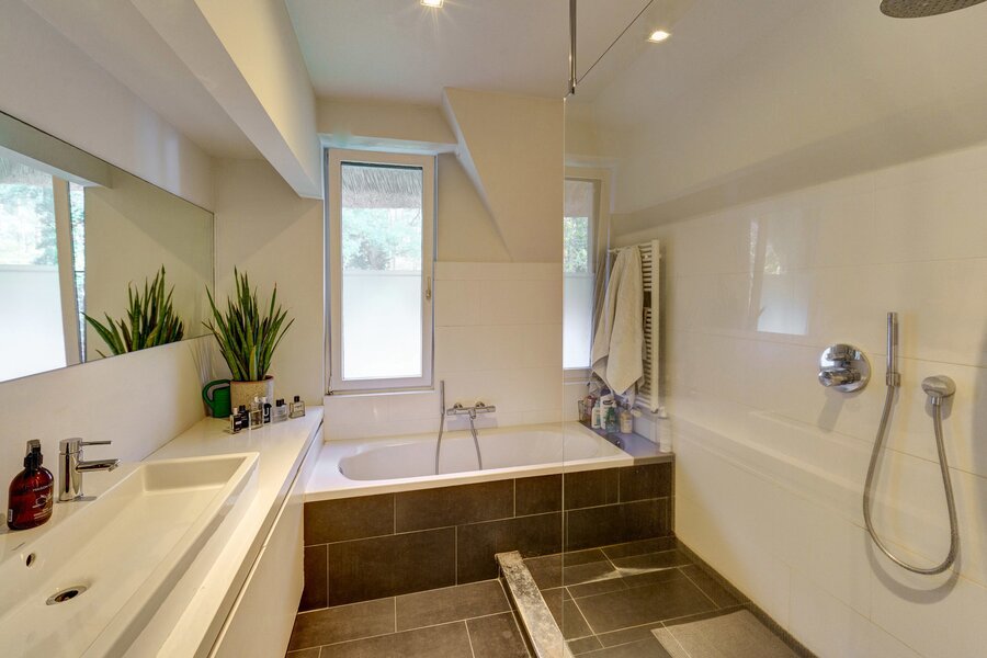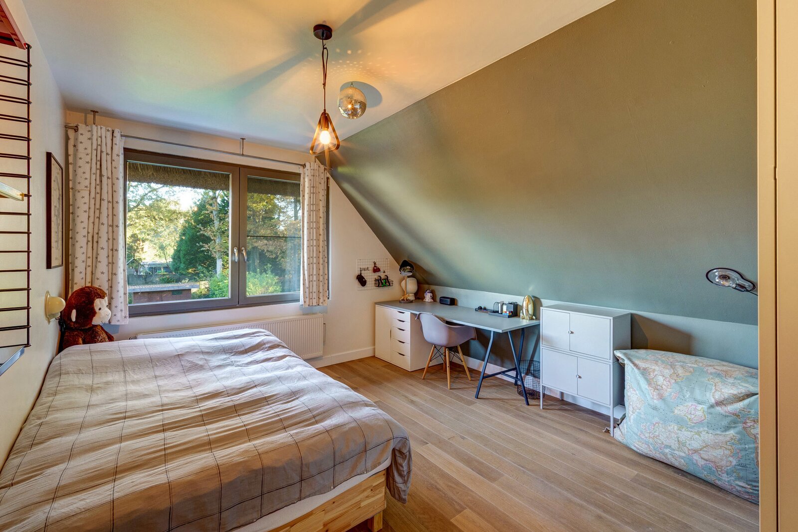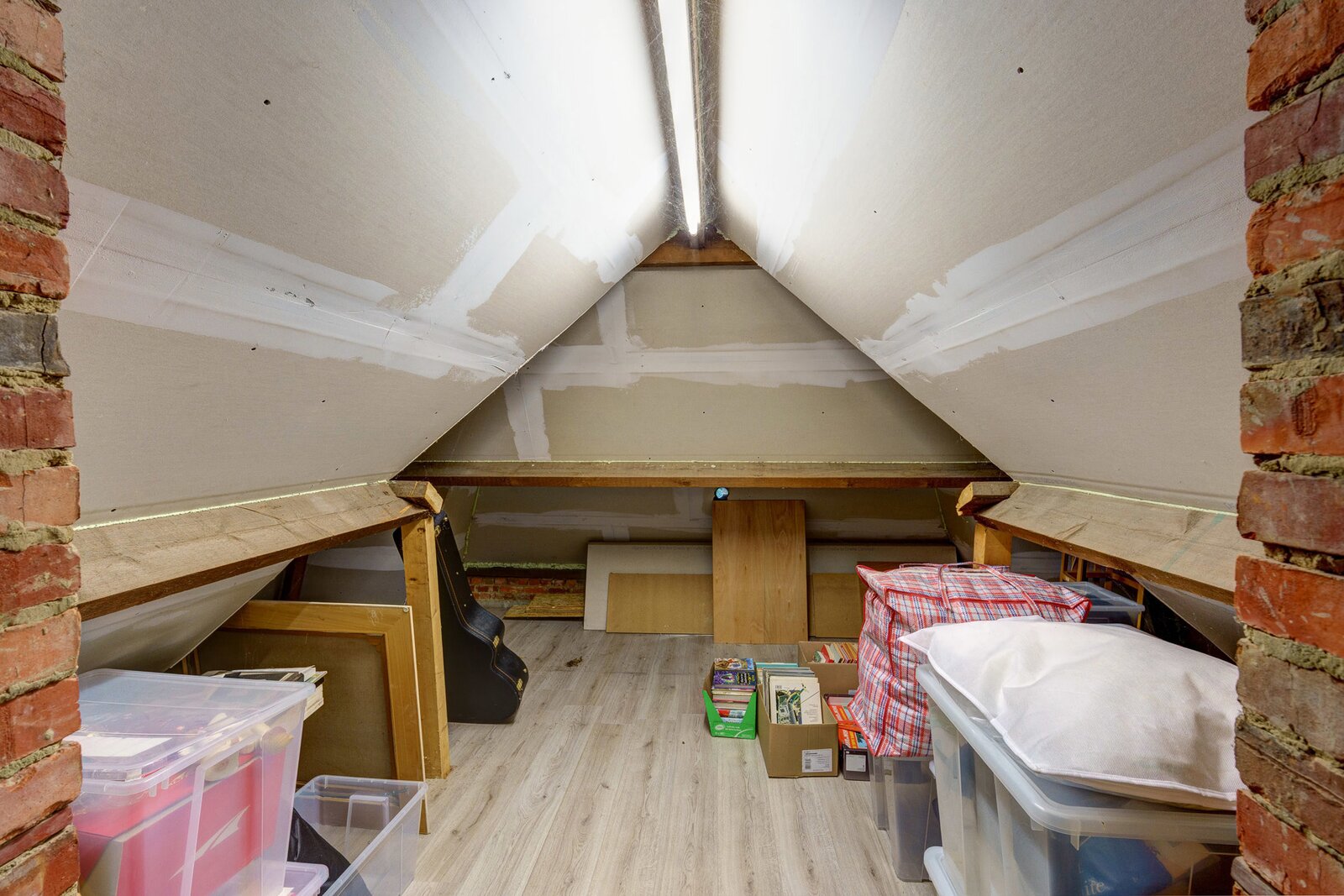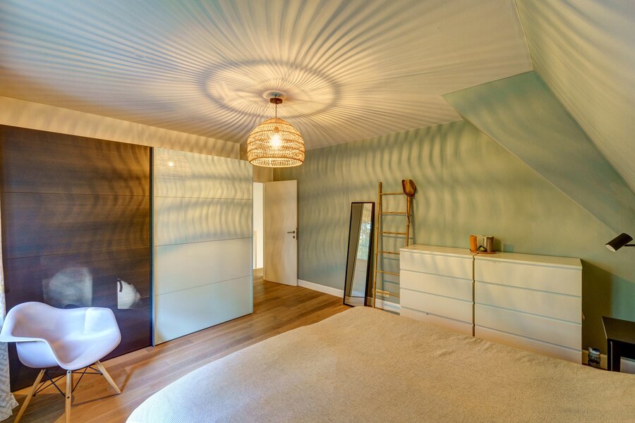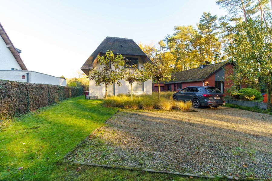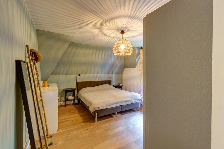 De luxe afwerking merkt u ook op de verdieping met parketvloer. De indeling bestaat uit drie slaapkamers waarvan een masterbedroom en twee identieke slaapkamers. Verder is er een badkamer voorzien met wastafel, inloopdouche en bad. In de nachthal heeft u toegang tot het toilet en de ruime geïsoleerde zolder, ideaal voor stockage. Het rieten dak werd recent nog vernieuwd.