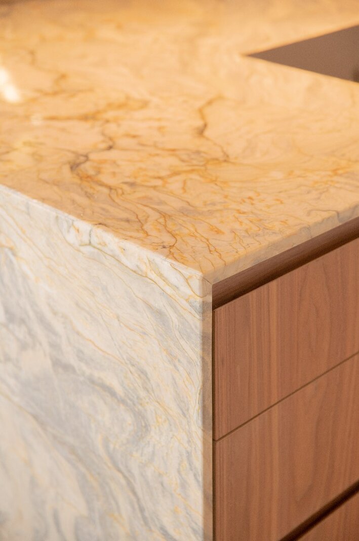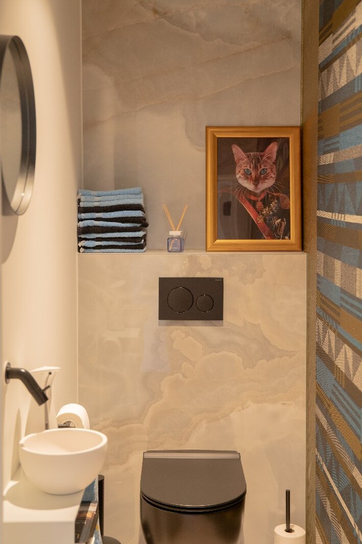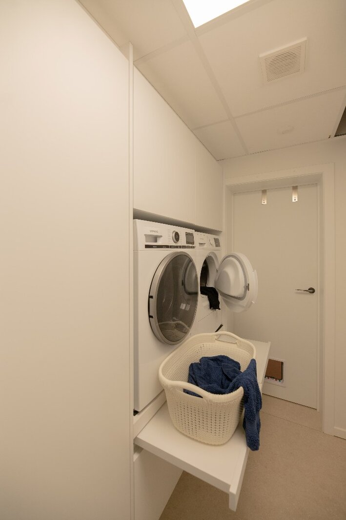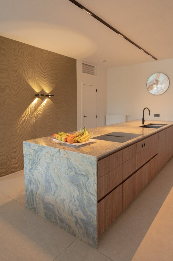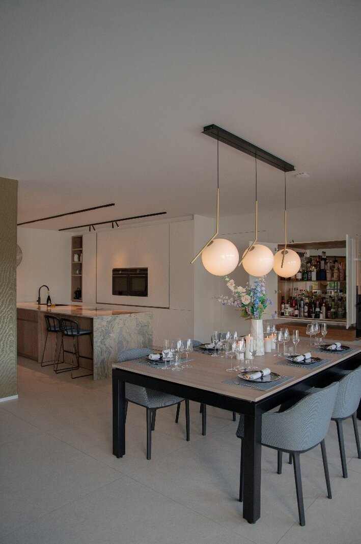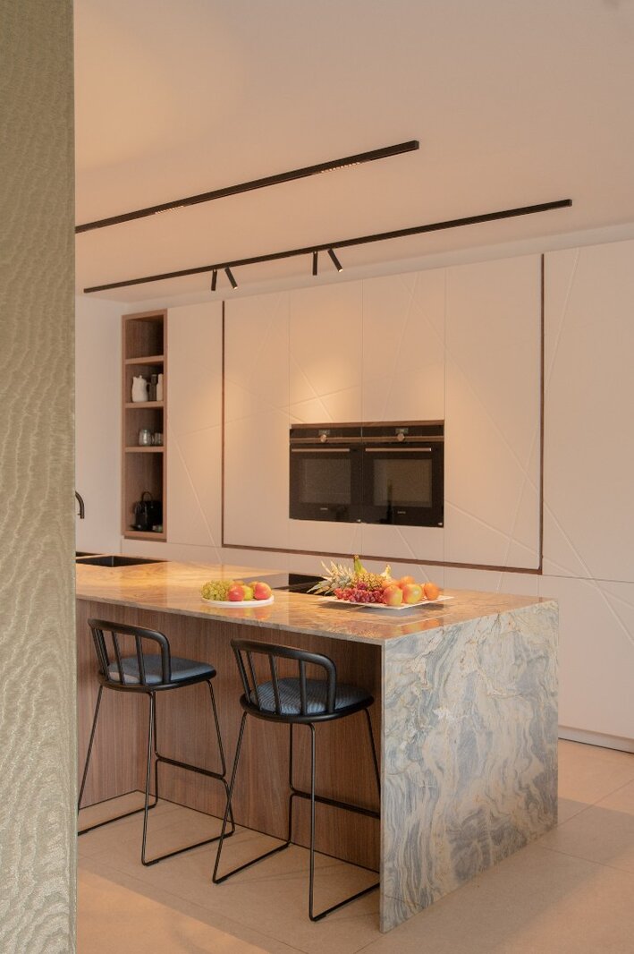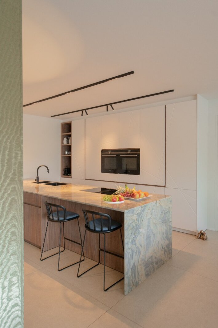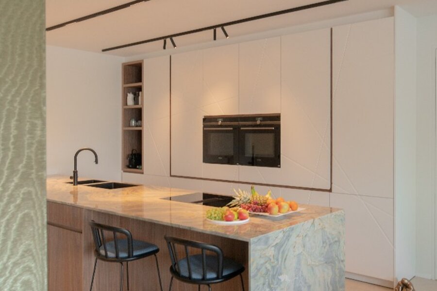 Centraal in het appartement bevindt zich een royaal kookeiland in kwartsiet natuursteen. De keuken is voorzien van hoogwaardige toestellen, waaronder een BORA-kookplaat, Siemens oven met stoomfunctie, Quooker-kraan, Liebherr koelkast met ijsblokjesfunctie en een ingebouwde wijnklimaatkast.