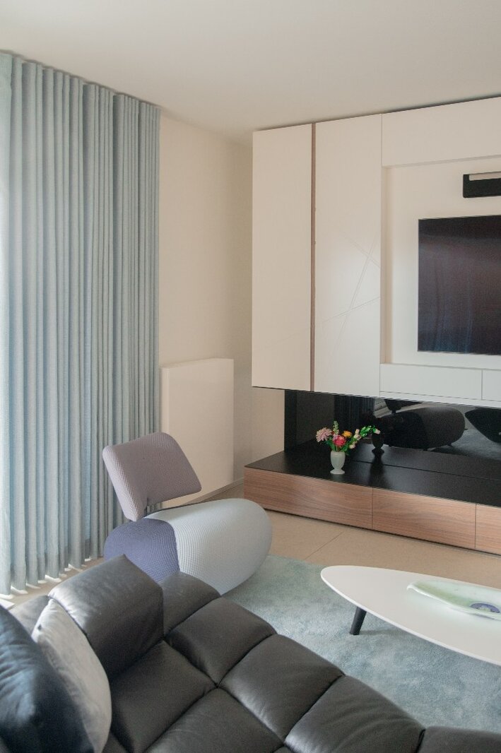 De lichtrijke leefruimte werd uitgerust met maatwerk kasten, discreet geïntegreerde technieken en een sfeervolle gashaard, wat zorgt voor een strak maar warm geheel.