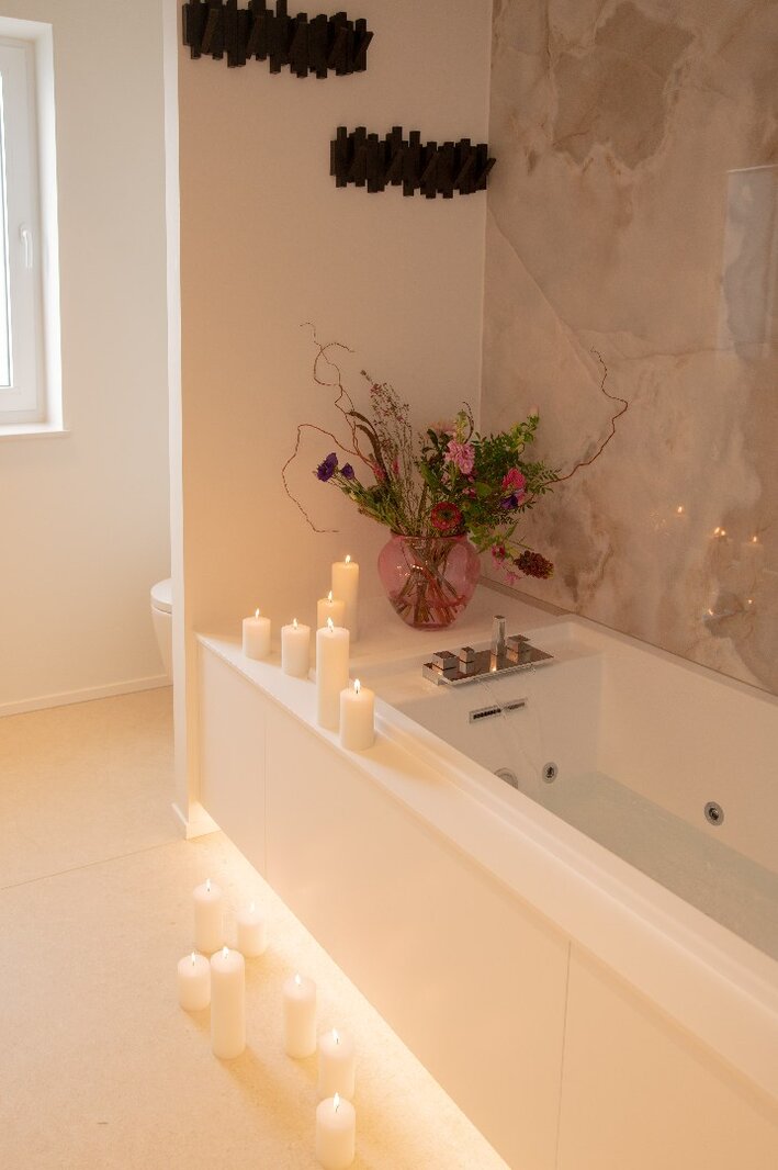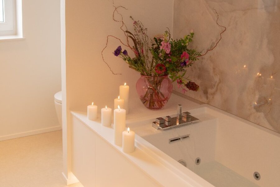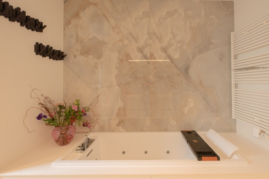 De ruime badkamer combineert esthetiek en functionaliteit en is afgewerkt met Corian maatwerk, een Whirlpoolbad, inloopdouche en een hoogwaardige Japanse toiletinstallatie.