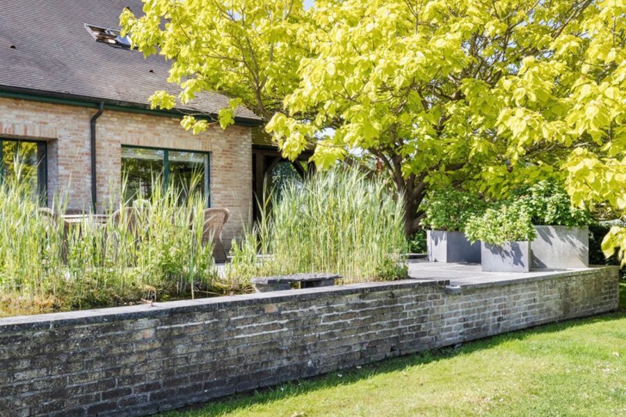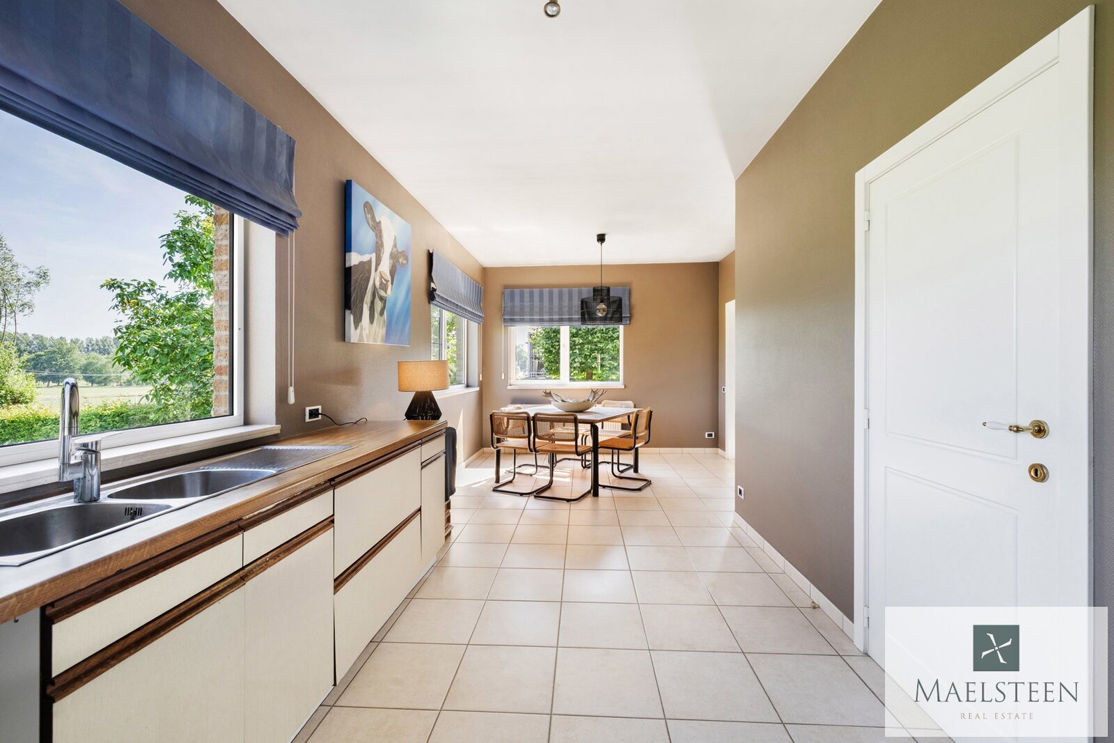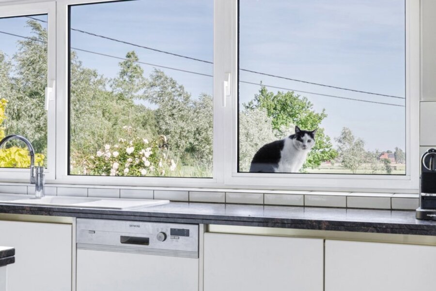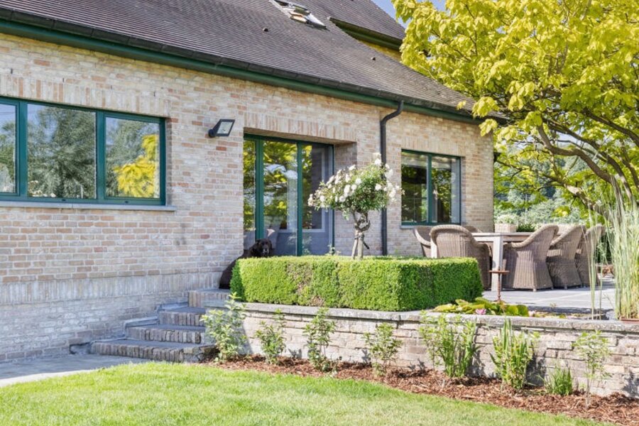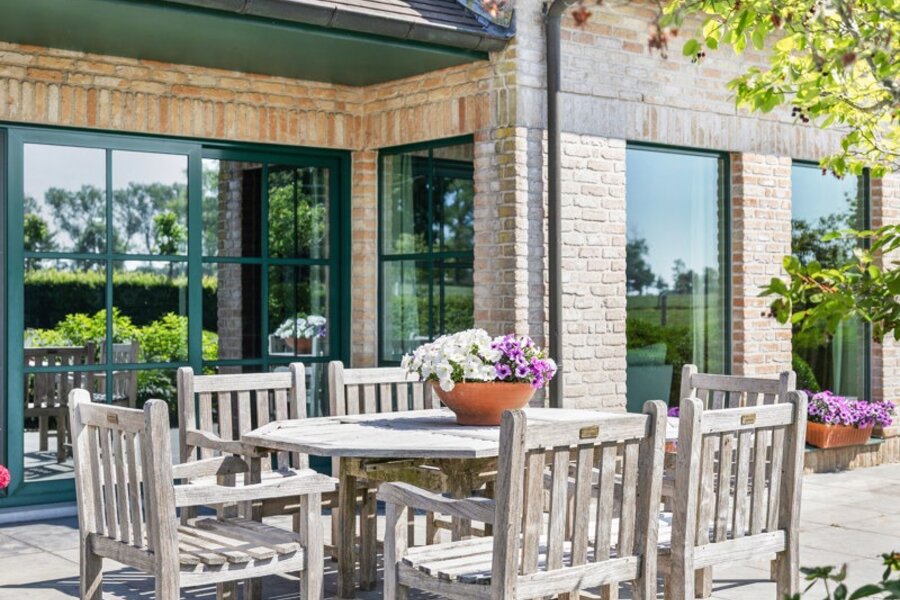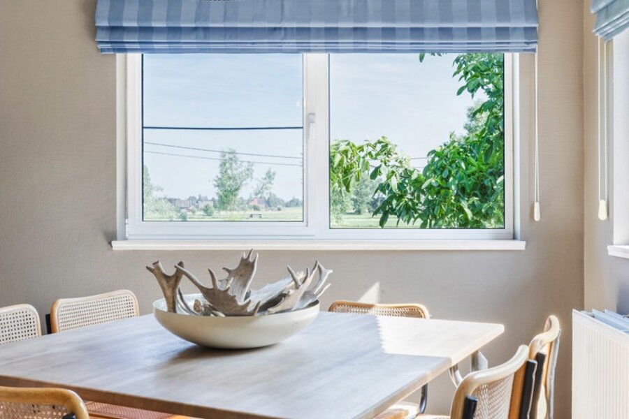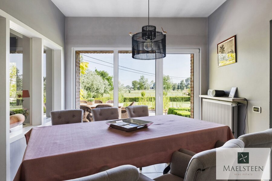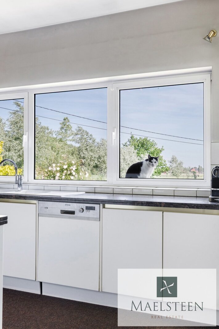 De living grenst aan de heel ruime keuken. Deze keuken heeft een gezellige ontbijthoek, een extra salon, een praktische berging (koelcel installeren?) en een grote bijkeuken. Vanuit de keuken geniet je van een ronduit prachtig zicht over de mooi aangelegde tuin en de weilanden.