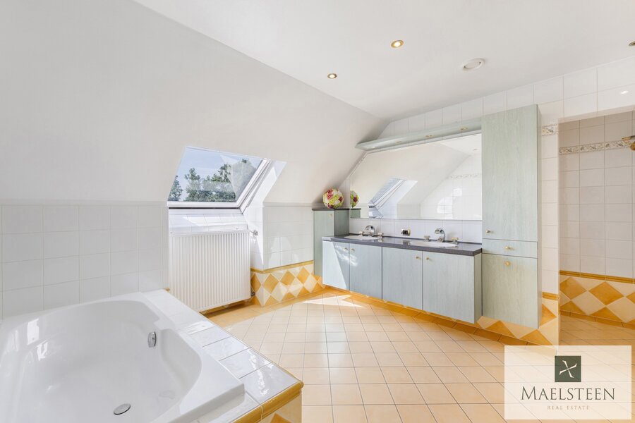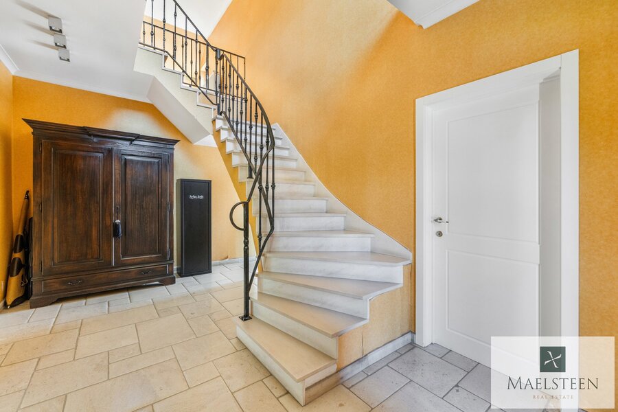Een tweede inkom met gastentoilet brengt je tussen de bijkeuken en het bureau. Verder op het gelijkvloers is er een uit de kluiten gewassen wasberging en een dubbele inpandige garage.