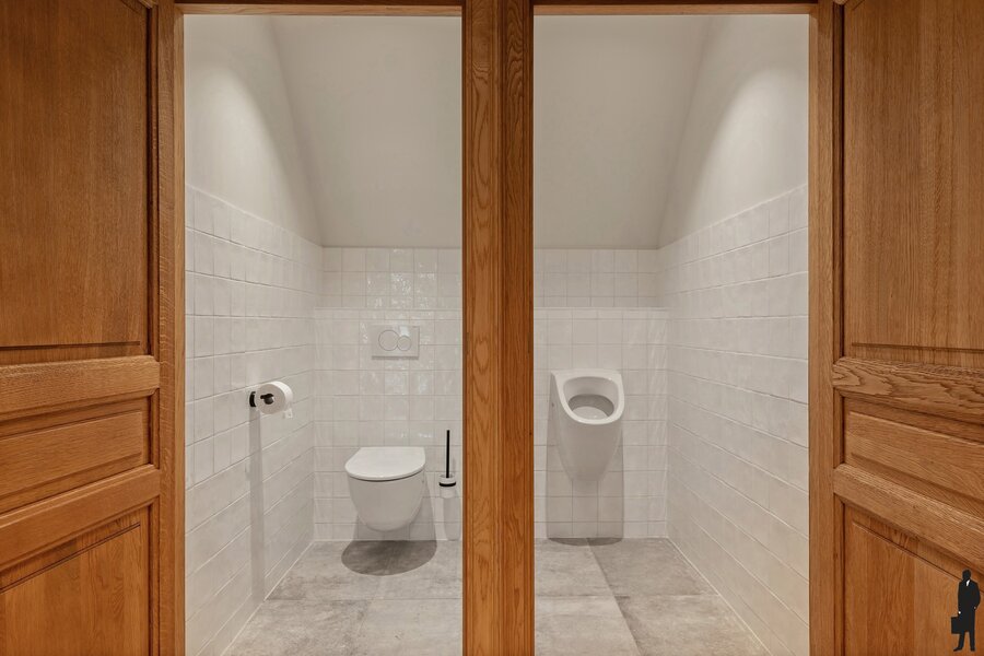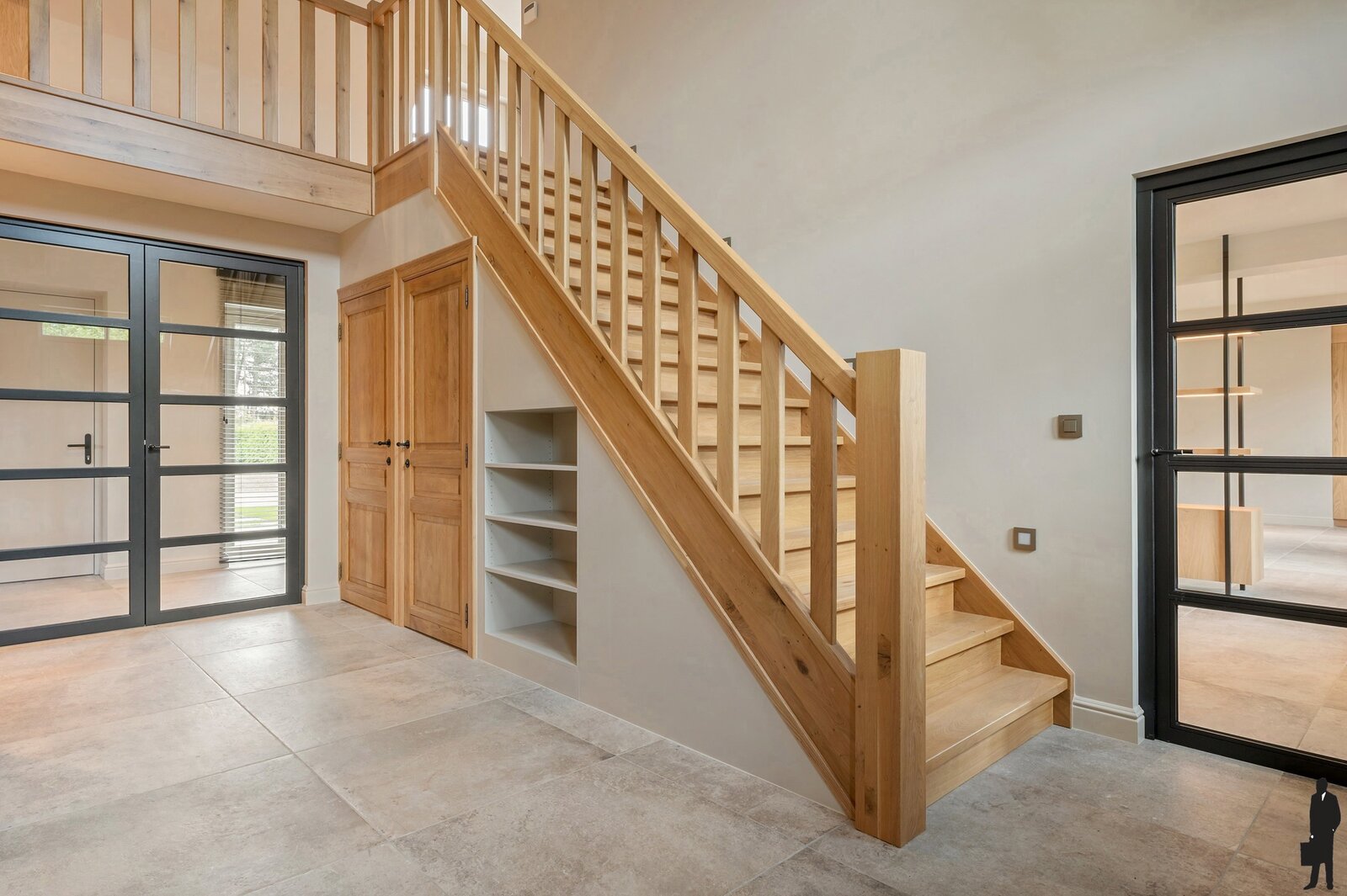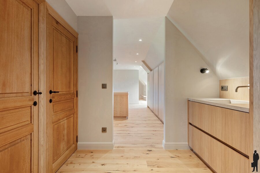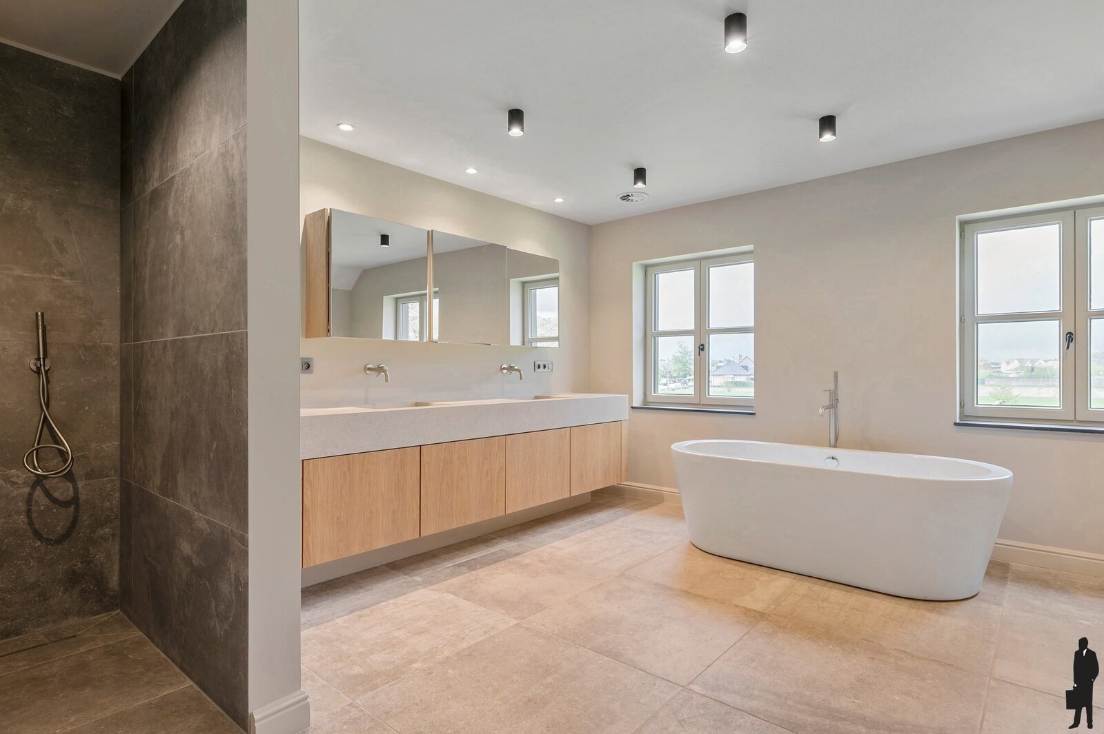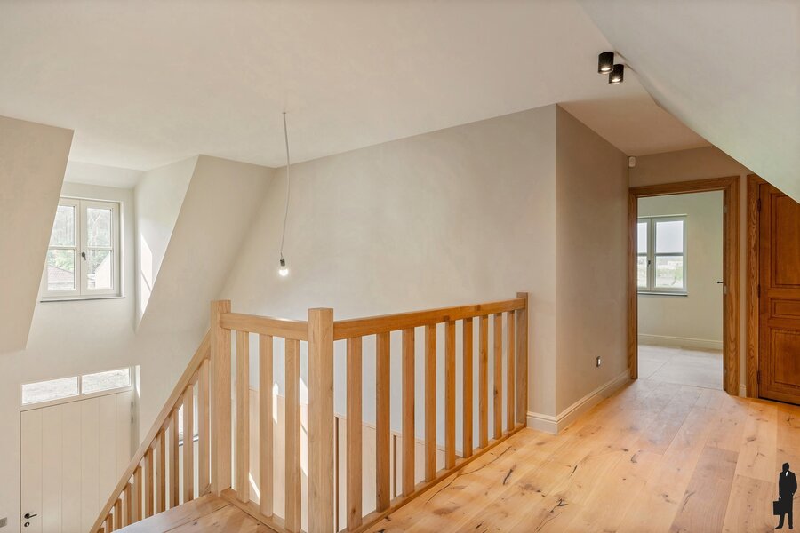 Eerste verdieping: De eiken trap in de inkomhal leidt u naar de 1e verdieping. Hier heeft u allereerst een royale dressing die toegang biedt tot de masterbedroom. Verder nog 2 volwaardige slaapkamers, waarvan 1 met eigen dressing. Een luxueuze badkamer met inloopdouche, ligbad, dubbele wastafel. Verder opnieuw een apart toilet (met toilet en urinoir).