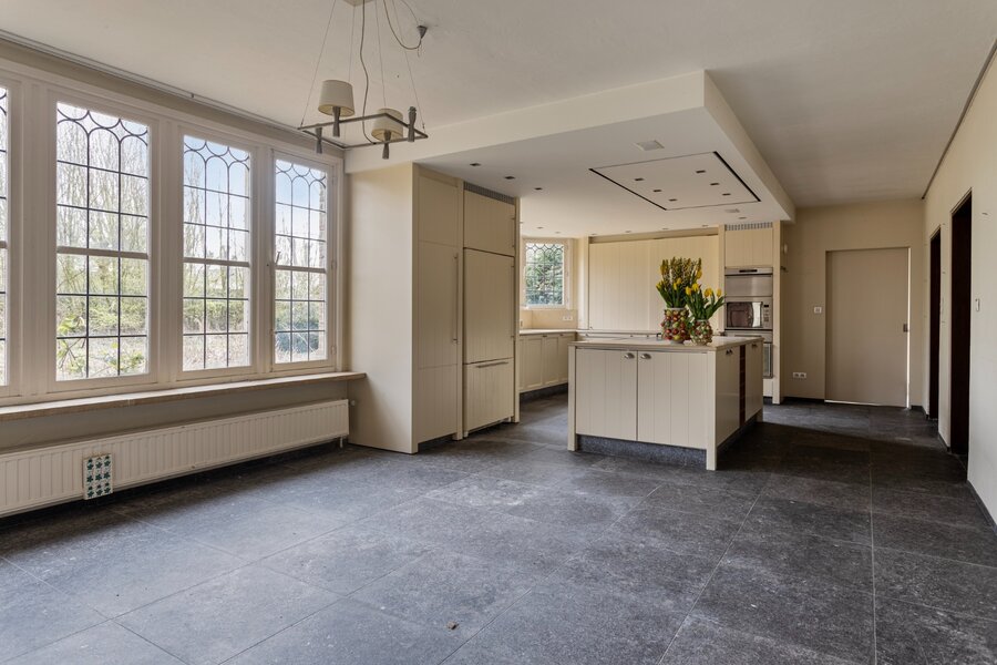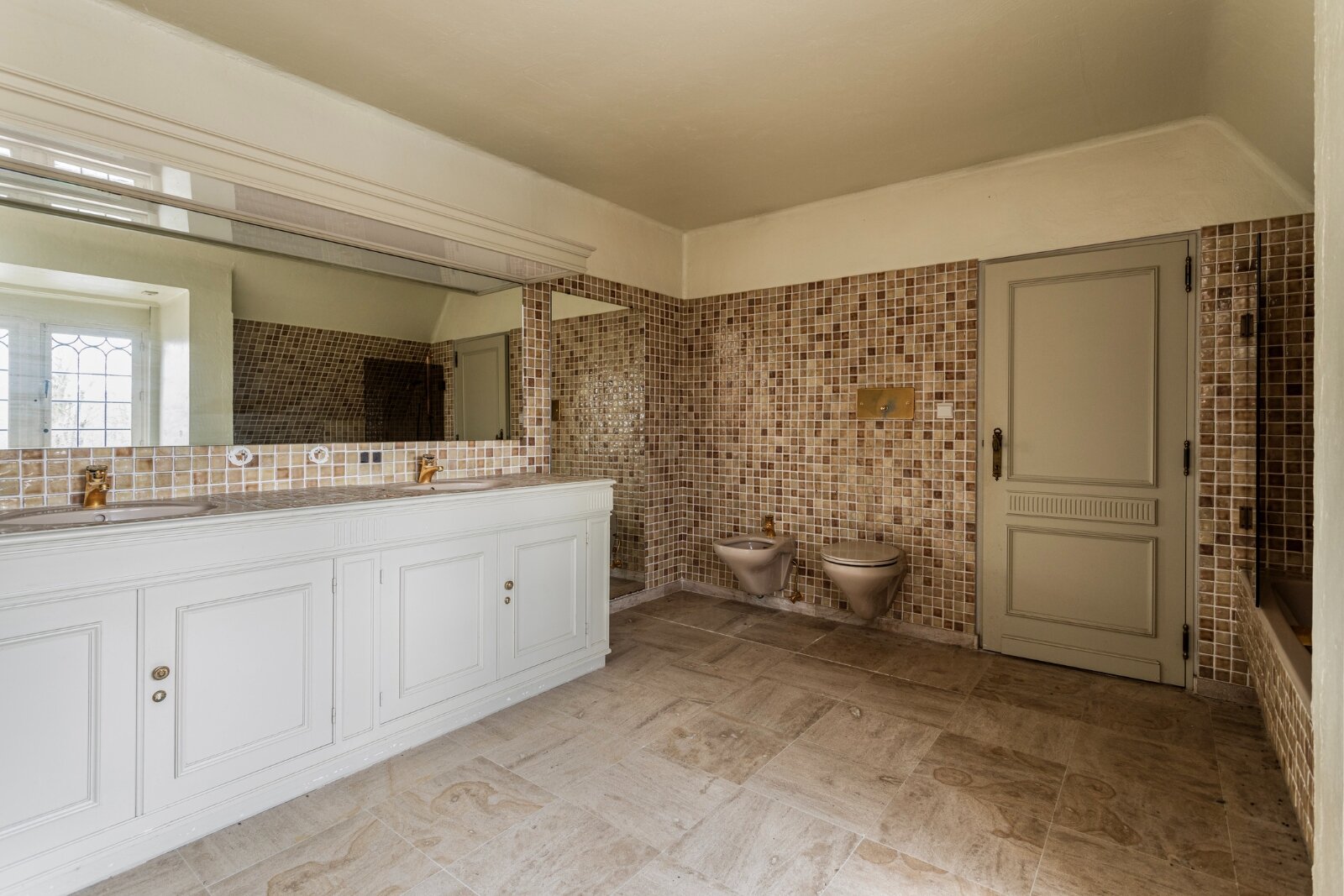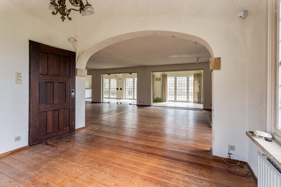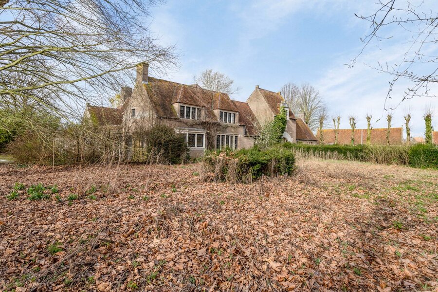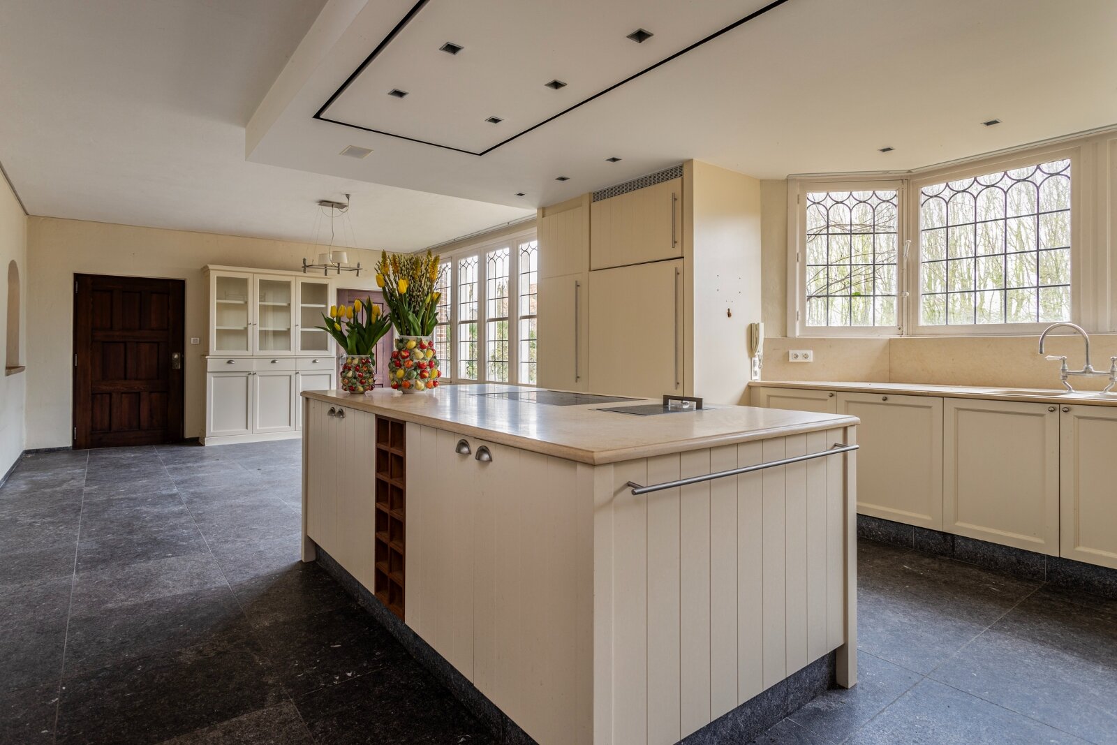 De rechterflank herbergt een bureauruimte met aansluitend een driedubbele garage. De linkerflank, het woongedeelte, is royaal ingedeeld met een prachtige inkomhal, vestiaire, luxueuze sanitaire ruimte, om vervolgens de enorme leefkeuken te betreden, gekoppeld aan de uiterst ruime leefkamer in massief parket met open haard. Een compacte wijnkelder en een te renoveren binnenzwembad in connectie met de woonkamer maken de ruimtes af. Via een majestueuze trappenhal komen we terecht op de eerste verdieping van het landhuis. Hier vinden we 4 royale slaapkamers en twee luxueuze badkamers.