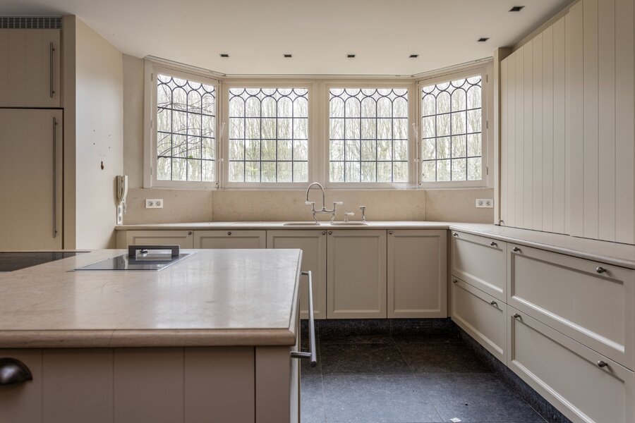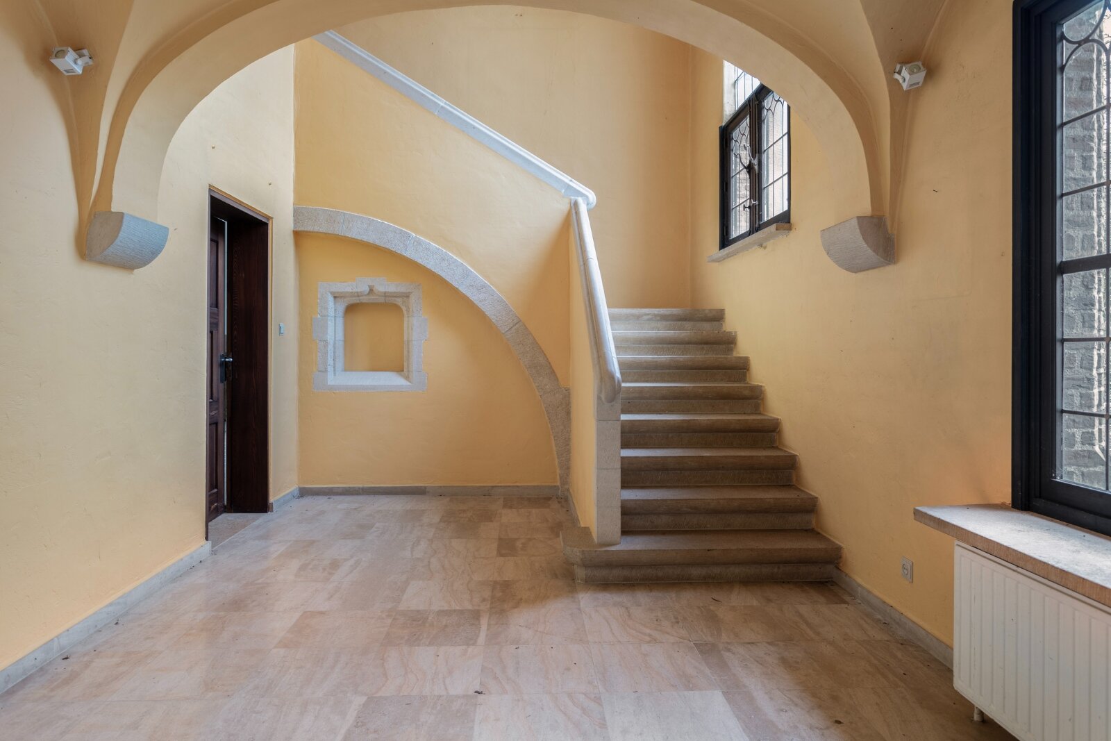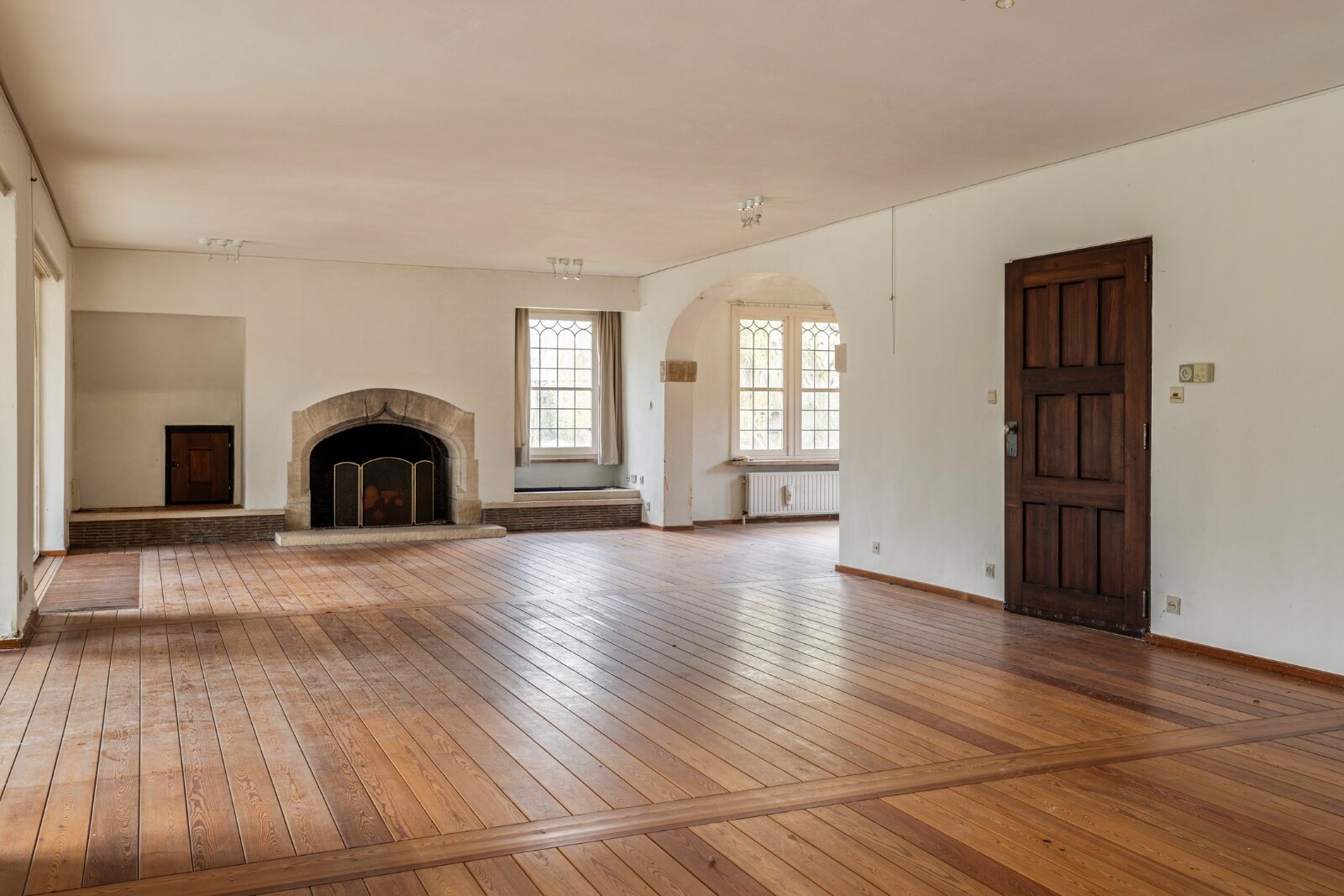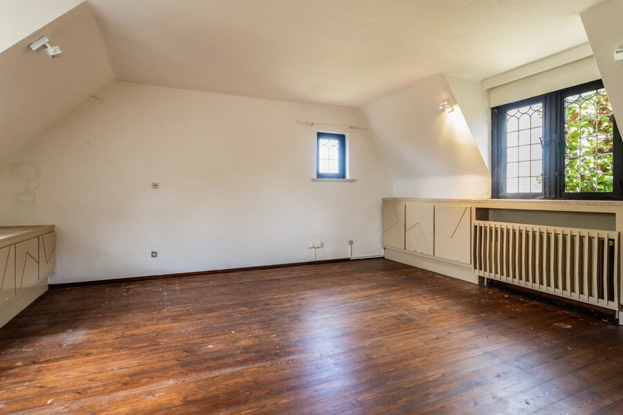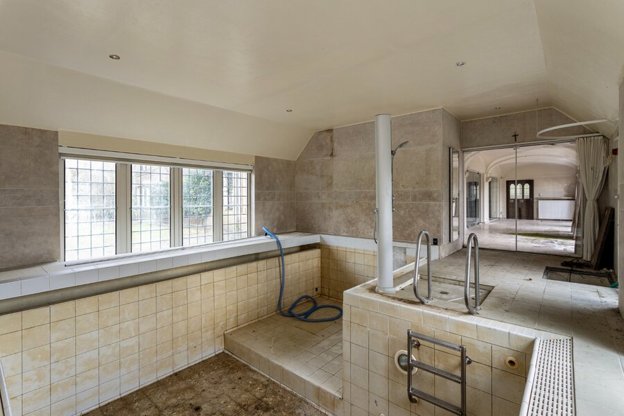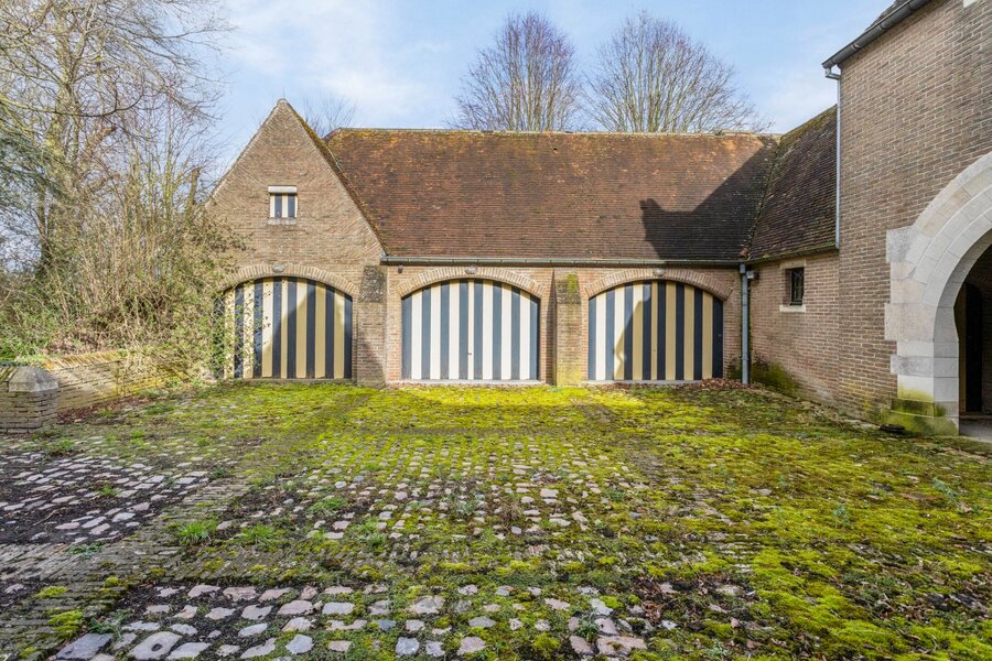 De rechterflank herbergt een bureauruimte met aansluitend een driedubbele garage. De linkerflank, het woongedeelte, is royaal ingedeeld met een prachtige inkomhal, vestiaire, luxueuze sanitaire ruimte, om vervolgens de enorme leefkeuken te betreden, gekoppeld aan de uiterst ruime leefkamer in massief parket met open haard. Een compacte wijnkelder en een te renoveren binnenzwembad in connectie met de woonkamer maken de ruimtes af. Via een majestueuze trappenhal komen we terecht op de eerste verdieping van het landhuis. Hier vinden we 4 royale slaapkamers en twee luxueuze badkamers.
