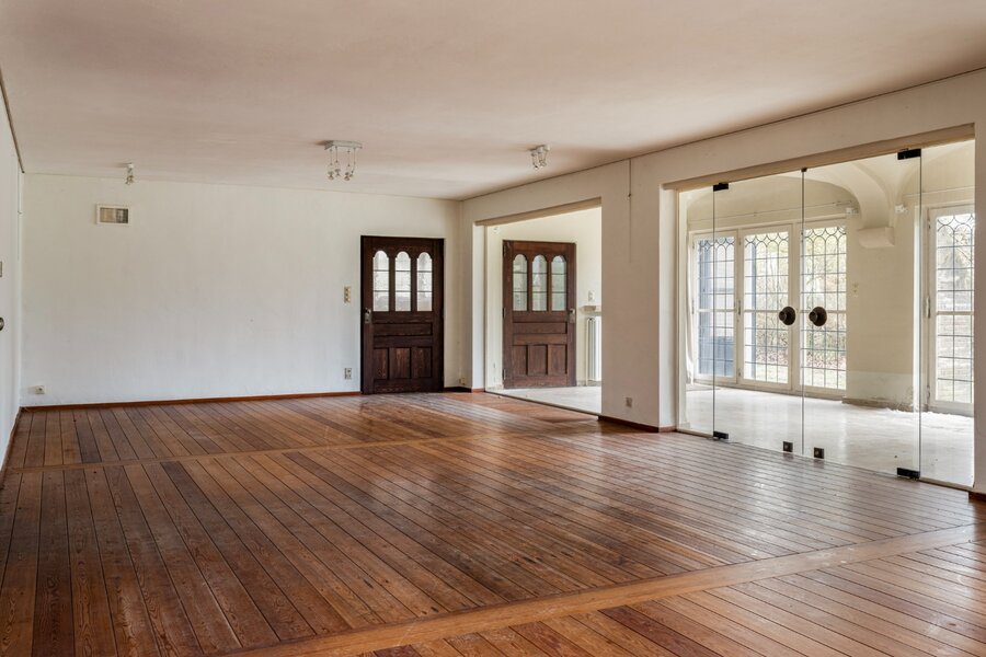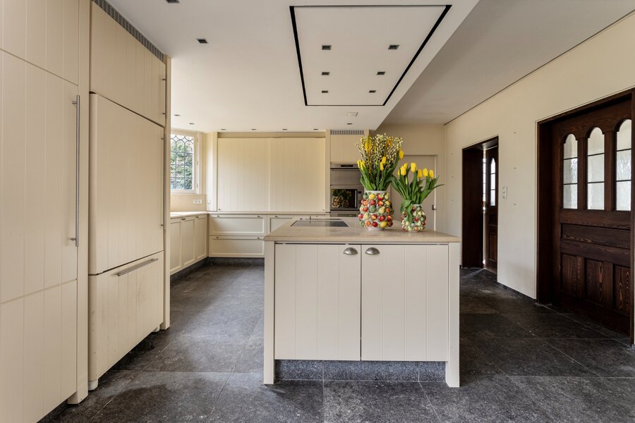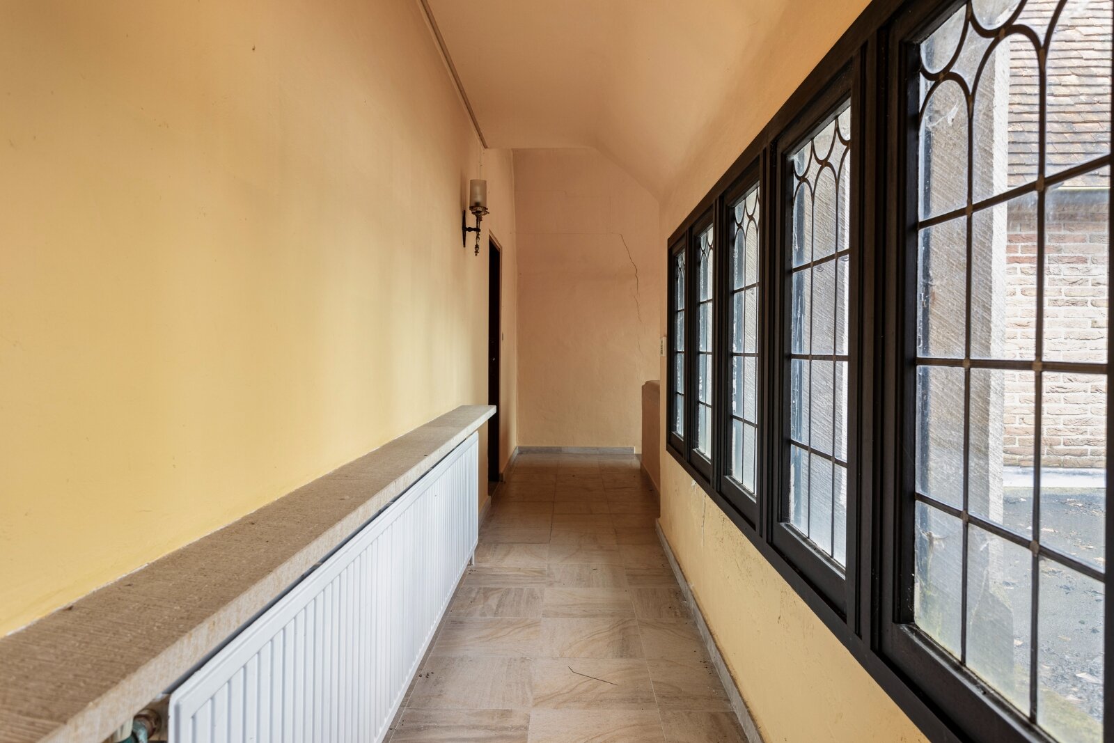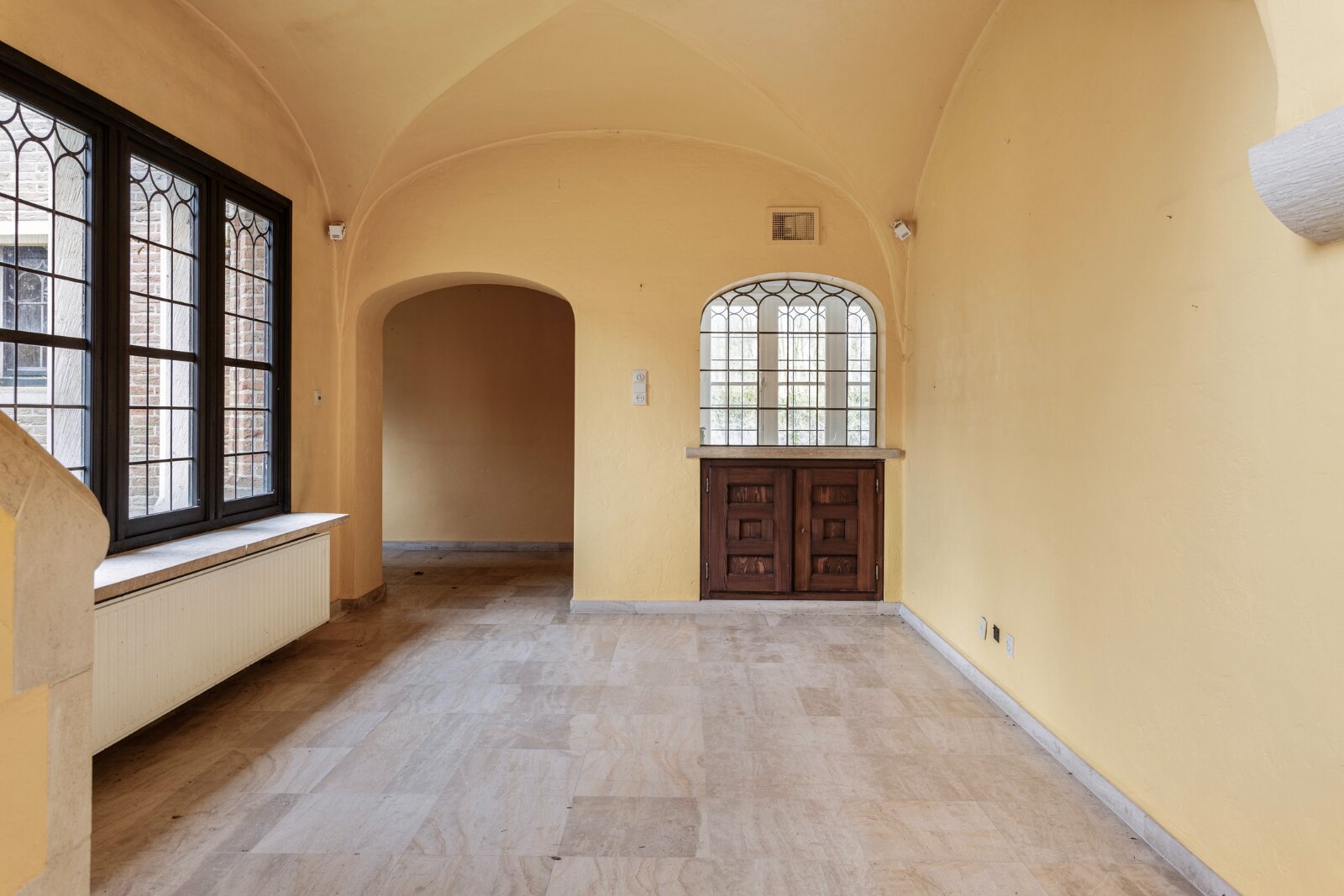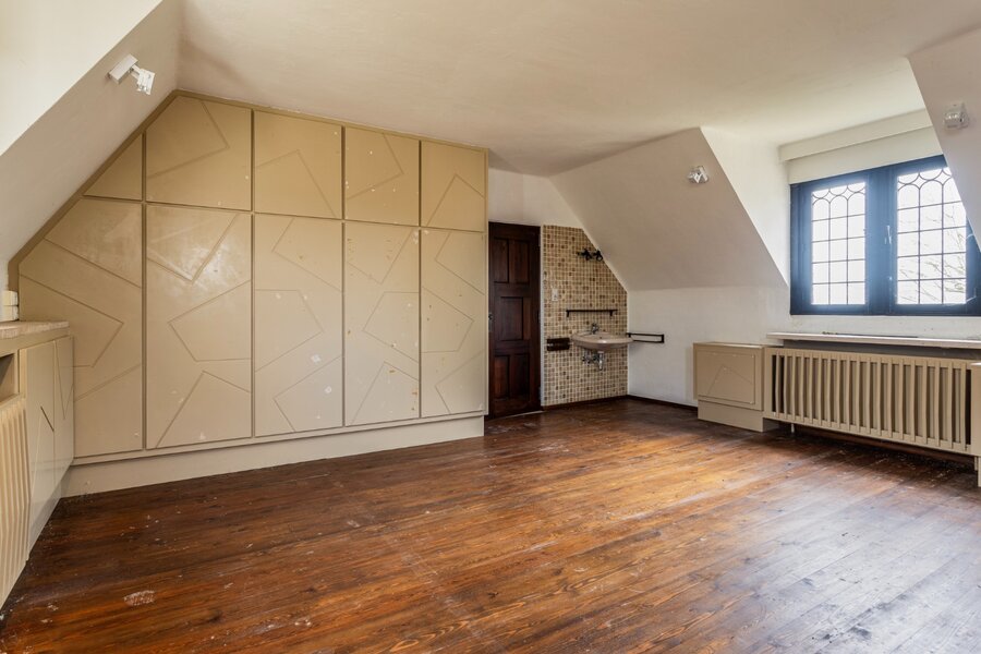 De rechterflank herbergt een bureauruimte met aansluitend een driedubbele garage. De linkerflank, het woongedeelte, is royaal ingedeeld met een prachtige inkomhal, vestiaire, luxueuze sanitaire ruimte, om vervolgens de enorme leefkeuken te betreden, gekoppeld aan de uiterst ruime leefkamer in massief parket met open haard. Een compacte wijnkelder en een te renoveren binnenzwembad in connectie met de woonkamer maken de ruimtes af. Via een majestueuze trappenhal komen we terecht op de eerste verdieping van het landhuis. Hier vinden we 4 royale slaapkamers en twee luxueuze badkamers.