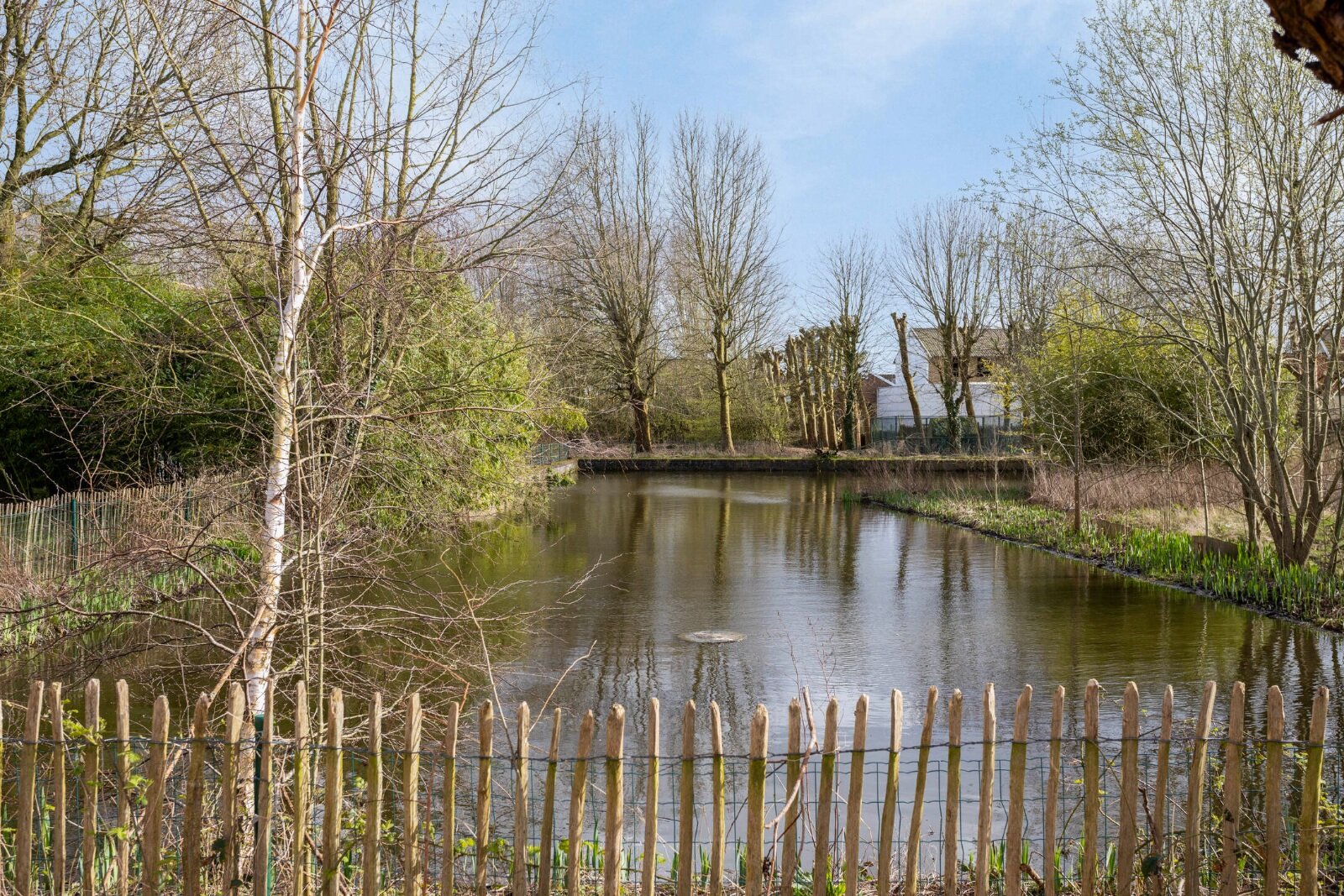 De tuin, gekenmerkt door prachtige bomen waaronder essen, platanen, een 92-jarige eik en een mooie treurwilg, vormen samen met de ruime vijver en terras van 260m² voor een oase aan rust. Het geheel is van de hand van tuinarchitect 'Paul Deroose'. Achterliggend herbergt het landgoed een paardenweide en een basketbalplein.