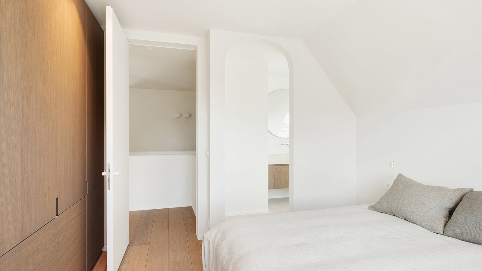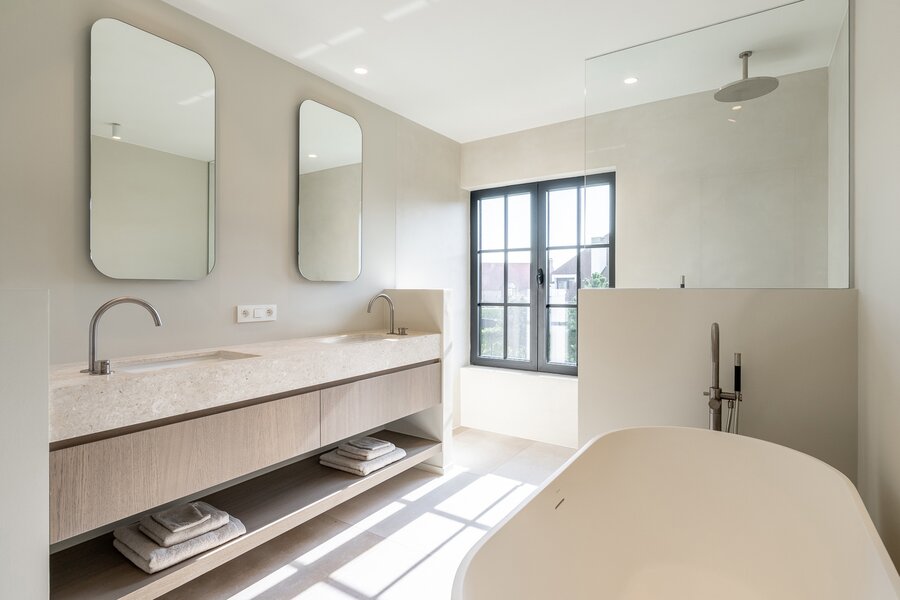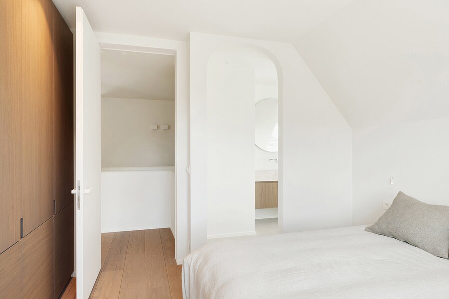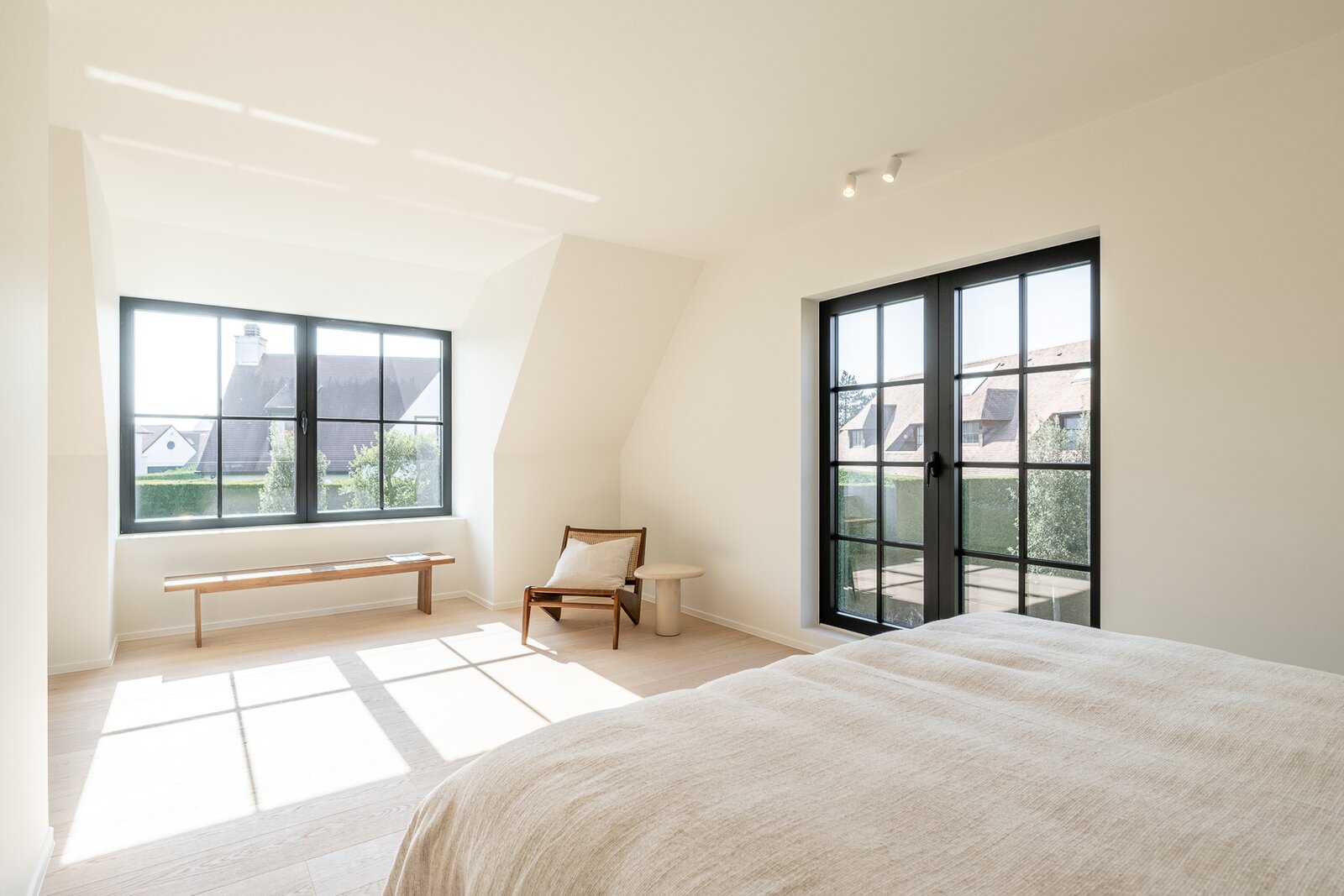1e verdiep: Nachthal met apart toilet. Royale masterbedroom met dressing en badkamer (bad en douche). Drie slaapkamers met elk hun eigen badkamer en ingemaakte kasten.