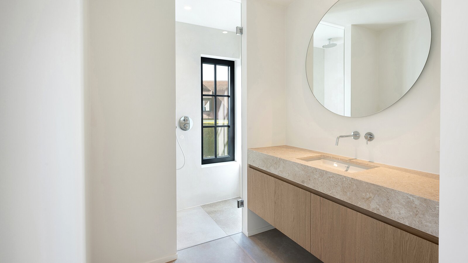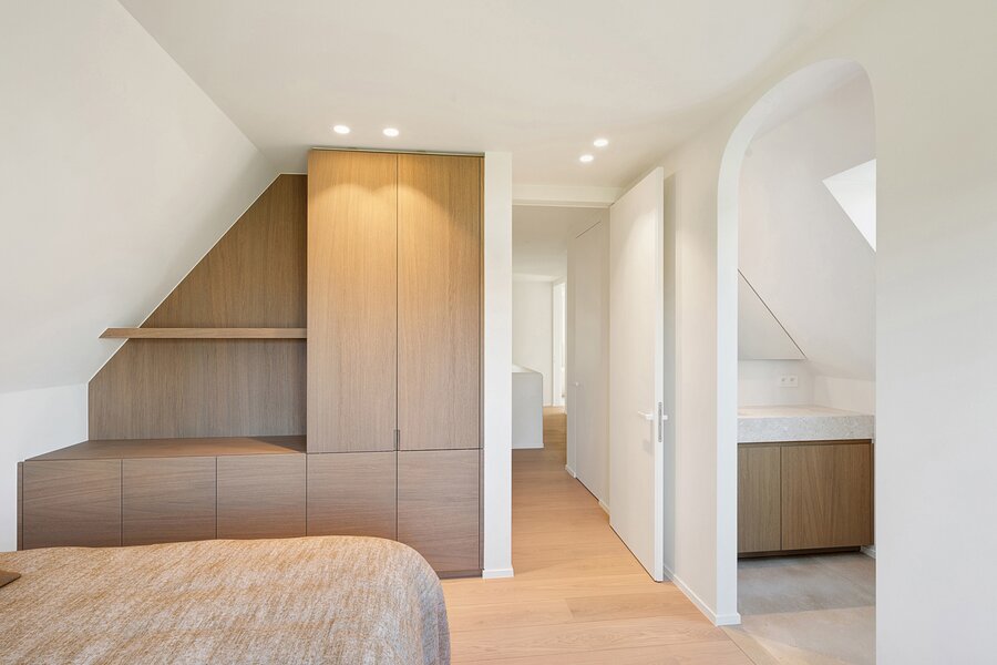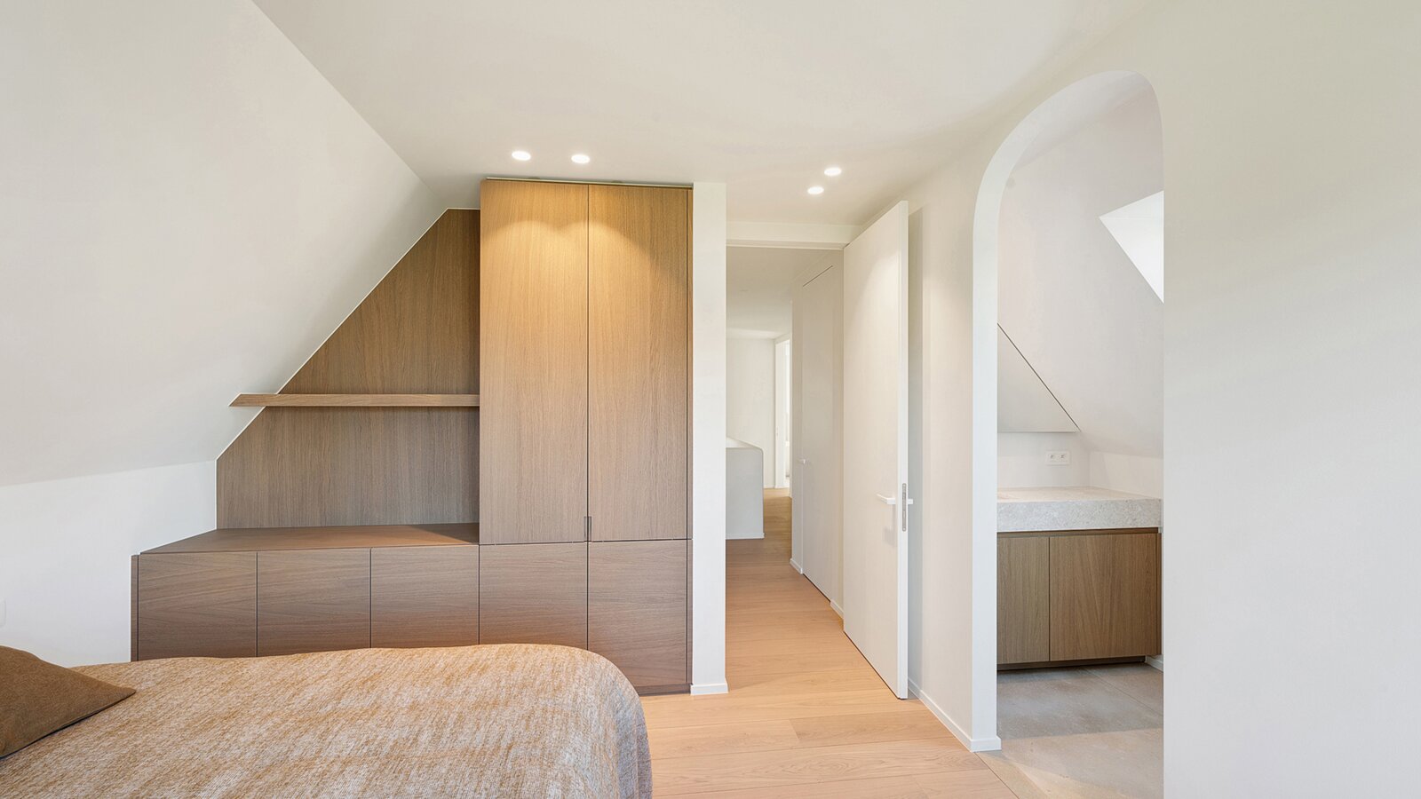 1e verdiep: Nachthal met apart toilet. Royale masterbedroom met dressing en badkamer (bad en douche). Drie slaapkamers met elk hun eigen badkamer en ingemaakte kasten.