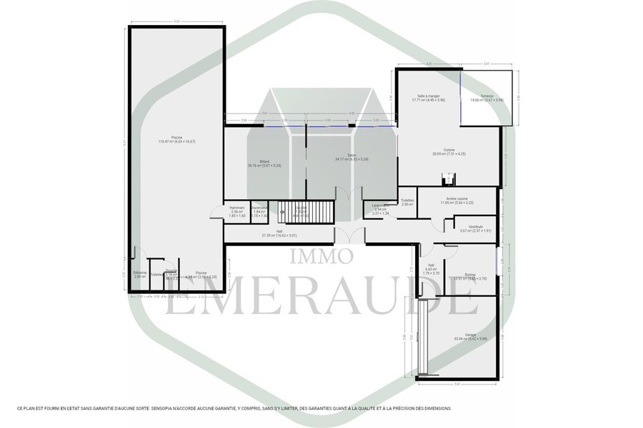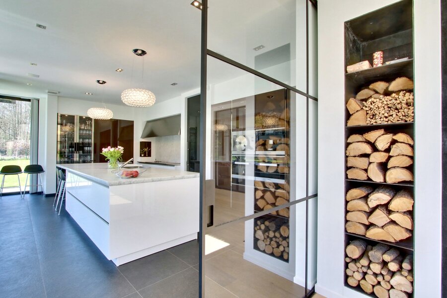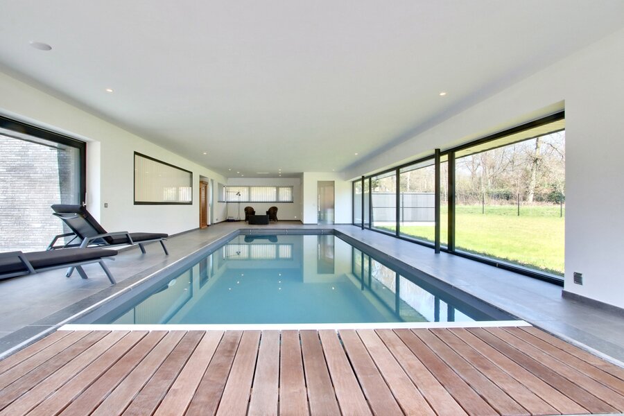 De benedenverdieping geeft uit op een grote inkomhal met een lift die de 3 niveaus bedient. Deze komt uit op een woonkamer met een SieMatic super uitgeruste keuken. Er is ook een kantoor, een garderobe, een bijkeuken en het overdekte zwembad met sauna, garderobe, douche en WC. Al deze ruimtes baden in het licht dankzij de vele erkers.