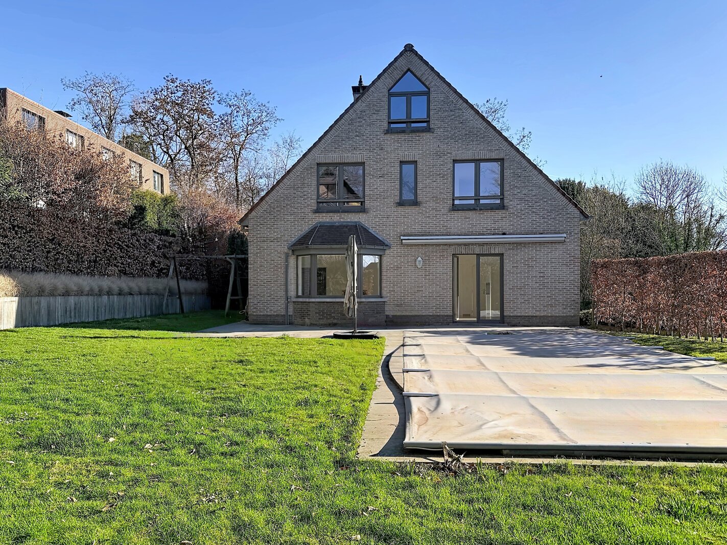 In een rustige straat nabij de wijk Dieweg, een prachtig driezijdig huis, gerenoveerd in 2018, met een totale oppervlakte van circa 321 m². Het bestaat uit een entreehal met garderobe en toilet, een ruime woonkamer (circa 45 m²), een volledig uitgeruste keuken (merk Bosch), een eetkamer of tv-hoek (circa 20 m²), een nachtkastje, 5 slaapkamers (circa 18 m², 18 m², 17 m², 15 m² en 10 m²), een groot kantoor/werkkamer of slaapkamer (circa 37 m²), een badkamer en 2 doucheruimtes, waarvan één grenzend aan een slaapkamer. Een fraai terras (circa 44,50 m²) biedt uitzicht op een grote tuin (circa 44,50 m²) met een verwarmd zwembad. Op de begane grond bevindt zich een ruime garage en voor het huis zijn meerdere parkeerplaatsen. De woning is voorzien van dubbele beglazing, zonnepanelen en een waterontharder. Alle nutsvoorzieningen worden individueel gemeten. Energieprestatiecertificaat (EPC) met score C+. Mis deze kans niet, neem vandaag nog contact op met Vaneau Lecobel!