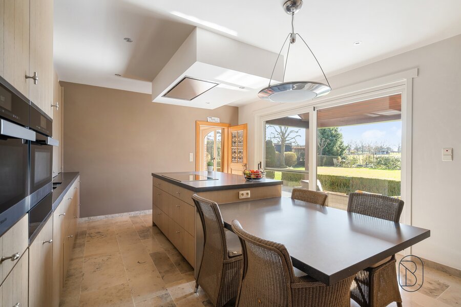 Indeling: grote ruime inkomhal, lichtrijke gezellige grote leefruimte (parket, prachtige sierschouw en open zicht op de tuin), vernieuwde, volledig uitgeruste keuken met extra ontbijthoek, praktische berging/wasplaats, bureau van 30m2/praktijk, 2 garages.