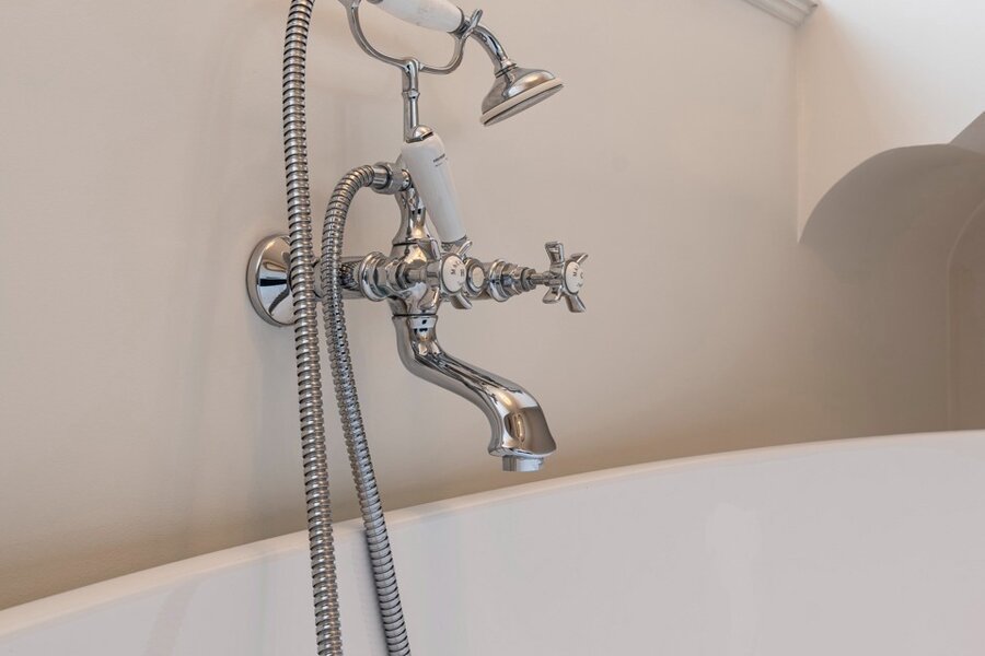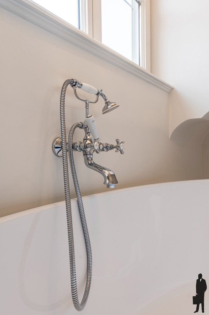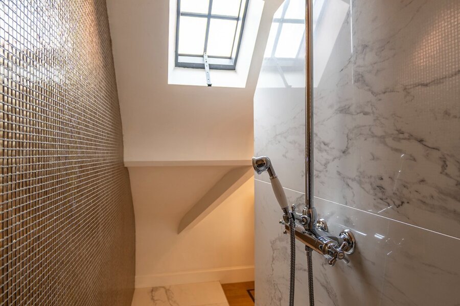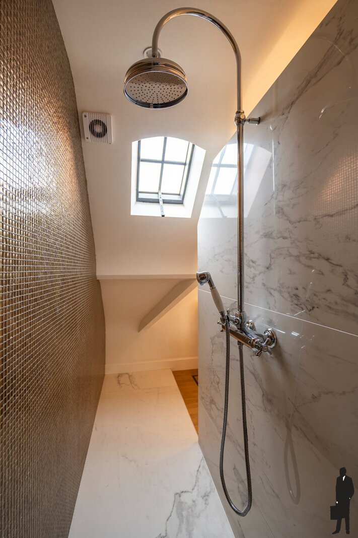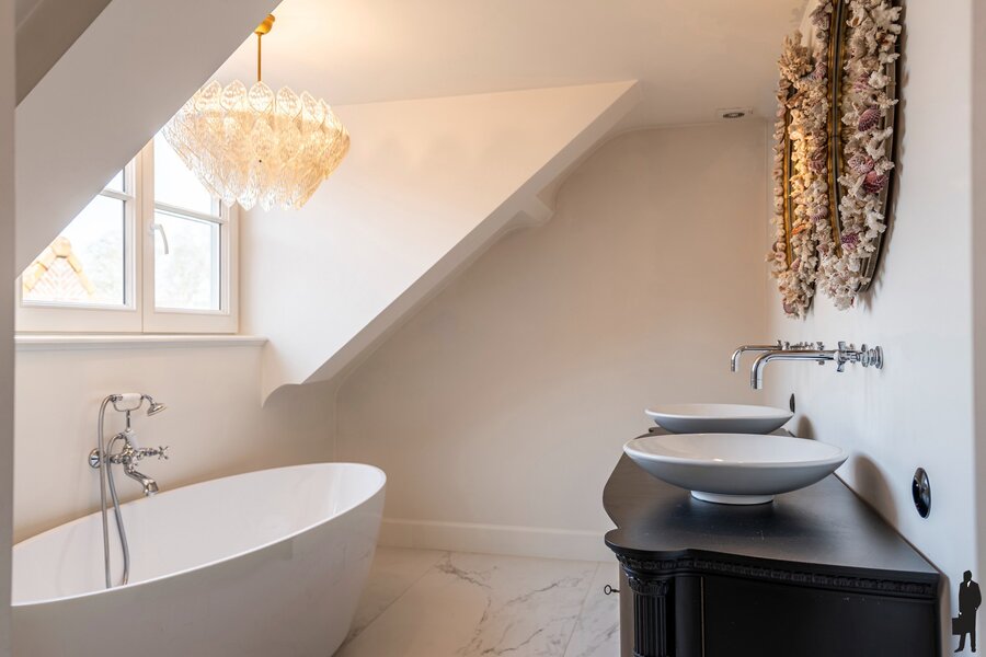 - Badkamer met inloopdouche, vrijstaand bad, dubbele wastafel en toilet