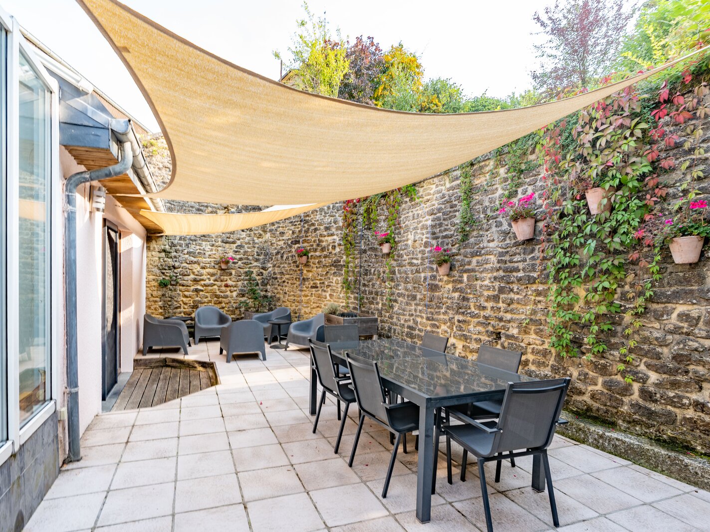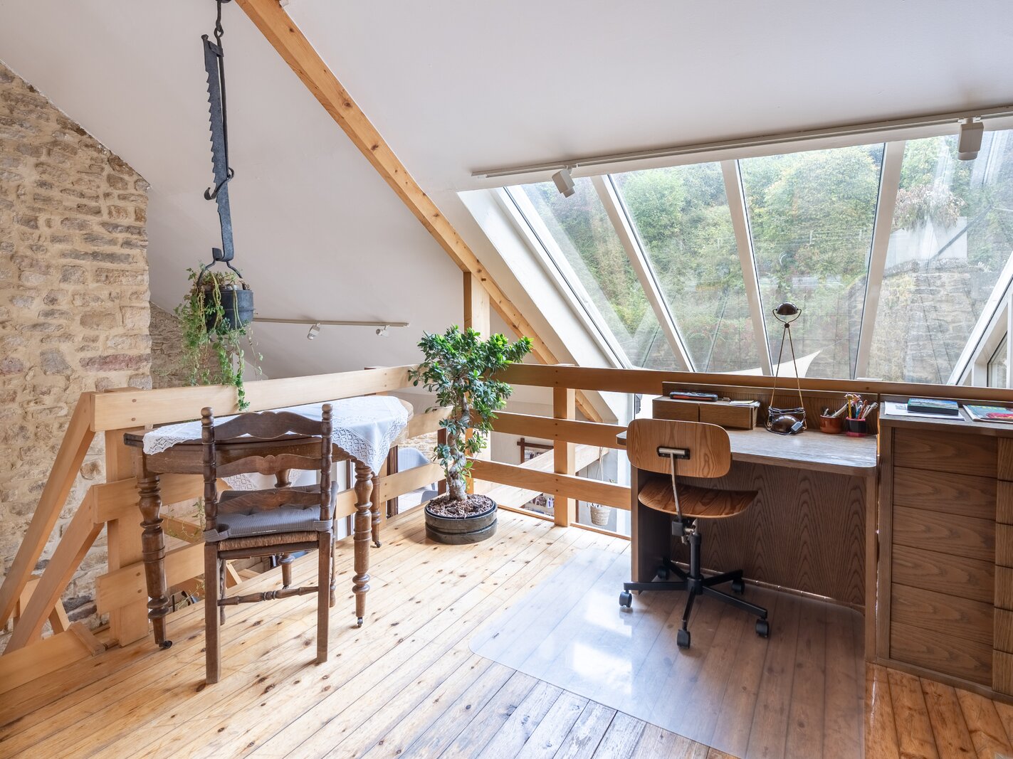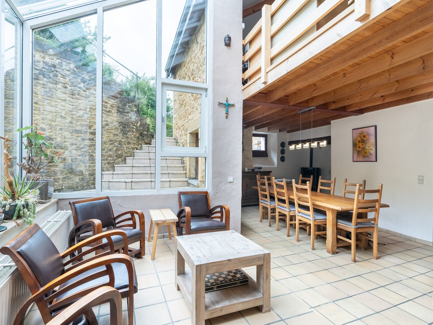 Op de verdieping vindt u een gezellige salon, drie slaapkamers waarvan twee met eigen badkamer, een derde badkamer en een bureau met directe toegang tot de buitenruimte.
