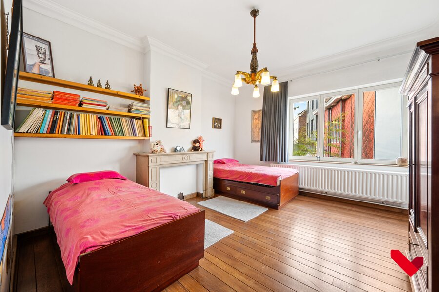 Op de eerste verdieping bevinden zich drie ruime en lichte slaapkamers waarvan de grootste toegang geeft tot de bureau. Hiernaast is er een badkamer uitgerust met ligbad en dubbele wastafel. Originele binnendeuren, sierlijsten en houten vloeren benadrukken het authentieke karakter. De woning is volledig onderkelderd en biedt veel bergruimte, een wasplaats en een praktische doorgang naar buiten. Daarnaast zijn er een garage en een oprit voor extra parkeergelegenheid.