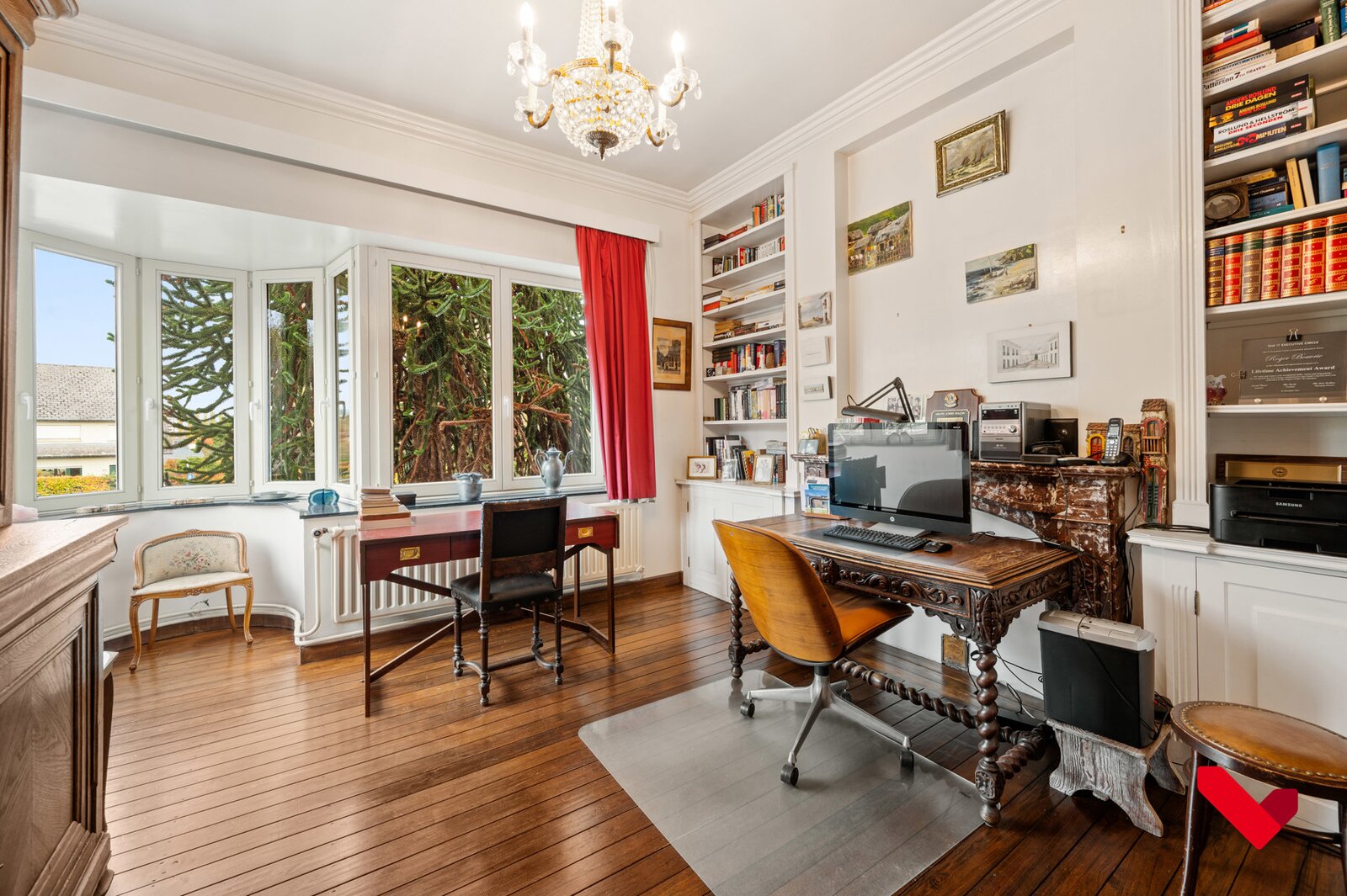 De inkomhal vormt het statige middelpunt van de woning en verdeelt het huis op een harmonieuze manier. Aan de ene zijde ligt de royale, karaktervolle leefruimte met parketvloer, grote ramen en klassieke afwerkingen die de charme van de woning versterken. Aan de andere zijde bevinden zich de ruime keuken met zicht op de tuin en een tweede leefruimte, ideaal als extra salon, bureau of polyvalente kamer. Elke ruimte heeft zijn eigen karakter en functionaliteit, maar past perfect binnen het elegante geheel van het huis.