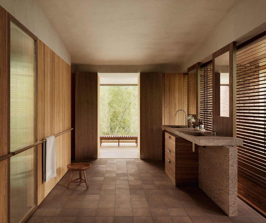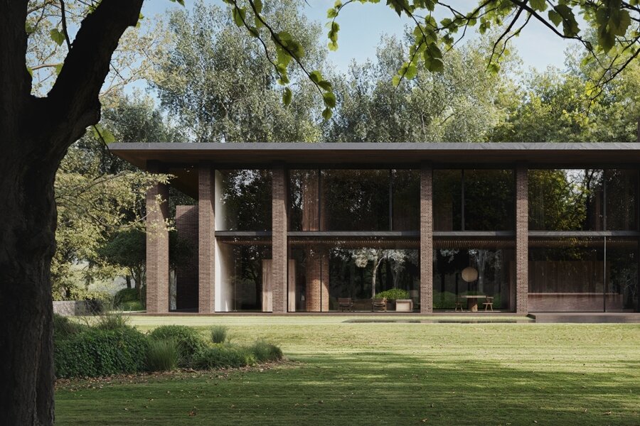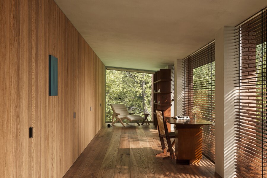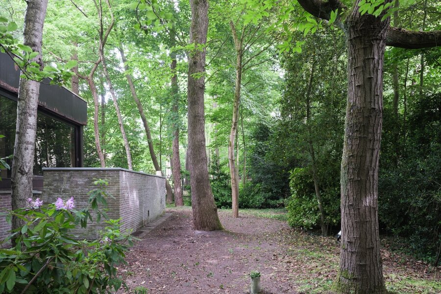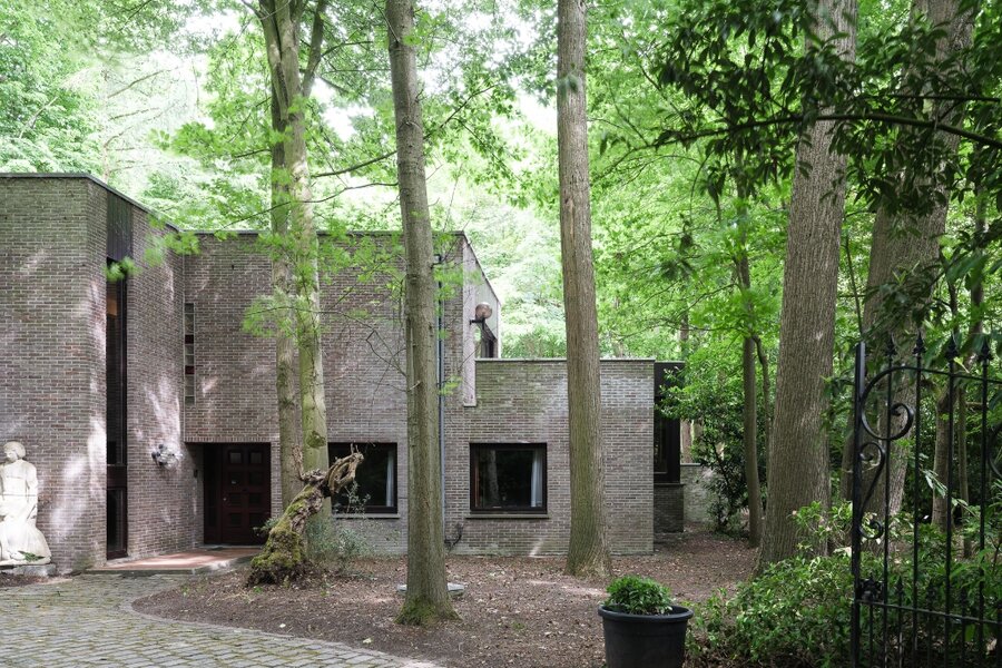 De donkere gevelsteen en natuurlijke materialen zorgen voor een harmonieuze aansluiting met het landschap, terwijl deze warme materialen ook binnen worden doorgetrokken. Dankzij de open indeling, grote raampartijen aan twee zijden en het hoge plafond baden de leefruimtes in natuurlijk licht. Het resultaat is een lichtrijke, serene thuis die perfect thuishoort in een bosrijke omgeving.