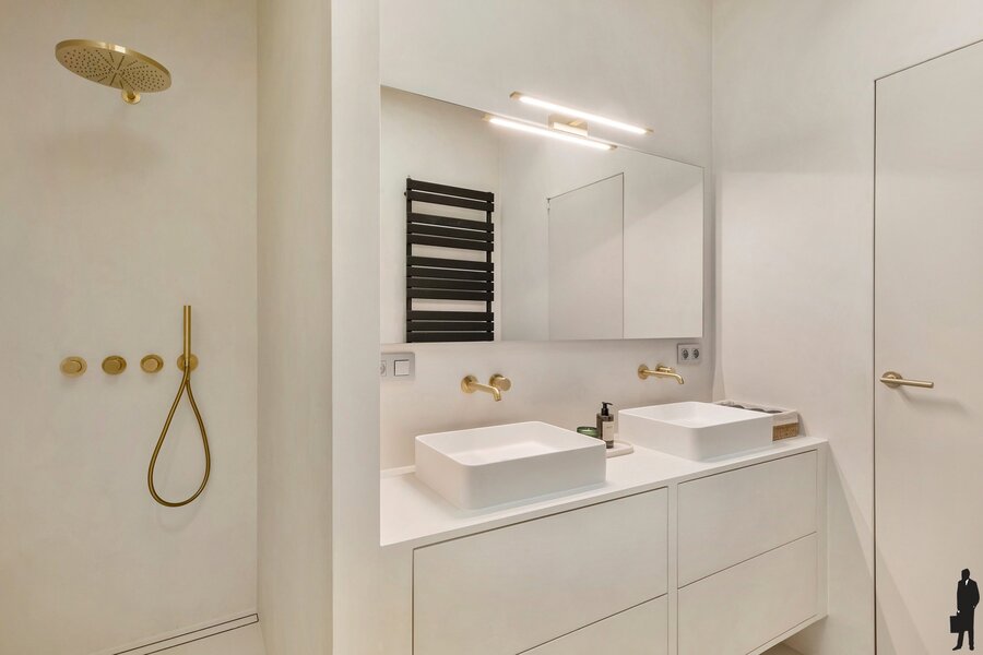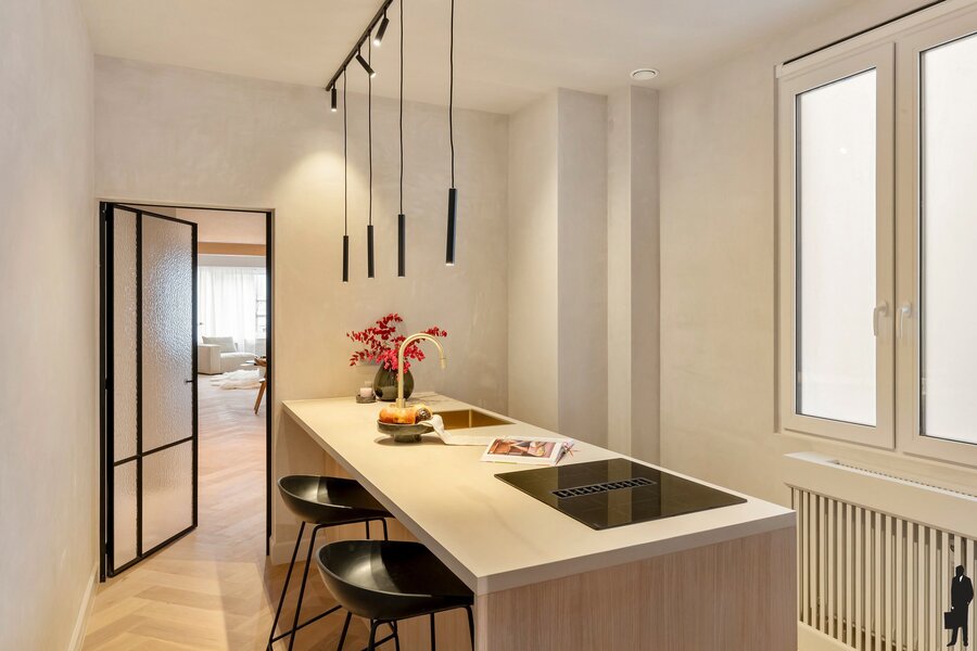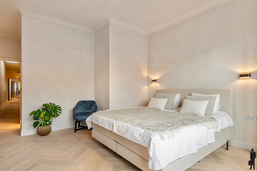 Op de tweede verdieping wacht een appartement van ca. 144 m², dat in 2025 een smaakvolle totaalrenovatie kreeg met zeer hoogwaardige materialen en een tijdloze afwerking. De indeling is erg ruim en logisch, met een royale leefruimte en leefkeuken als centraal punt.