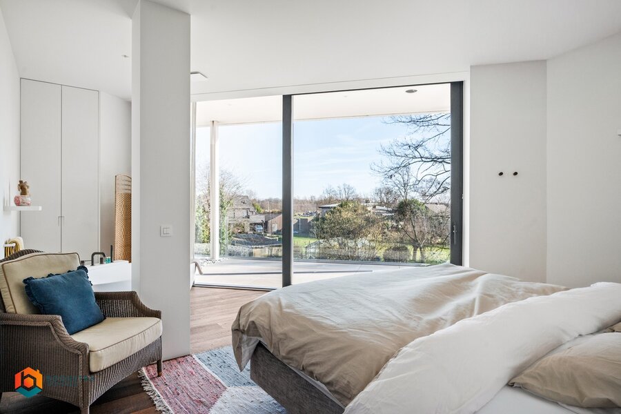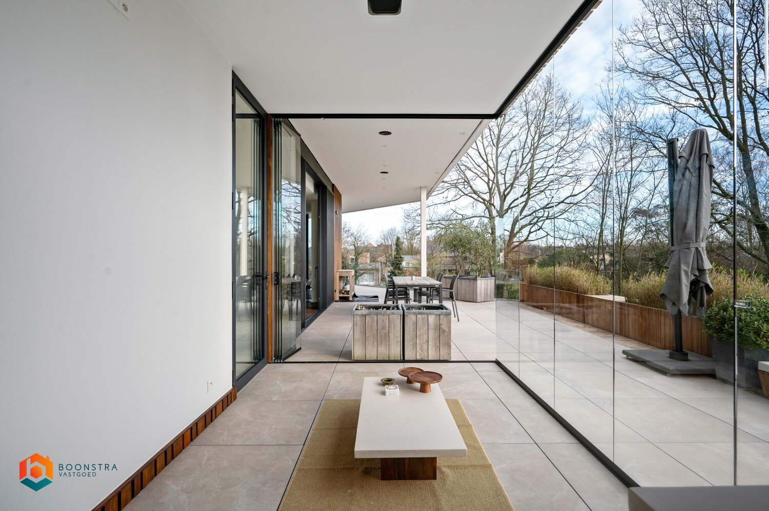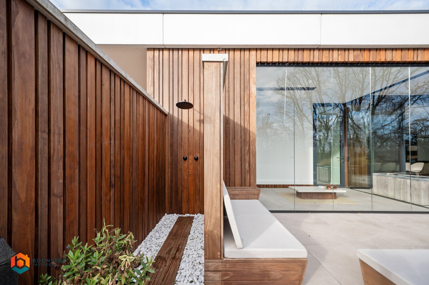 Het grote schuifraam geeft toegang tot het riante terras van 136 m², afgewerkt met een poolhouse (zonder pool). Het glas kan volledig worden opengeschoven, wat een extra ruimtelijk gevoel creëert. Bijkomend is er een buitendouche, ideaal om te verfrissen tijdens zonnige maanden. Ook een jacuzzi of sauna zou hier een uitstekende optie zijn.