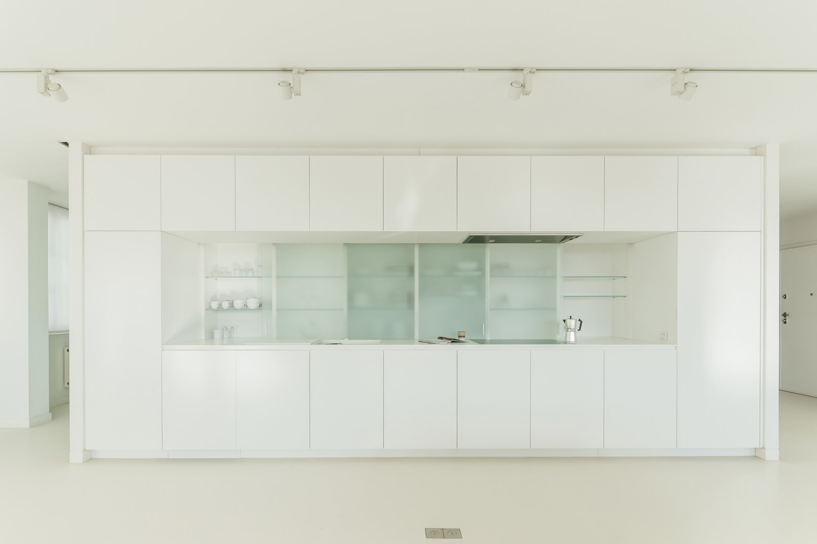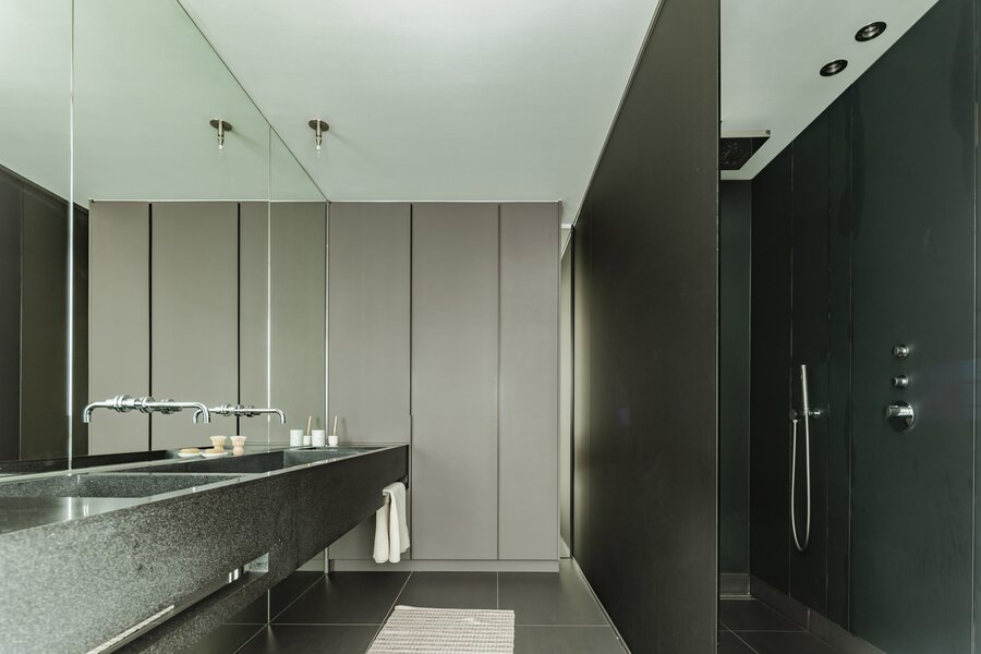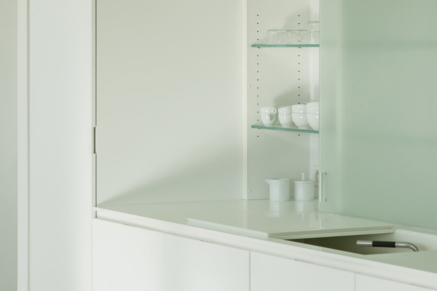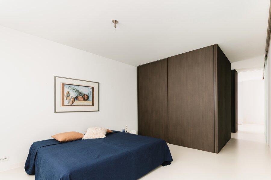Het kloppend hart van de flat is de hoge tafel: de plek voor ontbijten, werken, gesprekken en lange avonden, telkens met zicht op het water en de stad. De afwerking is minimalistisch, warm en uiterst doordacht. Strakke kastenwanden bieden overvloedige opbergruimte zonder visuele ruis, zodat alle aandacht naar het panorama en de ruimte gaat.
