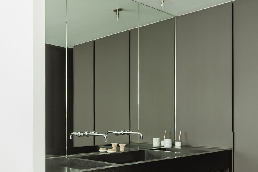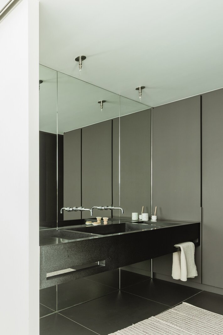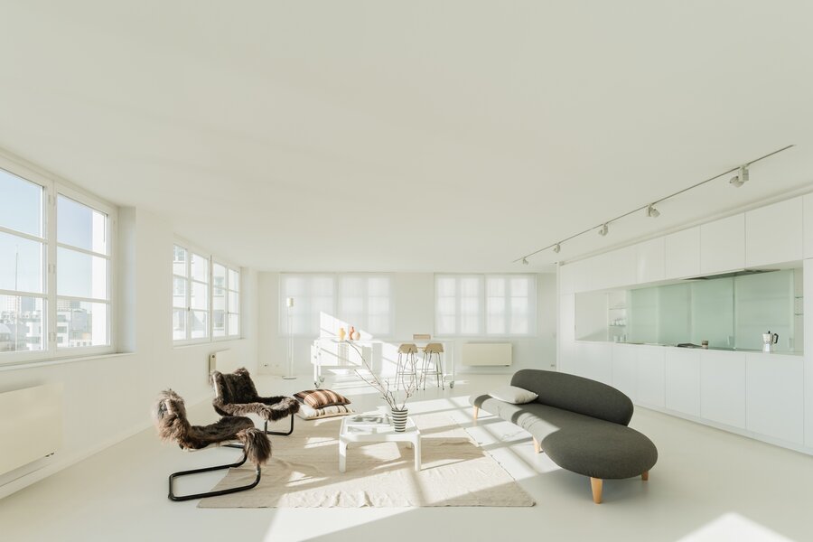 De keuken is verfijnd en discreet, met corian afdekplaten die de spoelzone volledig laten verdwijnen, zodat ze naadloos opgaat in het geheel. De inrichting is bewust gereduceerd tot wat echt telt: een centrale zithoek, een karaktervolle sofa en enkele krachtige elementen die de ruimte versterken.