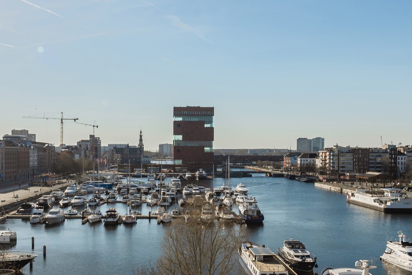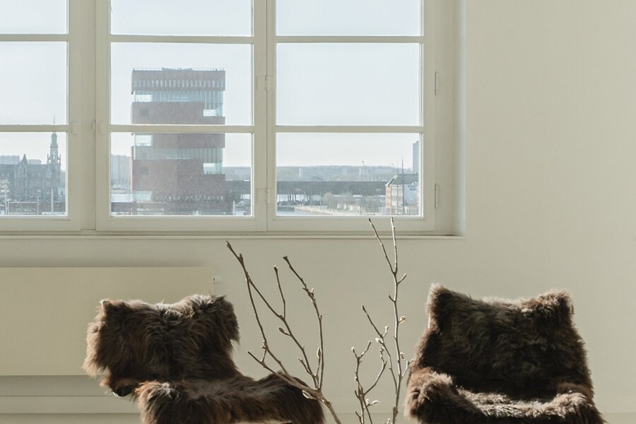 Via de ruime inkom, karaktervolle lift en elegante trappenhal bereik je de vijfde verdieping, waar het uitzicht je meteen stil krijgt. Het MAS, de Schelde met haar bedrijvigheid en de iconische Onze-Lieve-Vrouwetoren vormen samen een levend decor dat voortdurend verandert.
