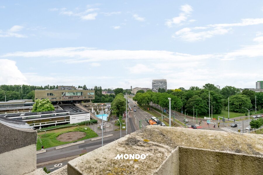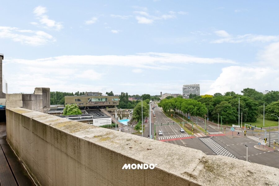 De royale leefruimte geniet van een indrukwekkende lichtinval dankzij de grote raampartijen, met een weids uitzicht over de Antwerpse skyline.