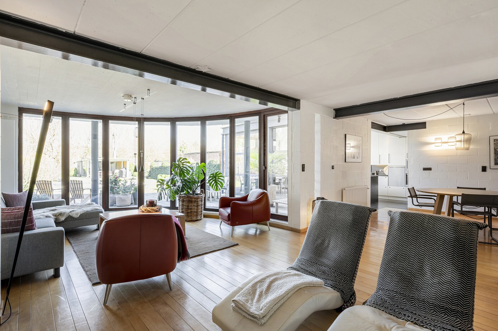 - Een zonnige open leefruimte op parket (ca. 50 m²) met grote raampartijen, bestaande uit een lichtrijke TV- en eetkamer en voorzien van een houtkachel