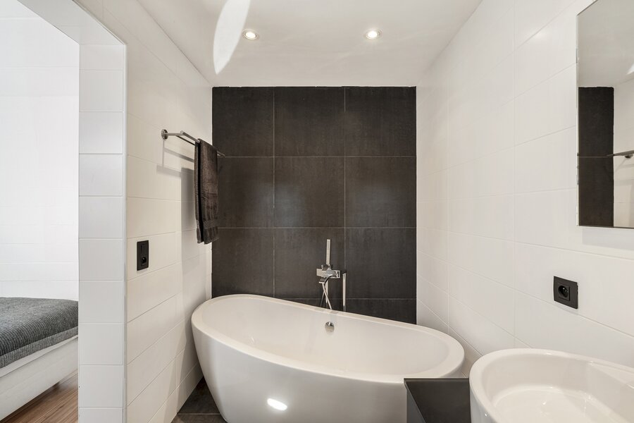 - Een hoofdslaapkamer (ca. 25 m²) met dressing en ensuite badkamer, voorzien van dubbele lavabo en ligbad