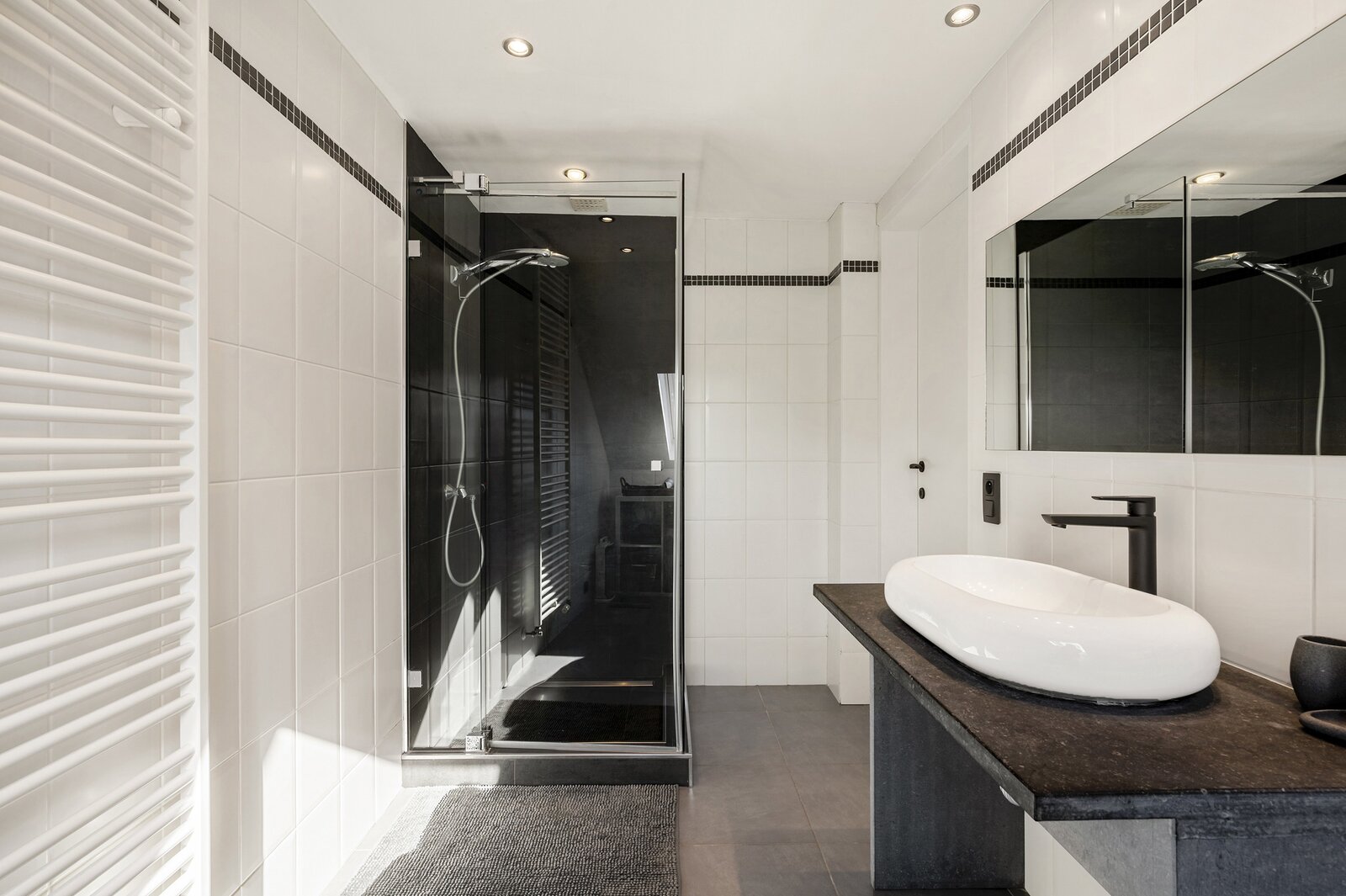 - Een badkamer op zwarte natuursteen, met douche, lavabo en toilet