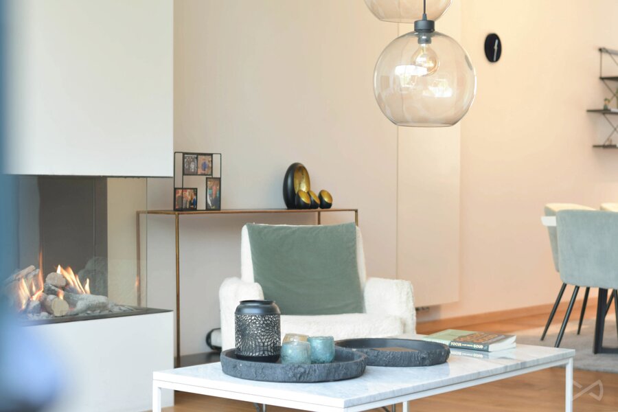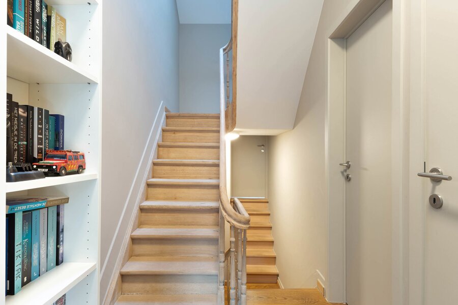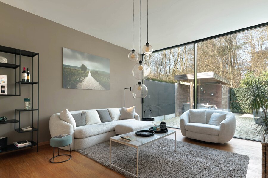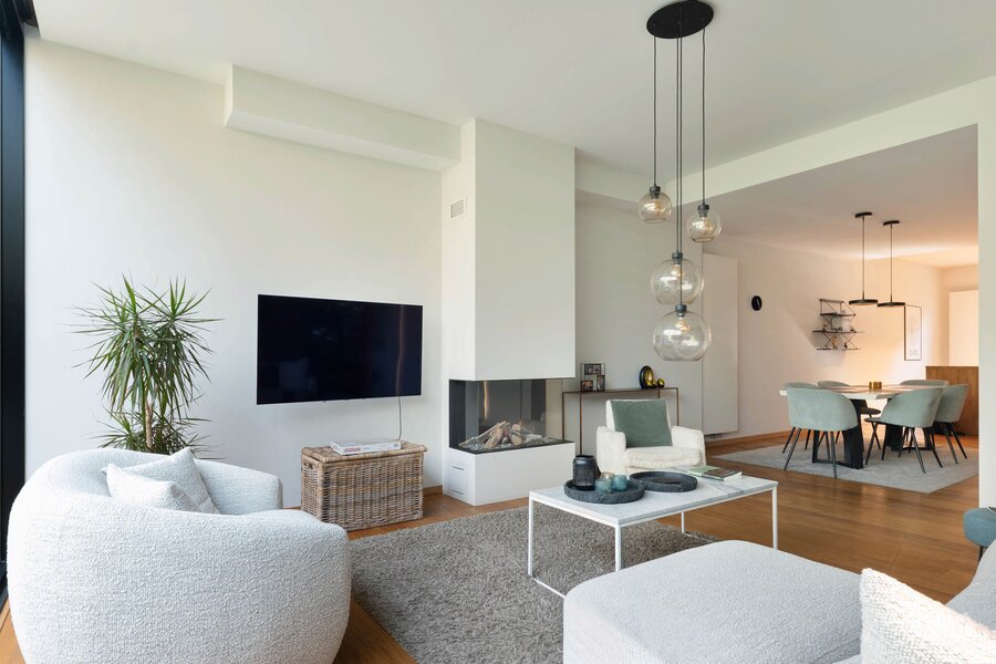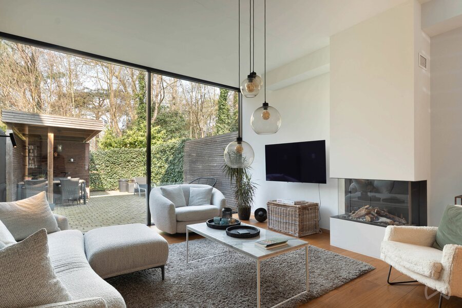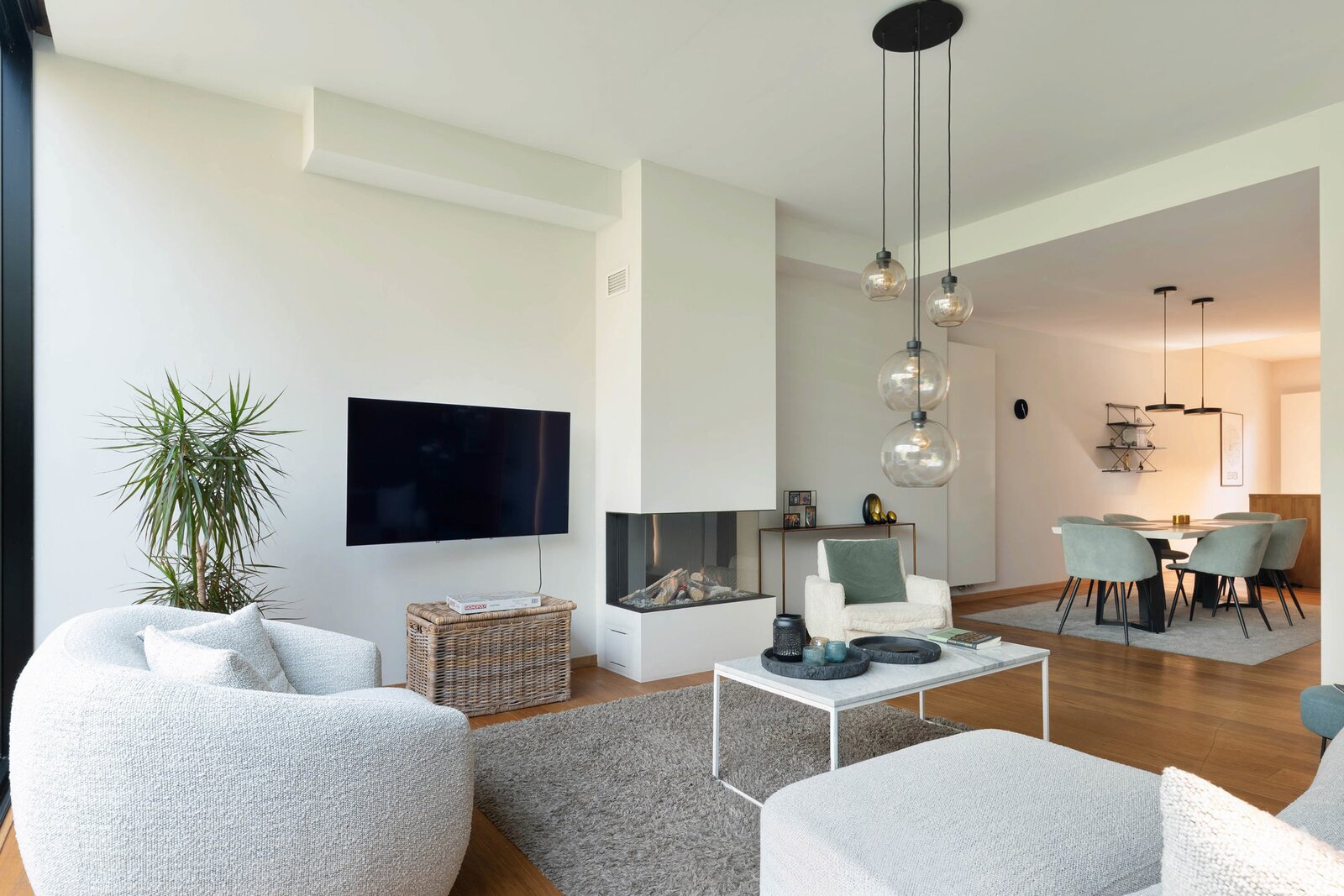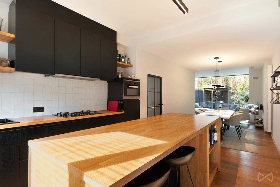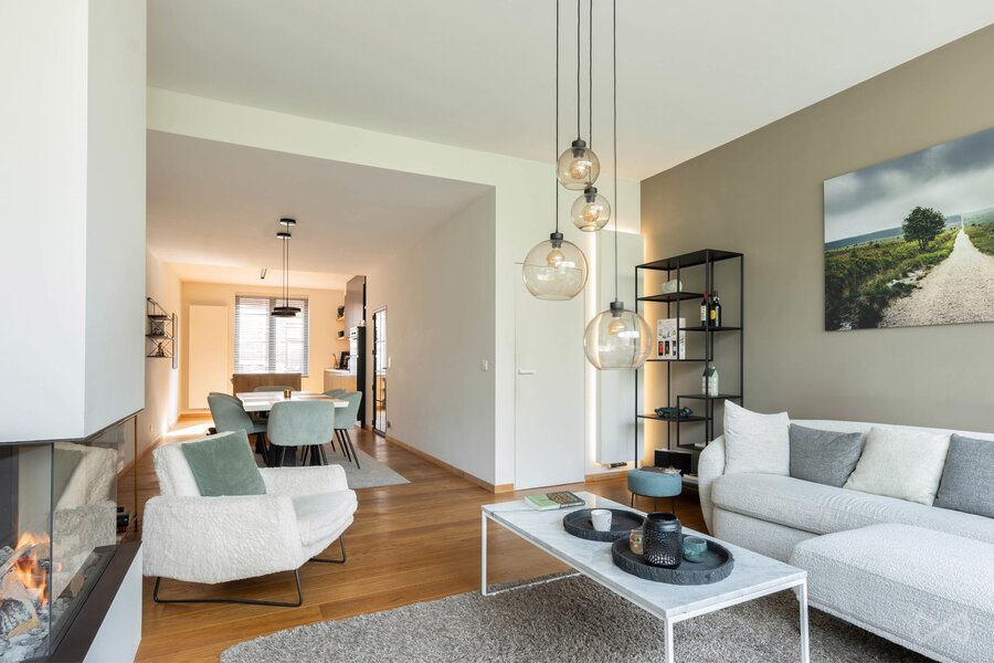 Gelijkvloers wordt u meteen verwelkomd in een lichtrijke eetkamer, keuken en living, waar binnen en buiten in elkaar overvloeien. Het grote raampartij aan de achterzijde zorgt voor een overvloed aan natuurlijk licht en creëert een directe connectie met het terras en de tuinzone.De open keuken, eetruimte en living vormen samen één harmonieus geheel. Deze ruimtes werden afgewerkt met hoogwaardige, duurzame materialen en stralen een tijdloos, doch modern karakter uit. Ideaal voor zowel dagelijks comfort als het ontvangen van gasten.