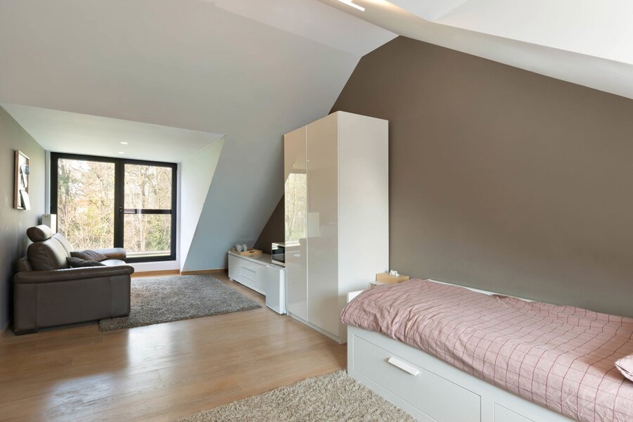 De tweede verdieping herbergt een ruime slaapkamer met aangrenzende badkamer. Dankzij de indeling en oppervlakte biedt deze verdieping tal van mogelijkheden: