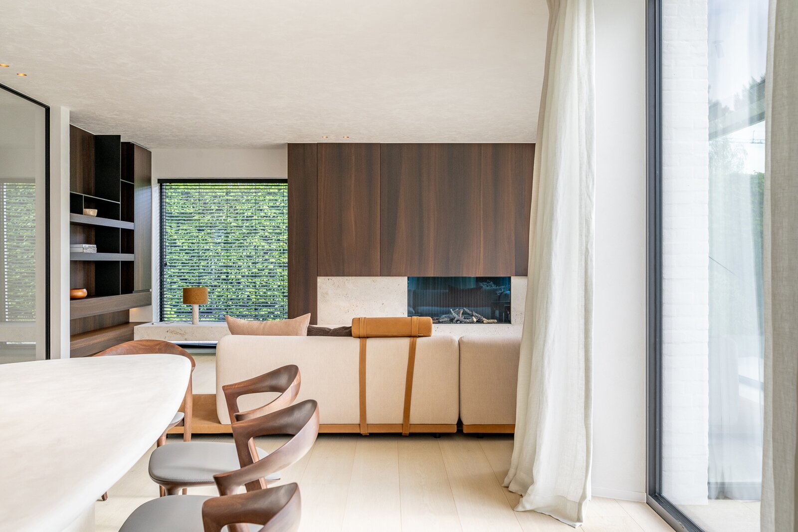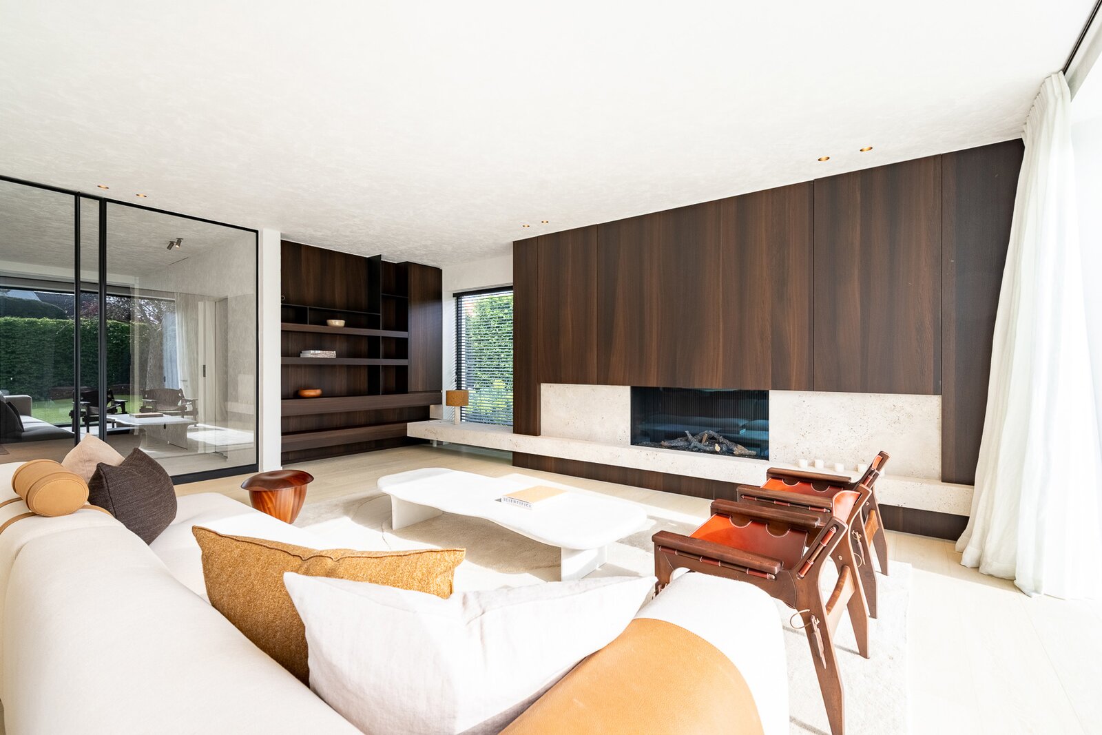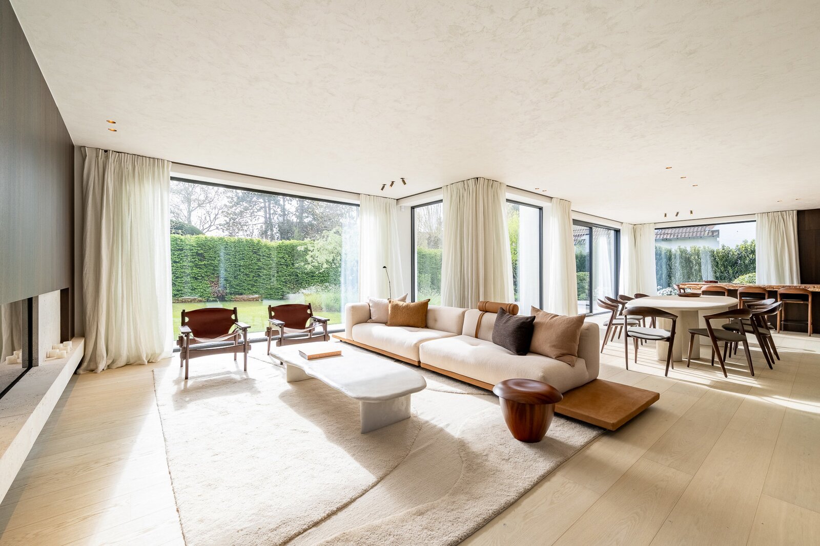 Inkomhal met vestiaire, gastentoilet en lift. Lichtrijke leefruimte met open haard, parket en maatkasten, uitgevend op de aangelegde tuin. Volledig uitgeruste open keuken met kwalitatieve toestellen, wijnkoeler en aansluitende bijkeuken/wasplaats. Garage.