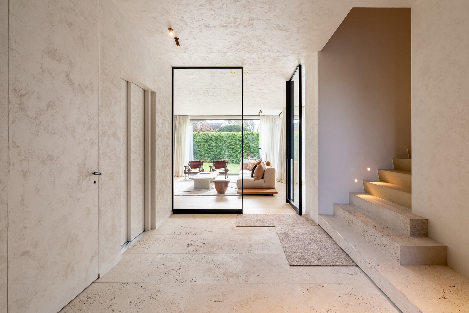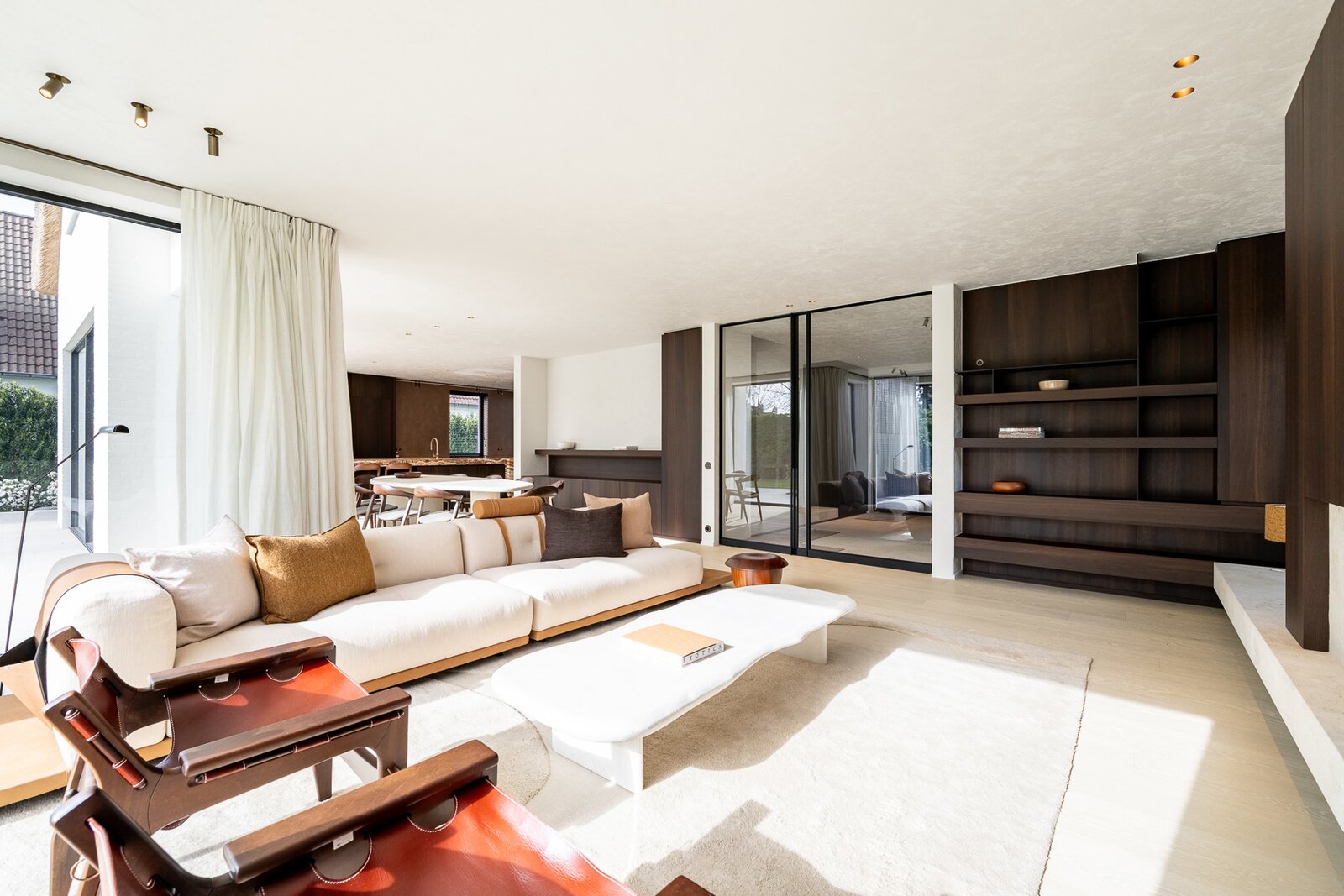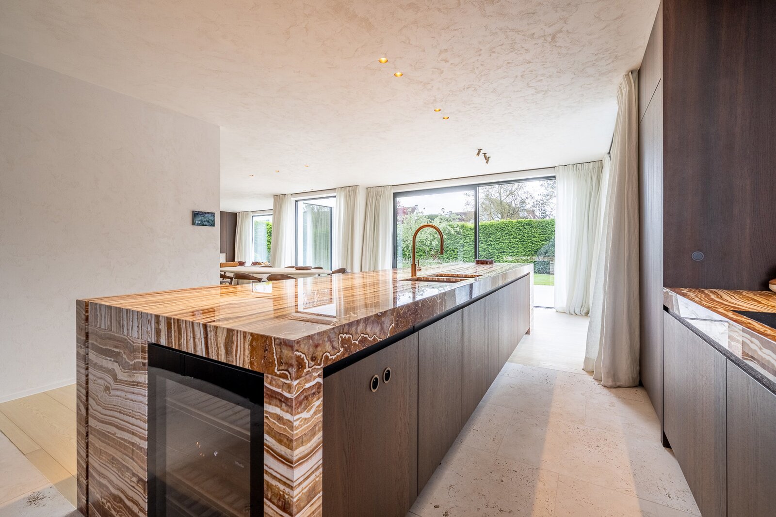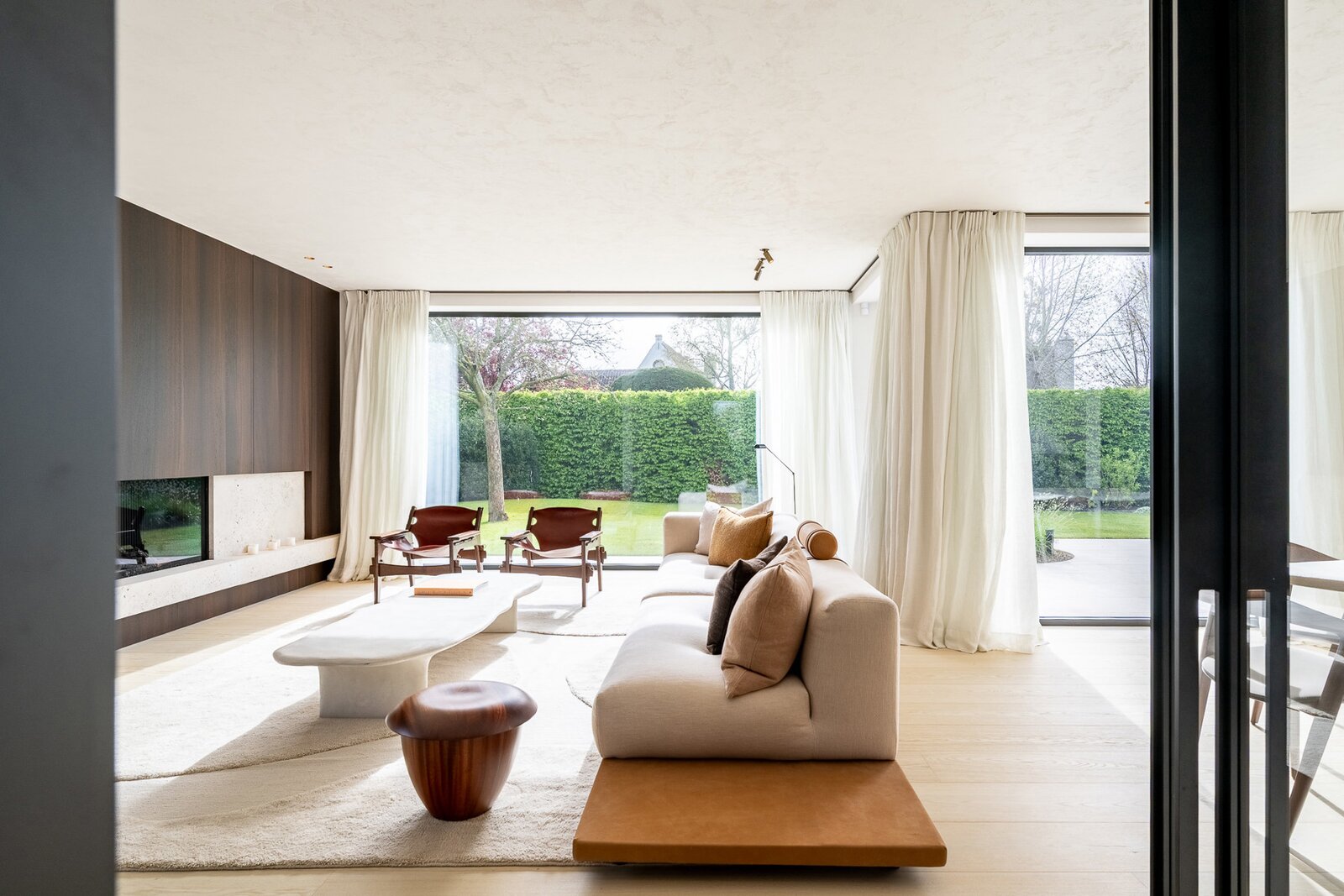 Inkomhal met vestiaire, gastentoilet en lift. Lichtrijke leefruimte met open haard, parket en maatkasten, uitgevend op de aangelegde tuin. Volledig uitgeruste open keuken met kwalitatieve toestellen, wijnkoeler en aansluitende bijkeuken/wasplaats. Garage.
