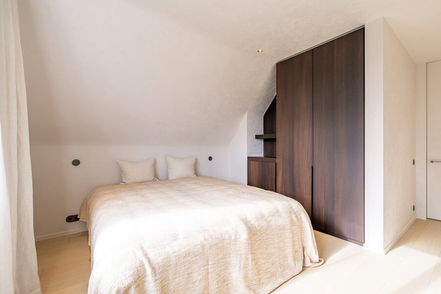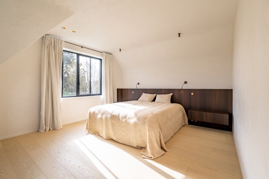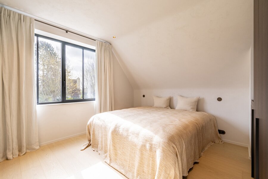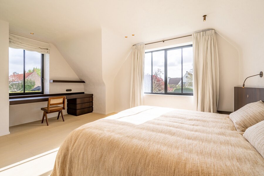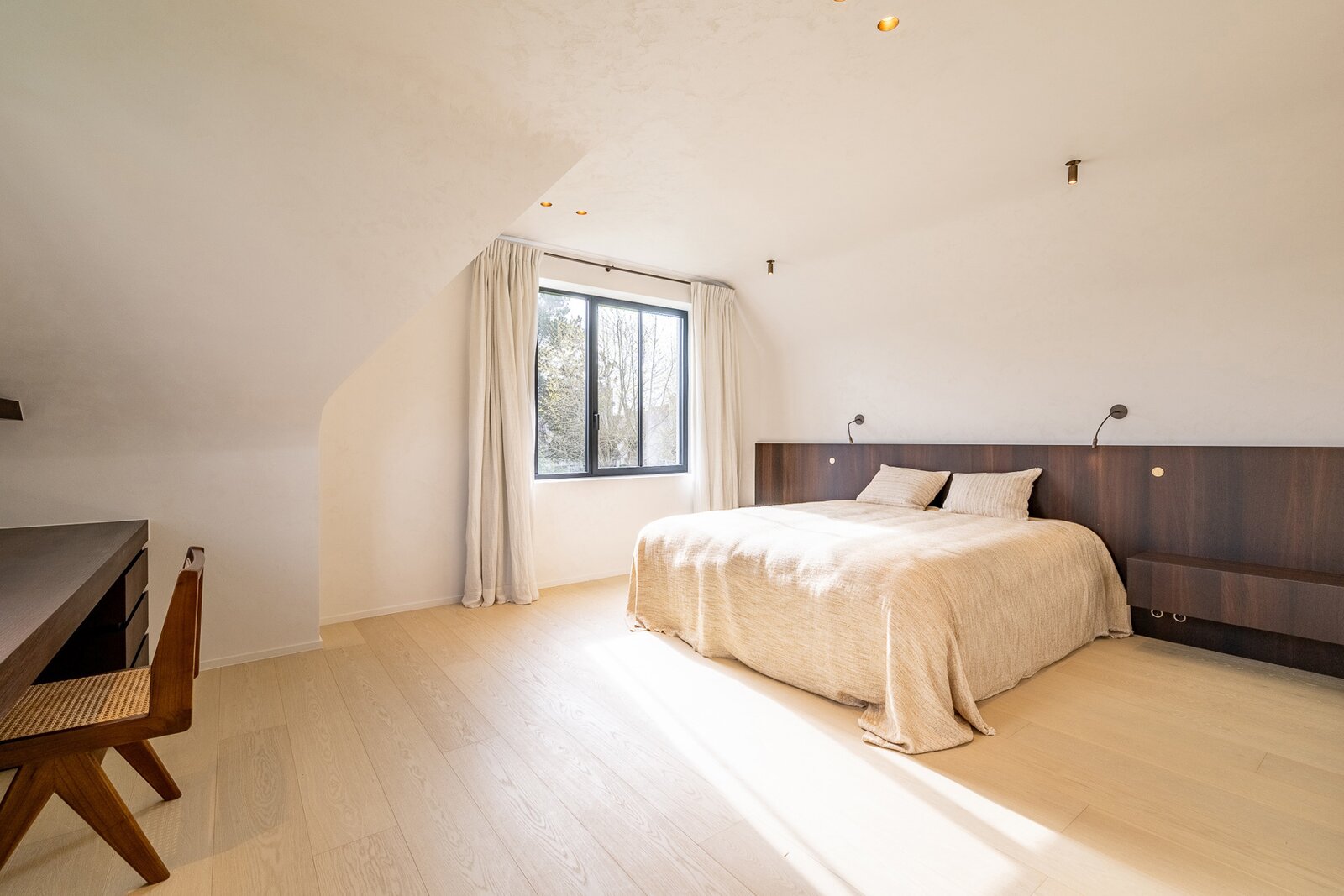 Op de verdieping vier ruime slaapkamers met ingemaakte kasten. Twee kamers met eigen badkamer, twee kamers delen een douchekamer. Zolder met extra bergruimte.