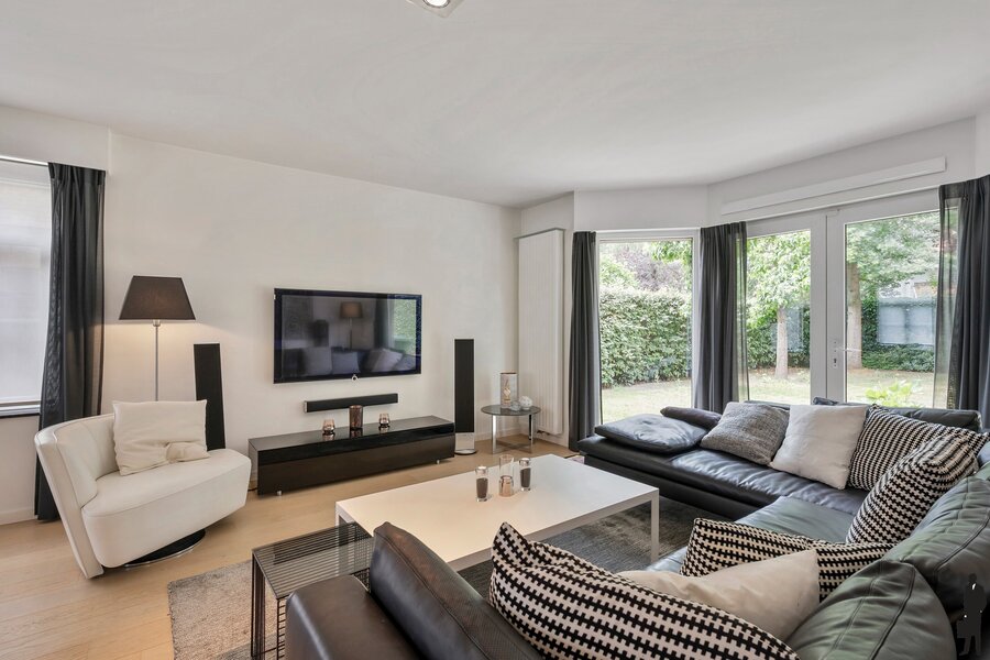 - Een woonkamer op parket, bereikbaar via een dubbele glazen deur, met royale lichtinval en directe toegang tot de tuin