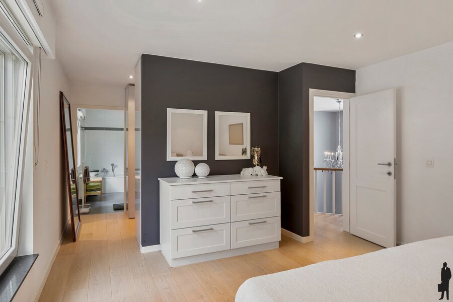 - Een royale hoofdslaapkamer met dressingruimte en ensuite badkamer met ligbad, dubbele lavabo, toilet en inloopdouche