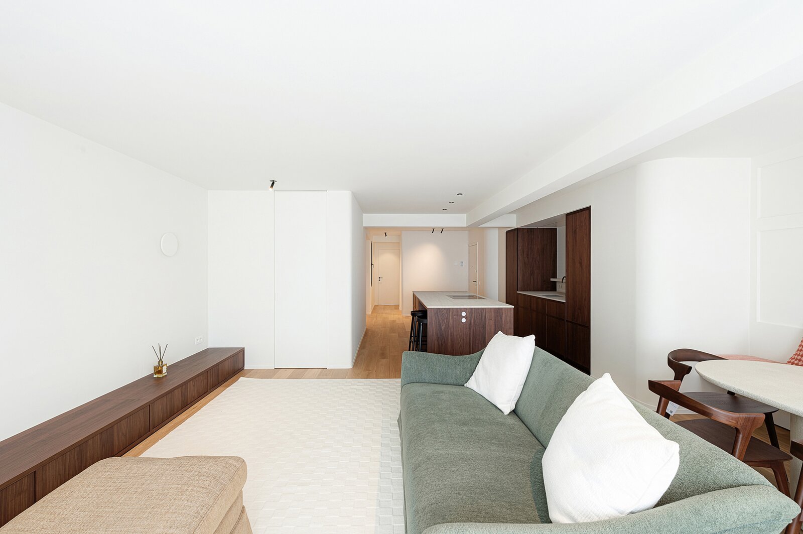 Bij het binnenkomen leidt de inkomhal naar een brede en lichtrijke leefruimte, die zich onderscheidt door haar aangename proporties en open karakter. De zithoek en eetruimte sluiten naadloos op elkaar aan en creëren een elegante en uitnodigende leefomgeving.