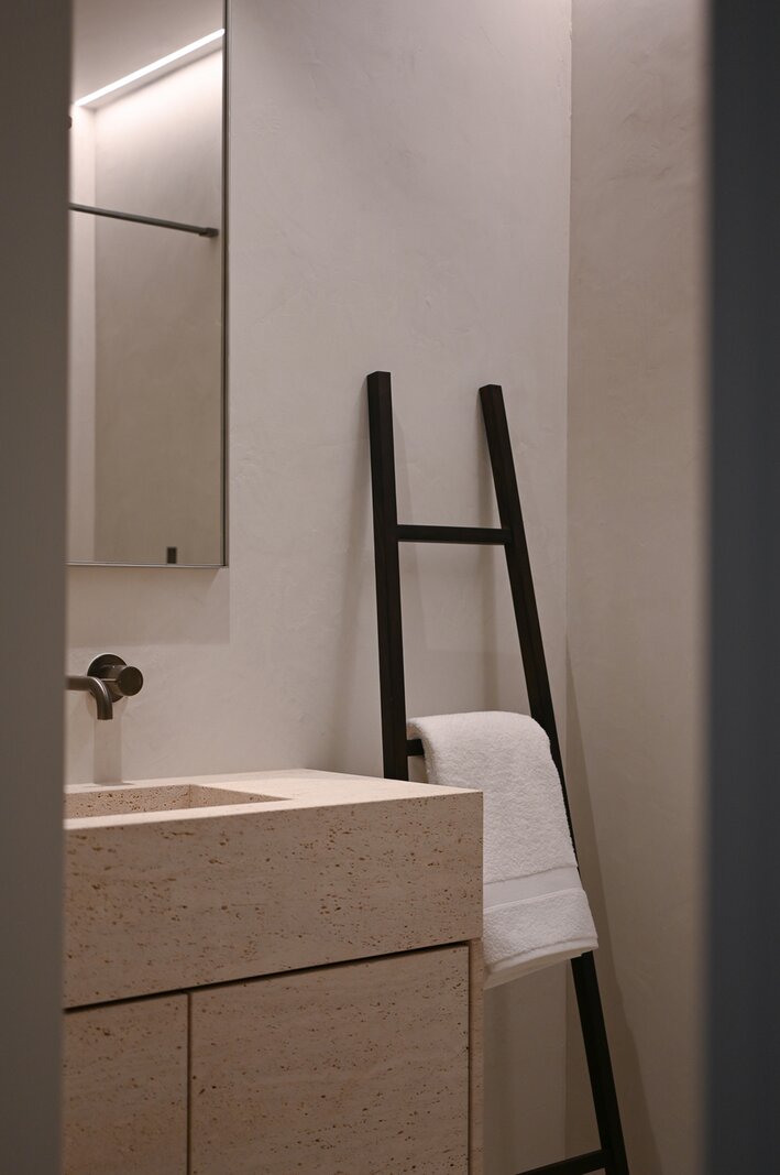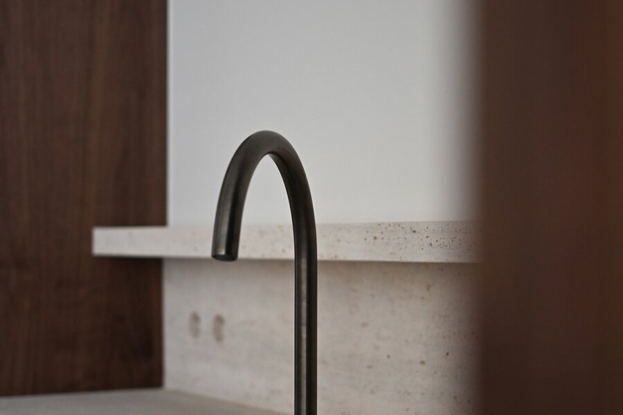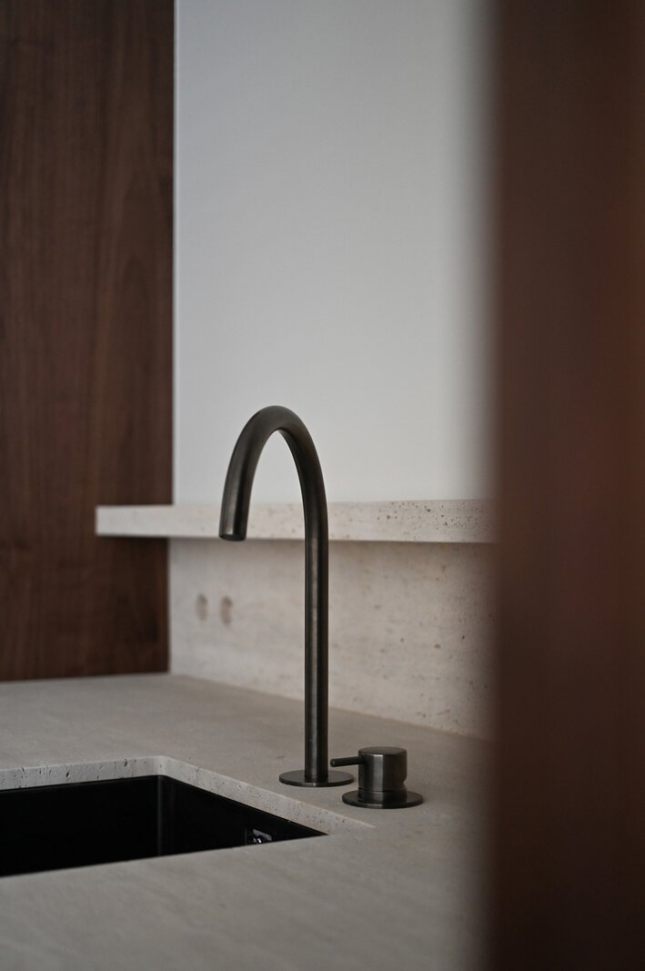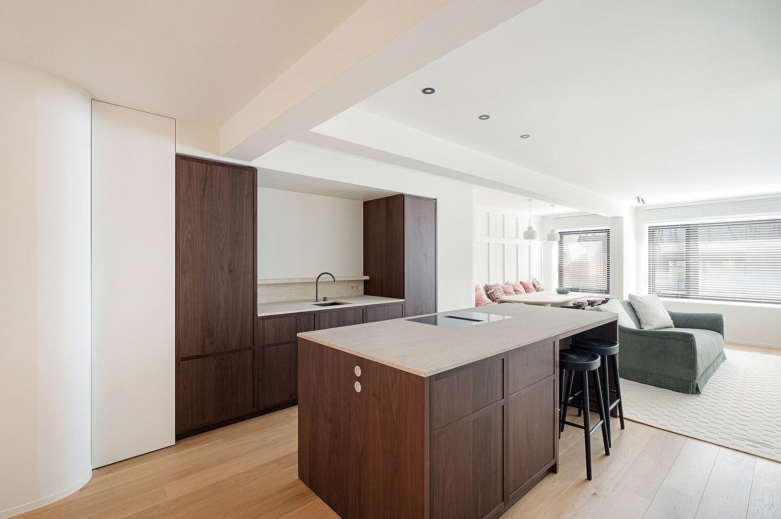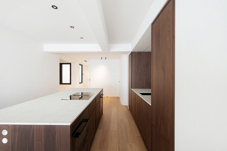 De open keuken vormt een centraal element in het geheel en werd afgewerkt met hoogwaardige materialen. Het werkblad in travertin natuursteen, de maatkasten in fineer en de geïntegreerde Miele-toestellen zorgen voor een uitgebalanceerde combinatie van esthetiek en functionaliteit.