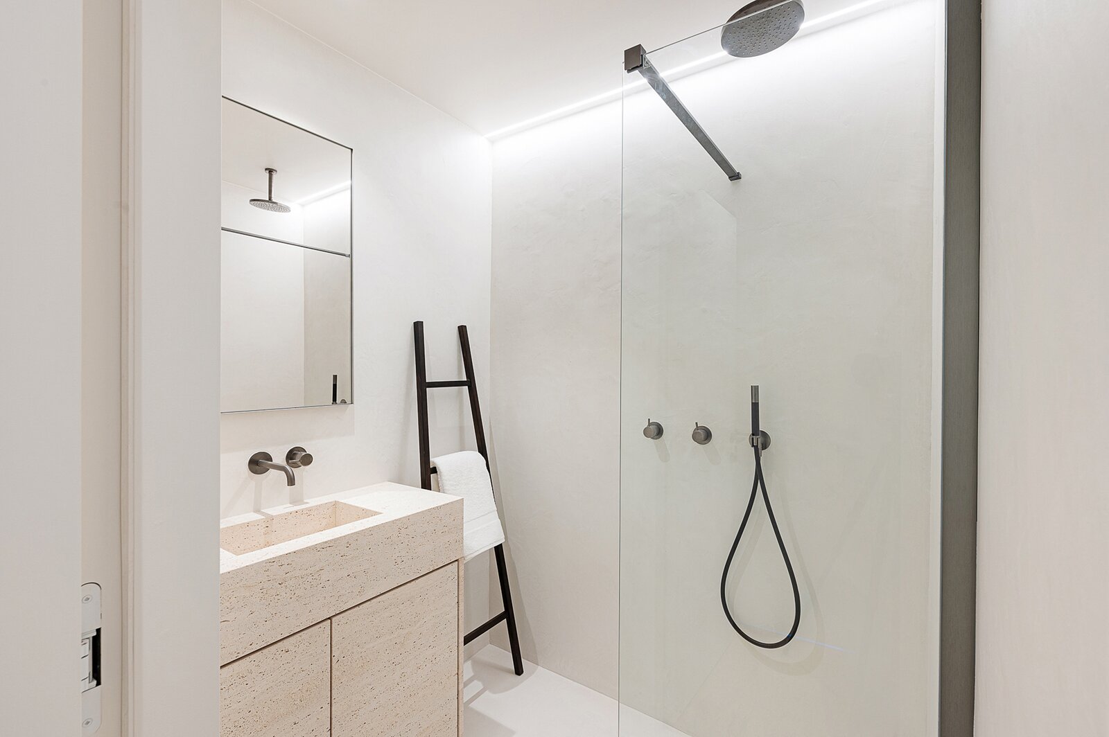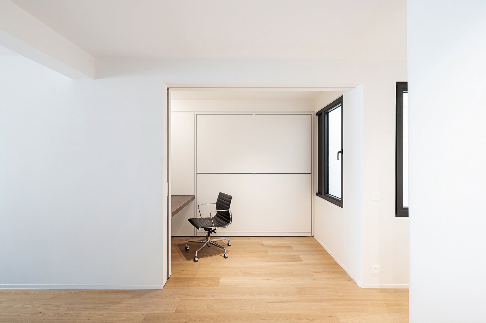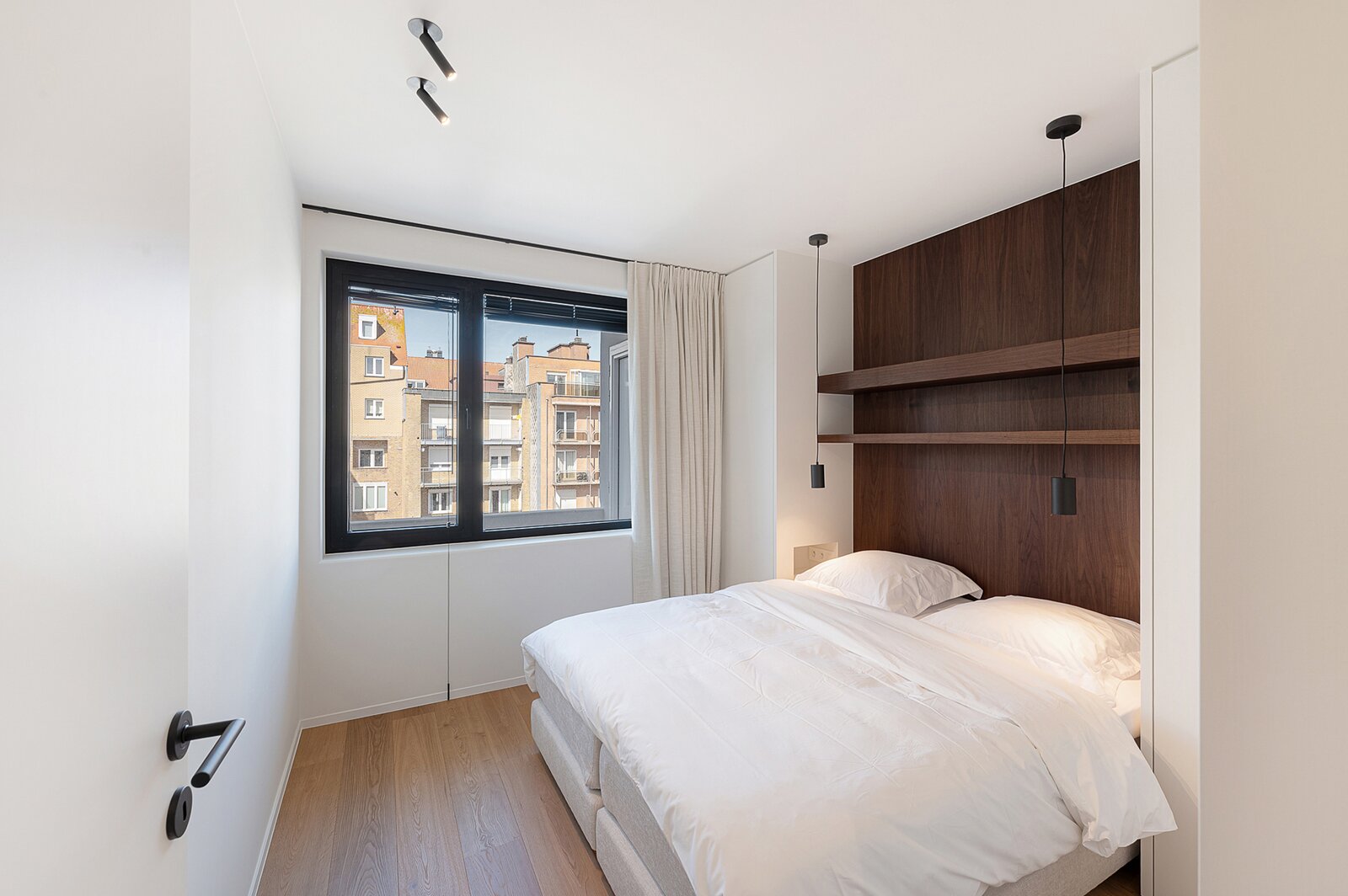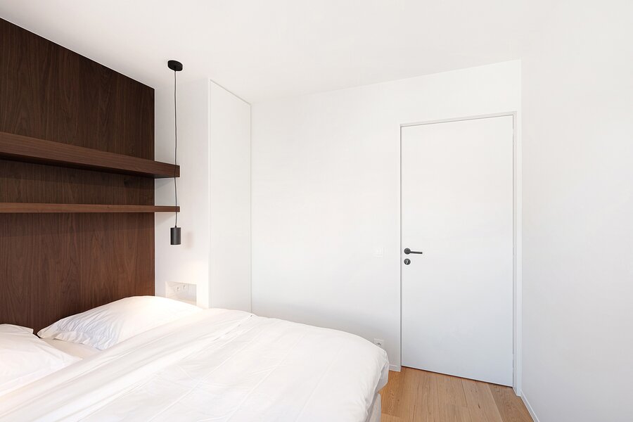 Het appartement beschikt over twee volwaardige slaapkamers, elk voorzien van ingemaakte kasten en een eigen en-suite douchekamer, afgewerkt in Mortex. Een derde kamer biedt bijkomende flexibiliteit en kan dienst doen als bureau of extra slaapruimte, dankzij het discreet geïntegreerde uitklapbare stapelbed.