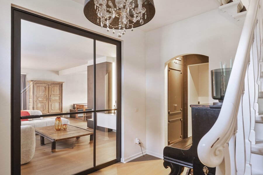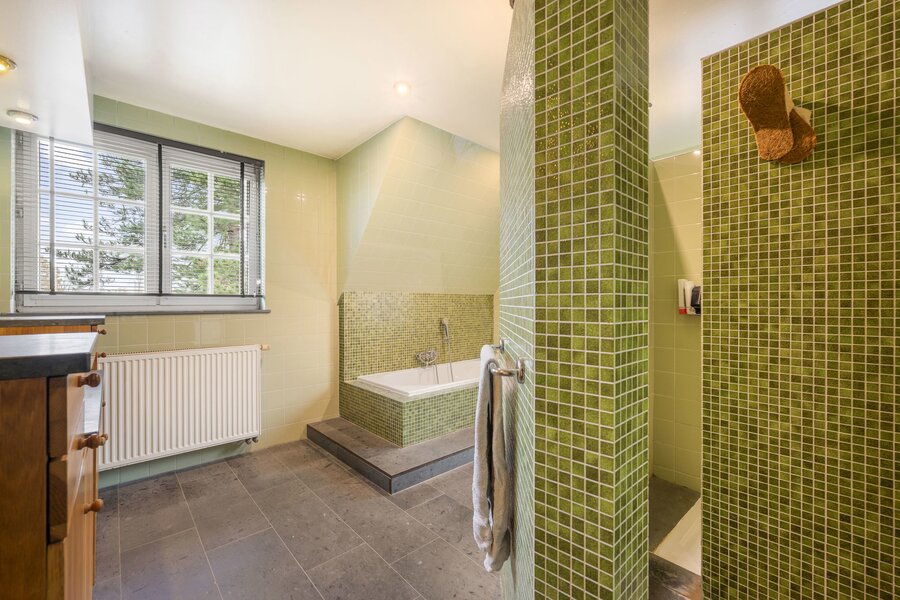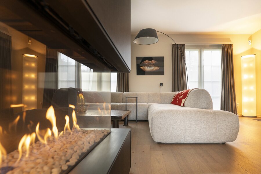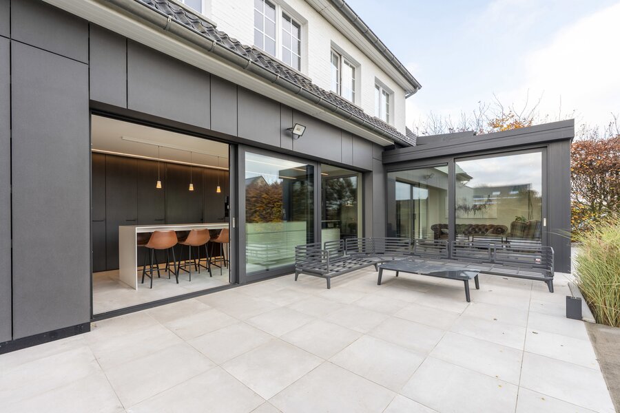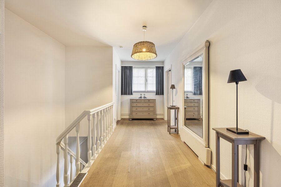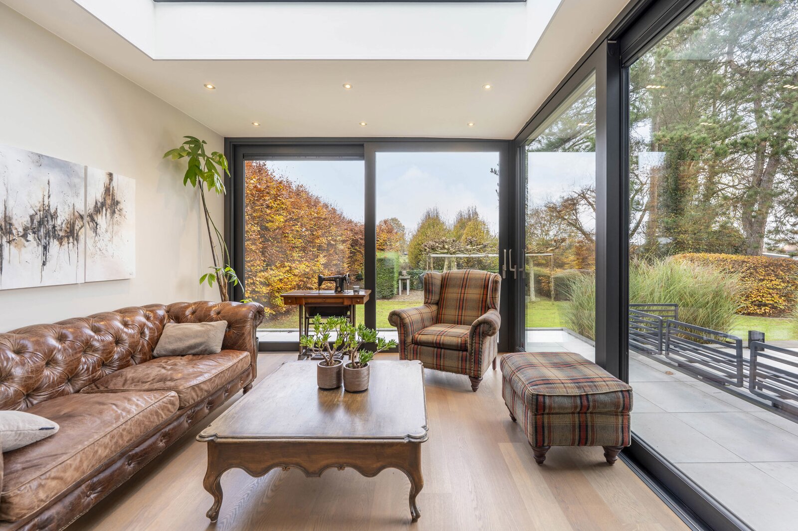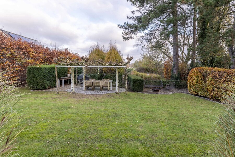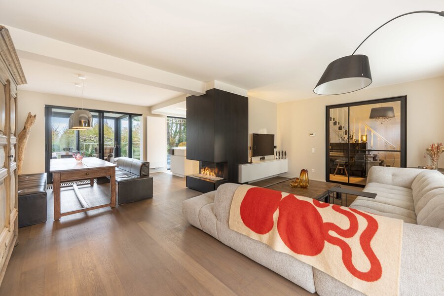 Bij binnenkomst word je verwelkomd in een ruime inkomhal met gastentoilet. Het gezellige salon met sfeervolle gashaard nodigt uit tot ontspannen avonden. De royale leefkeuken is een echte eyecatcher: uitgerust met een uitgebreid gamma van de nieuwste toestellen, waaronder een oven, stoomoven, ingebouwde koffiemachine, warmhoudlade en vacuümlade. Het stijlvolle kookeiland en het prachtige uitzicht op de tuin maken koken hier een waar genot. Via de grote ramen geniet je van veel lichtinval en directe toegang tot het ruime terras – ideaal voor buiten dineren. De lichte veranda vormt een heerlijke plek om elk seizoen van de tuin te genieten.
