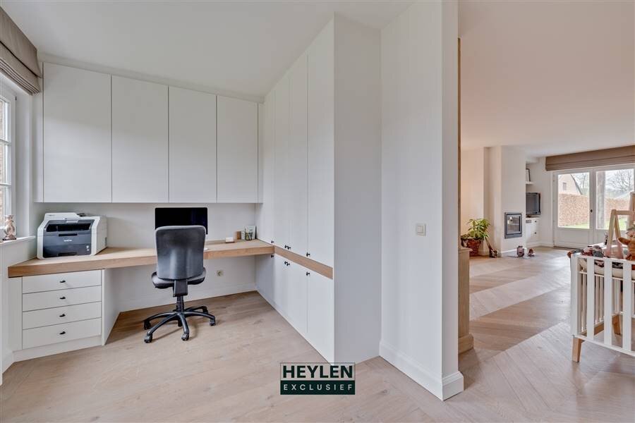 Via de ruime inkomhal heeft u toegang tot het gastentoilet en betreedt u de gezellige leefruimte, afgewerkt met stijlvolle materialen en voorzien van parketvloeren doorheen de volledige woning. Aansluitend bevindt zich een bureauruimte, ideaal voor thuiswerk of hobbyruimte.